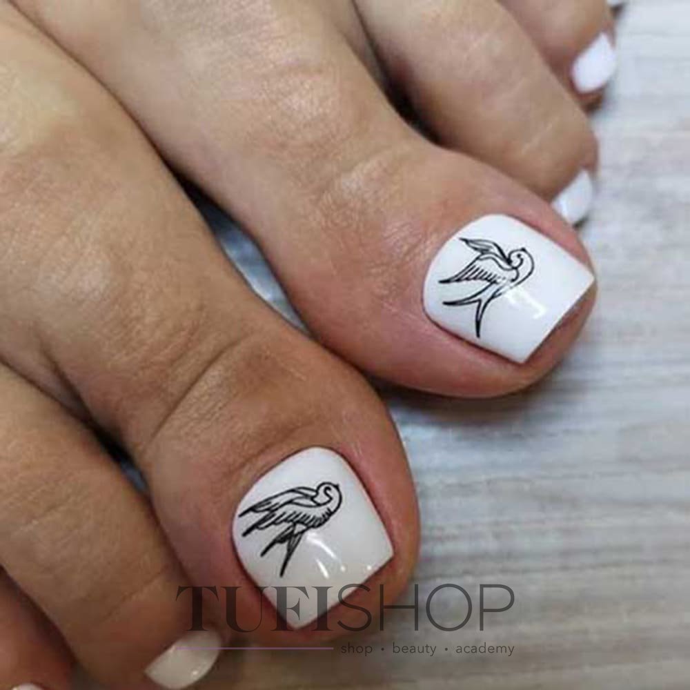 Зачастую наклейки встречаются в маникюре. Но летом 2026 года вы можете попросить мастера дать волю воображению и сделать перевод наклейки на ногти на ногах. Это действительно украсит ваш летний образ, сделает педикюр неповторимым и максимально интересным. Не стоит переживать, что вы не будете поняты со стороны. Ведь главное, чтобы нравилось именно вам, а не соседке Зине.