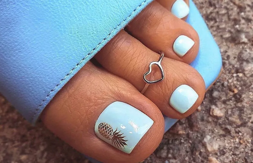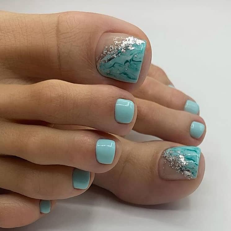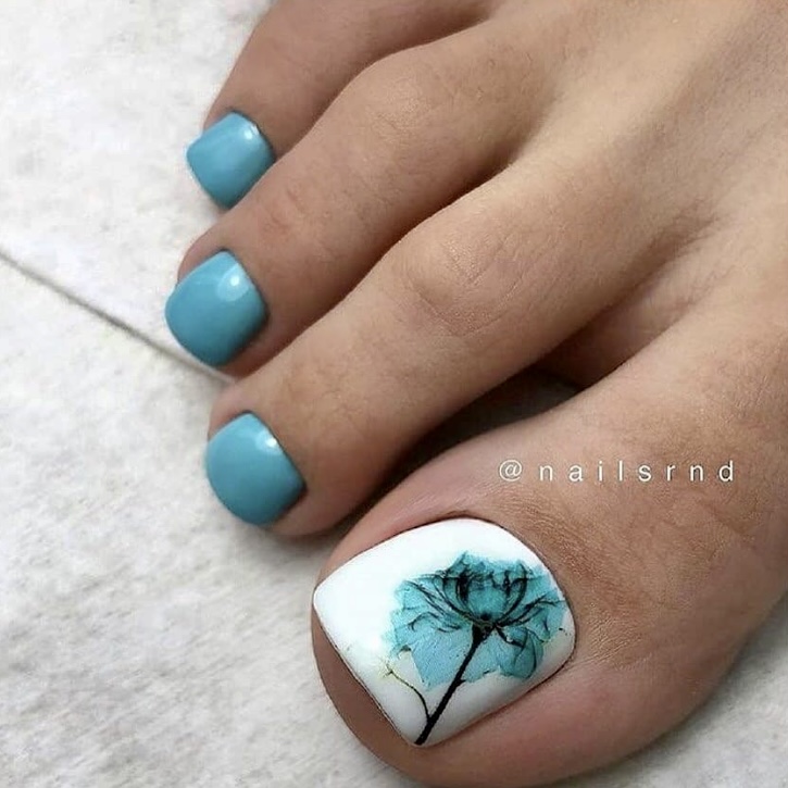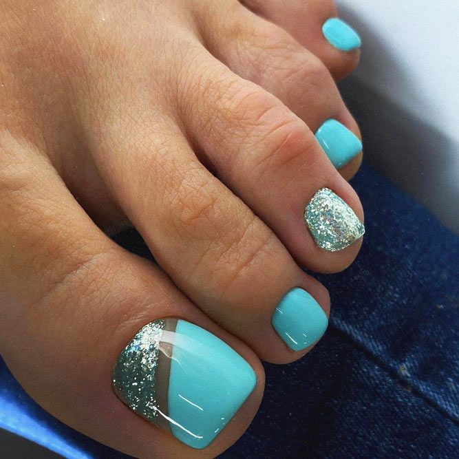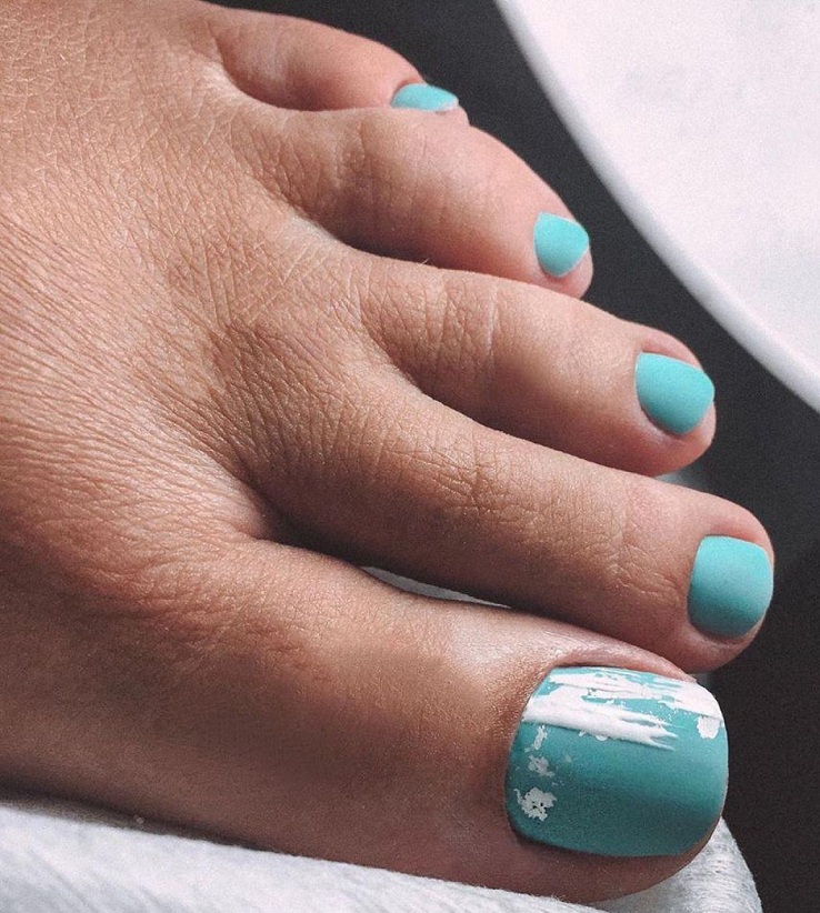 Оригинальное решение. Такой цвет преимущественно присутствует на ногтях, на которых сделан нейл-арт. В чистом виде на ногте практически сложно встретить. Единственным исключением становятся барышни, которые делают педикюр на основе голубого цвета и едут на море. Тогда в ход идут самые смелые решения, ведь отпуск для этого и предназначен.