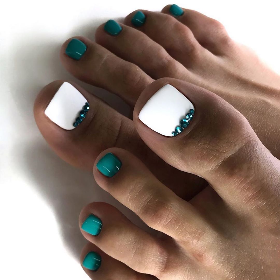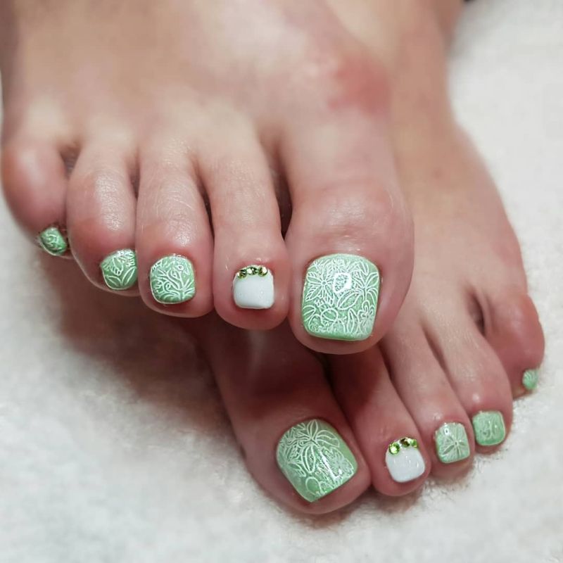 Зеленый не первый год занимает топовые места среди оттенков, которые популярны в маникюре. Теперь пришло время добраться и до педикюра. Оказывается, выбрать можно из многочисленного количества зеленого цвета: начинаем от ярко-зеленого и заканчиваем изумрудным и глубоким тоном. Вписать подобный оттенок в привычный и повседневный образ просто, особенно, если вы отдаете предпочтение классическому цвету. Можно также сочетать с многочисленными иными тонами, разбавляя их, делая рисунки, используя зеленый тон в виде глиттера и прочее.