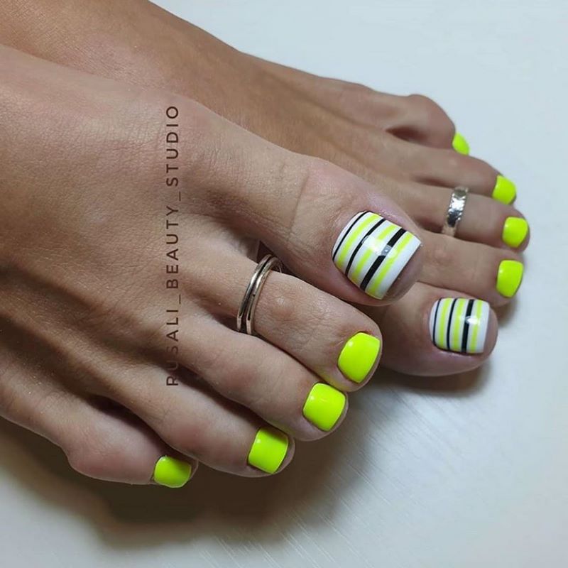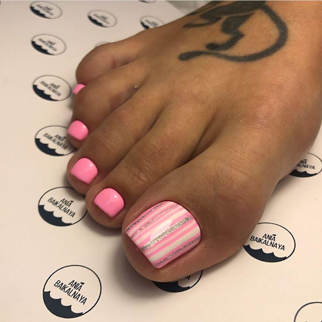 Полоски в педикюре могут быть вертикальные, горизонтальные, под наклоном. Здесь выбор за вами, а мастер сможет нарисовать то, что вы действительно хотите. Цветовая гамма также различна и зависит от события, куда вы идете или от личного желания выделяться или остаться в тени.