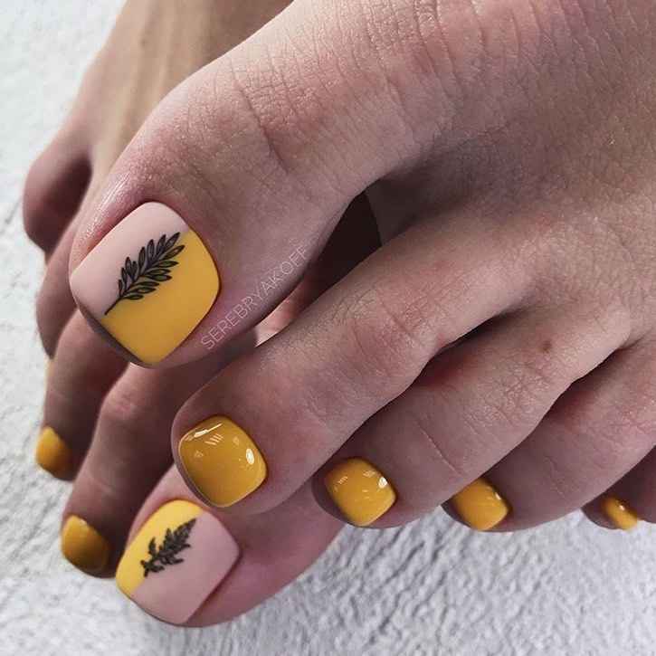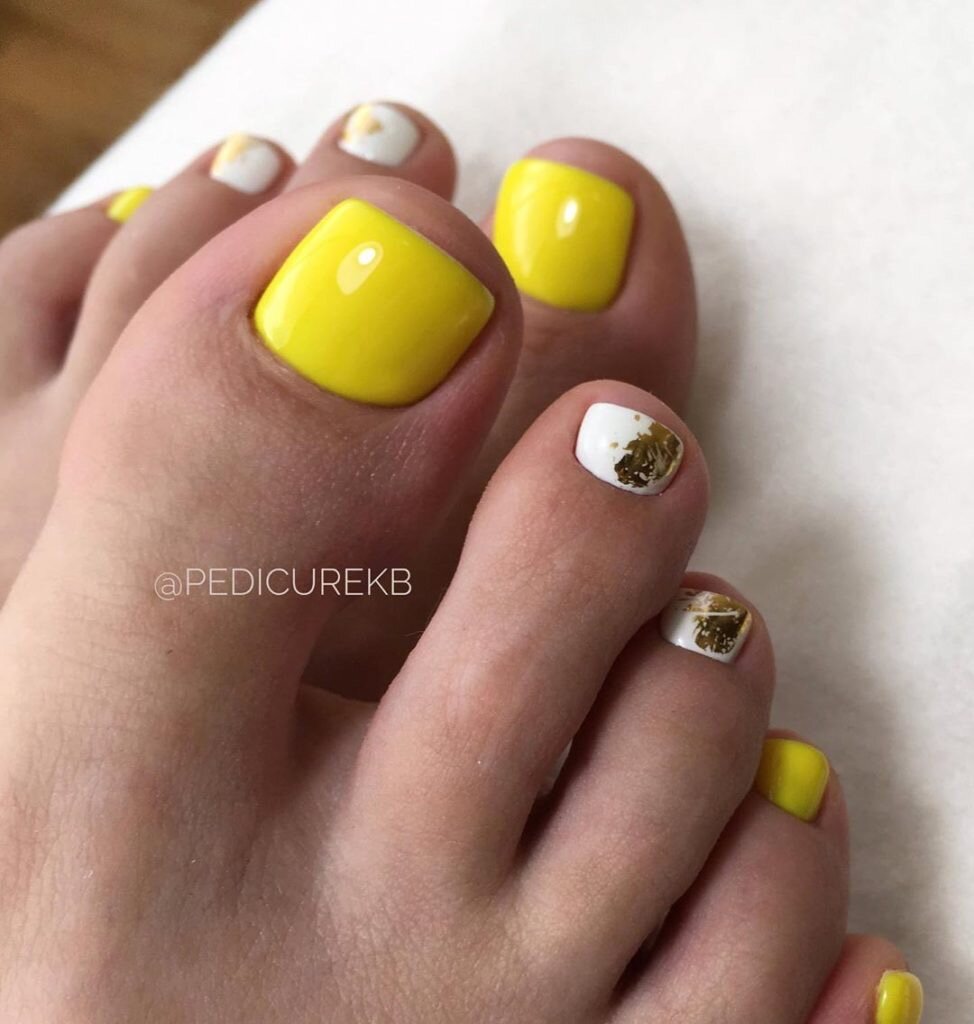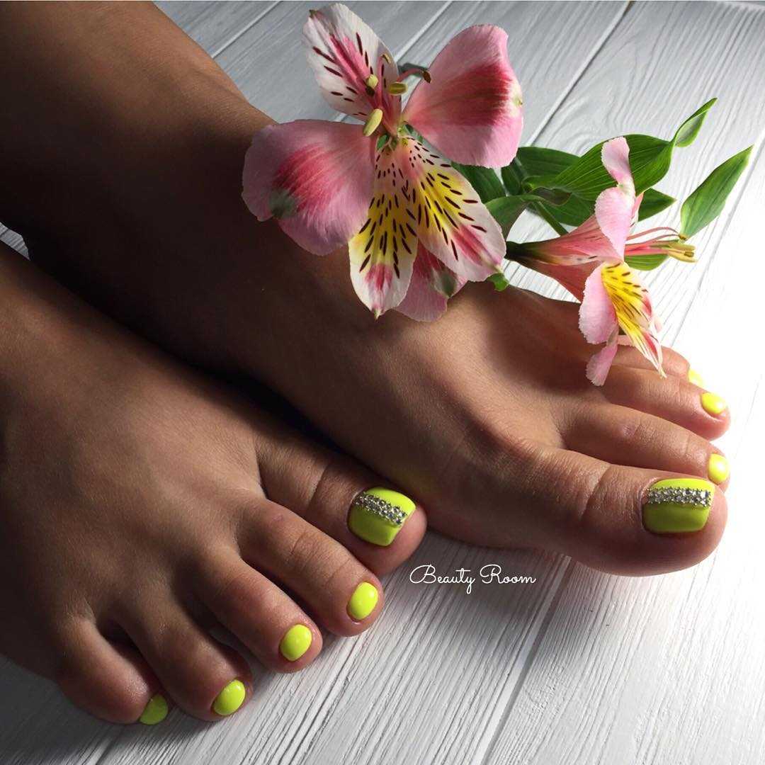 Один из оттенков оранжевого. Смело и очень броско. Только яркие по своей природе девушки могут «носить» такой педикюр и правильно его сочетать со своими образами. Здесь также сложно вписать желтый педикюр в классику, особенно, если вы работаете в офисе. Лучше сделать акцент на нейл-арте с использованием желтых оттенков или остановиться на приглушенном желтом цвете. Так вам действительно будет удобно носить его.