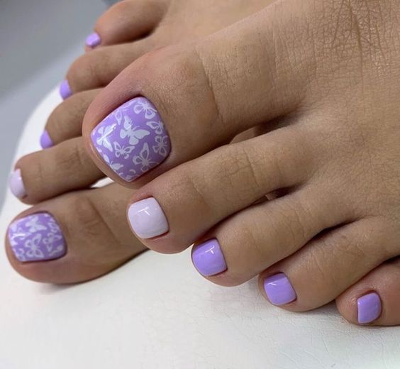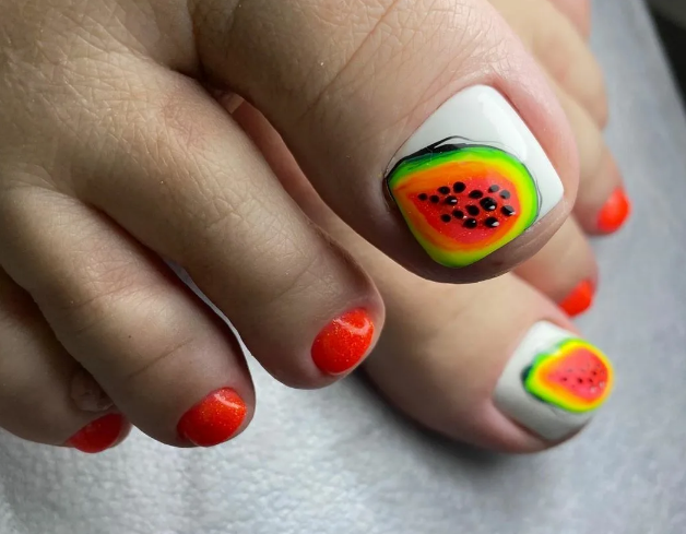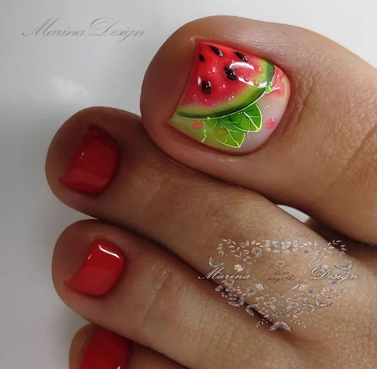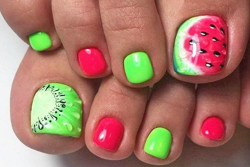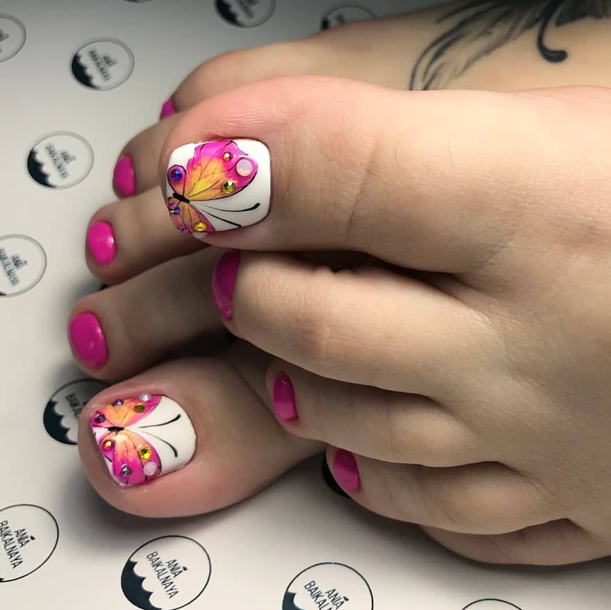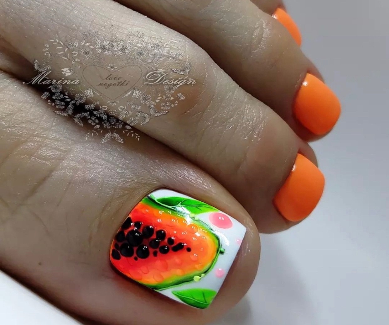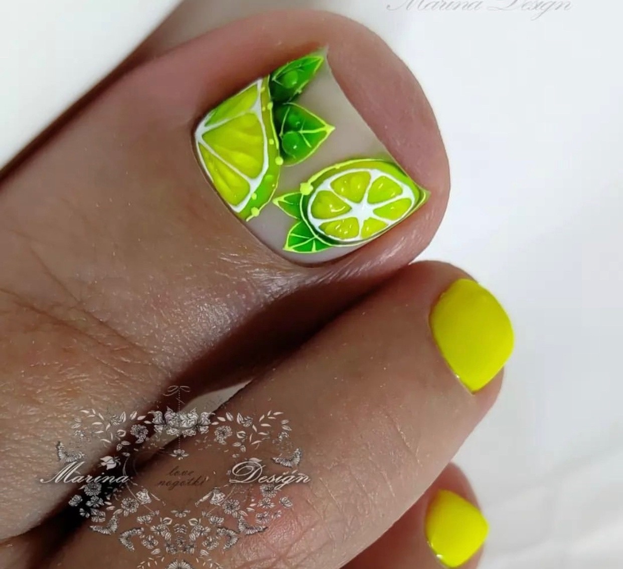 Уже не первый сезон очень актуален как маникюр, так и педикюр с рисунками. Мы выделили цветочный педикюр, но там речь скорее шла о слайдерах и stamping. А сейчас поговорим о педикюре с тематическими рисунками. Для каждого сезона тематика своя. Например, летом лучше сделать педикюр с фруктами, зимой подойдет новогодняя тематика или снежинки. Осенью можно обратить внимание на дождик и зонтики, а вот весной рисуйте бабочек и красивых насекомых, которые появляются с первыми теплыми днями.