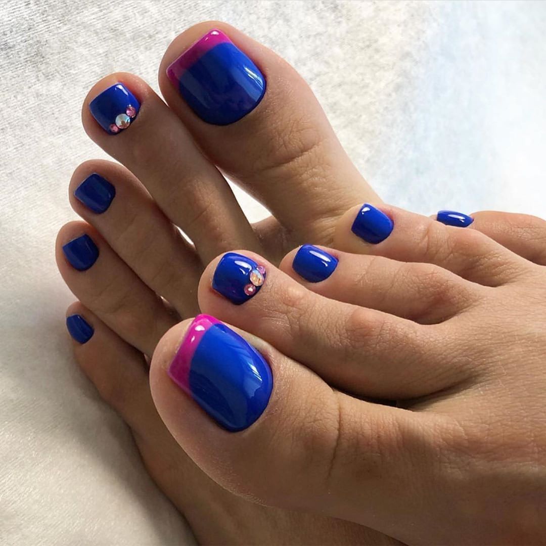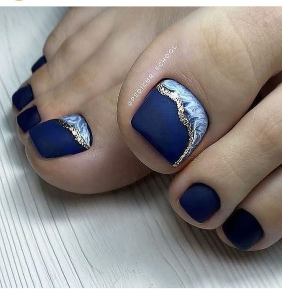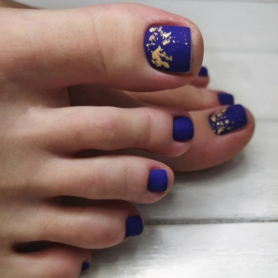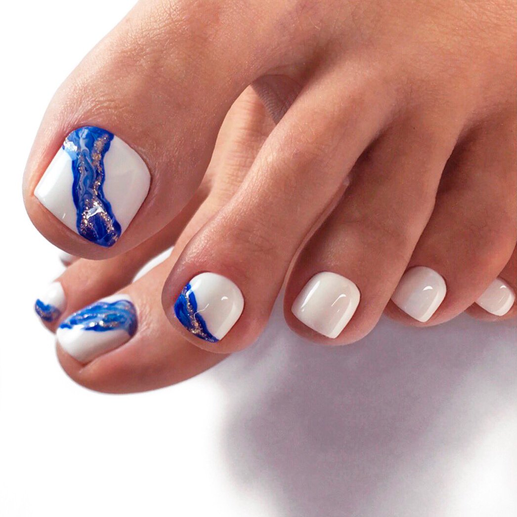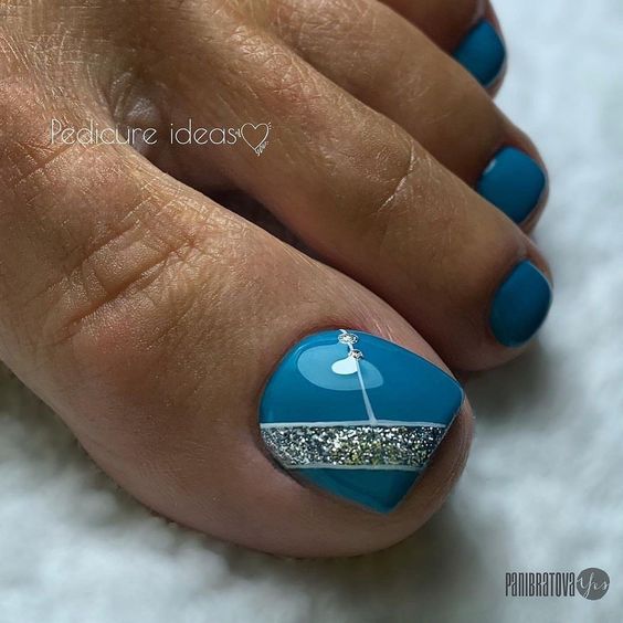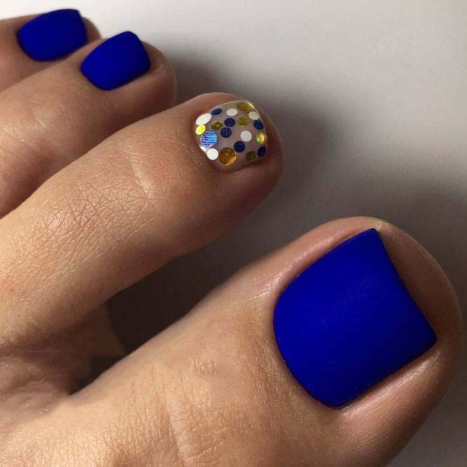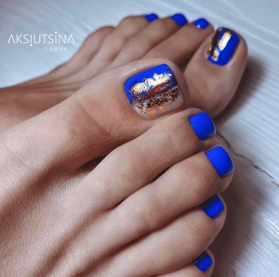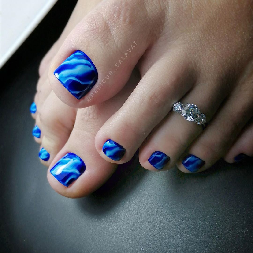 Синяя палитра очень разнообразна, а это значит, что вы сможете сделать яркий педикюр, используя один из популярных оттенков. Трендовым оттенком в этом сезоне считается кобальт. Он очень хорош в однотонном исполнении. Важно, какое покрытие вы выберете — глянцевое или матовое. Кобальт прекрасно сочетается с другими оттенками. Теплое время года, отличную пару он составит с белым, серебряным или золотым.