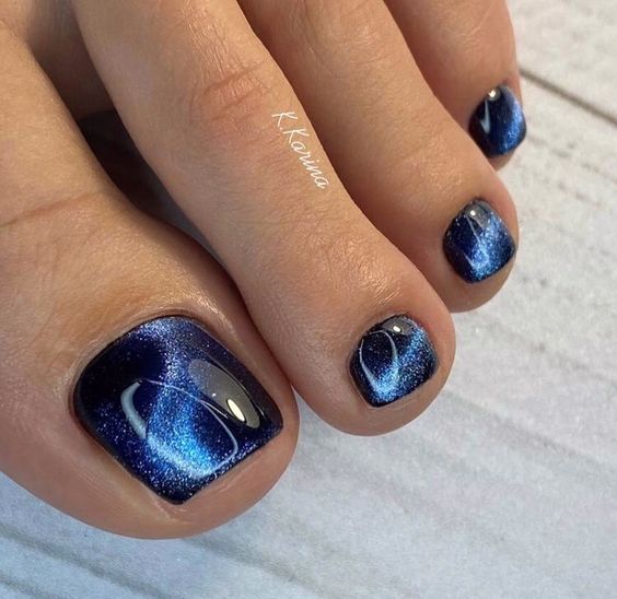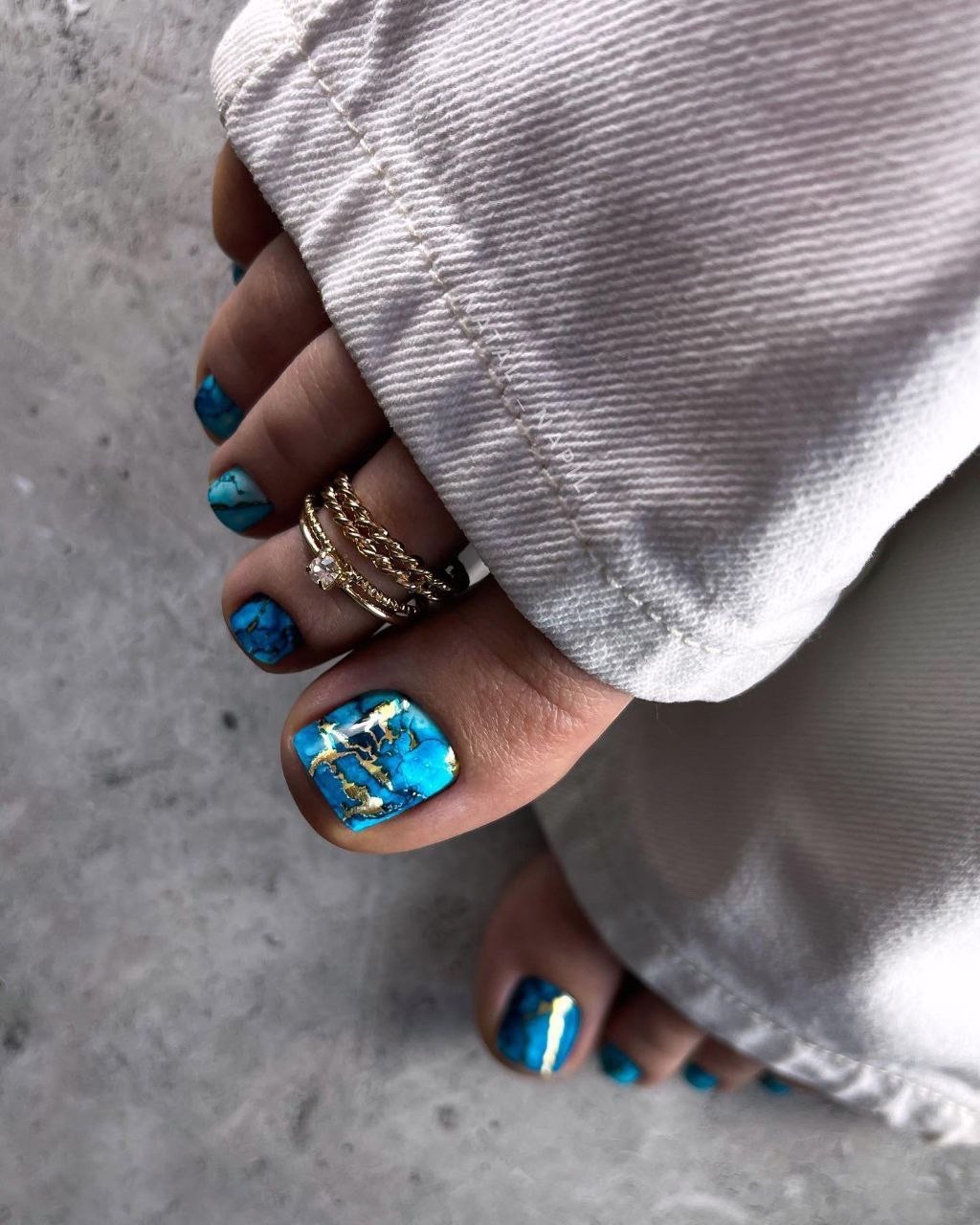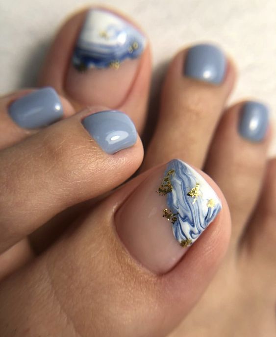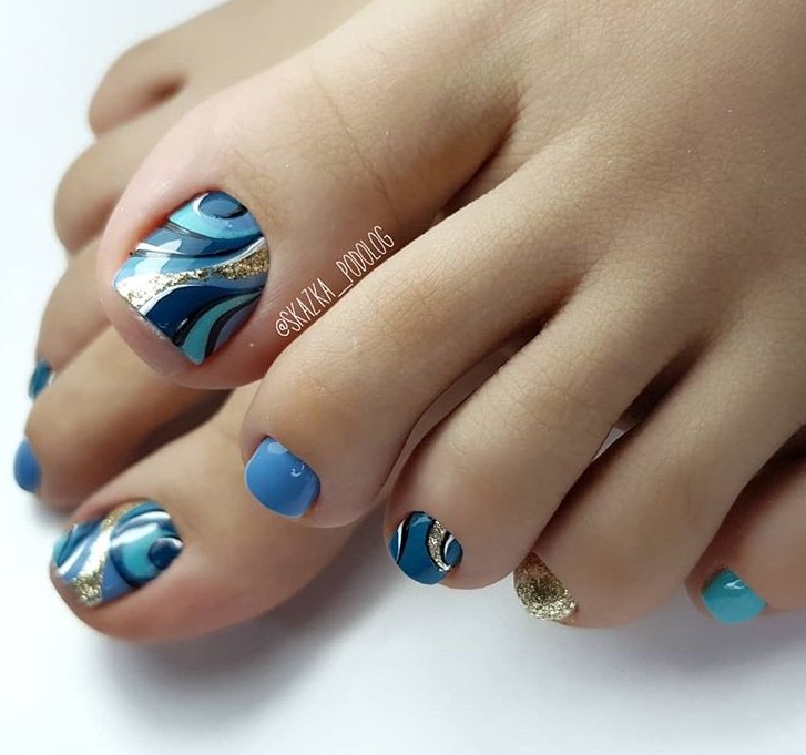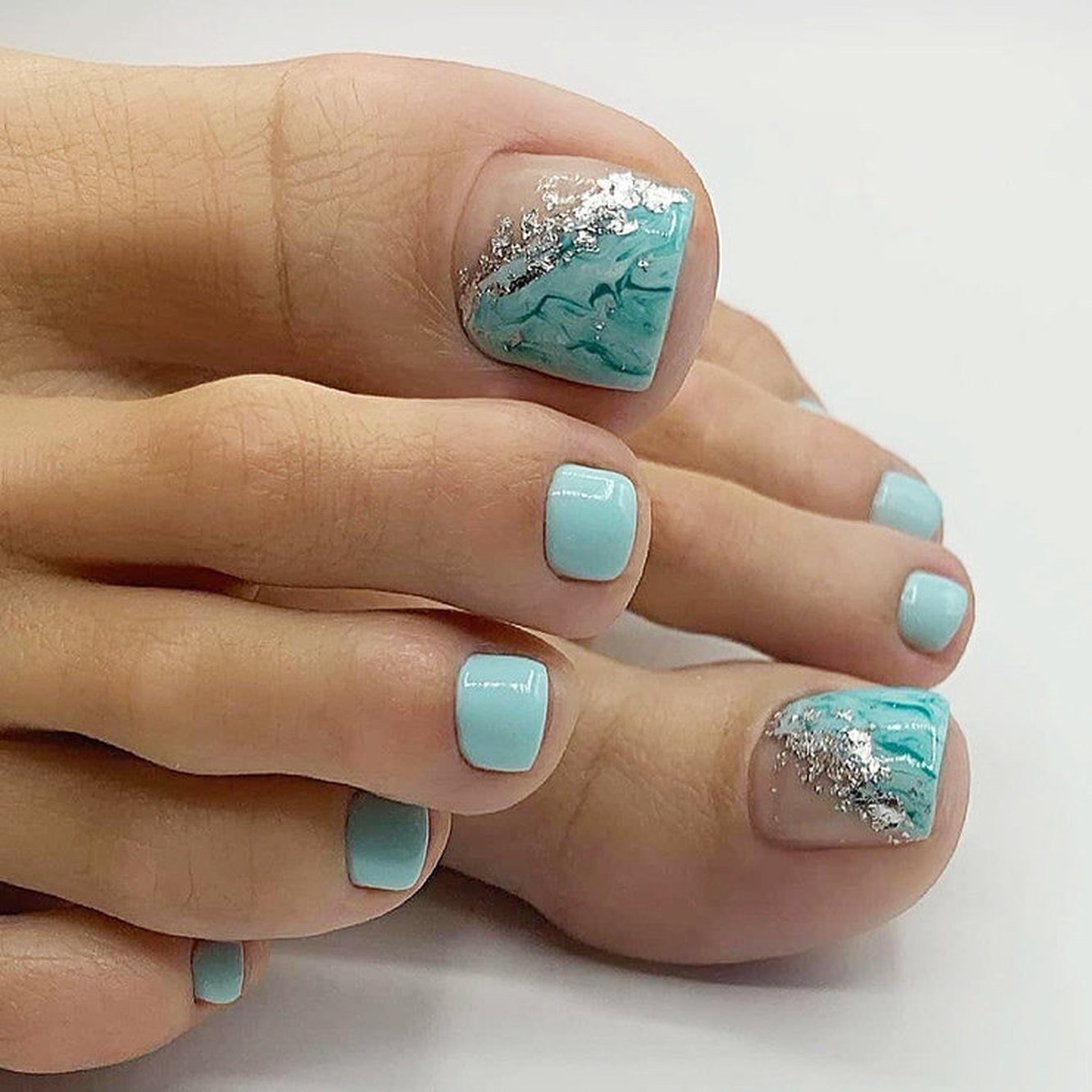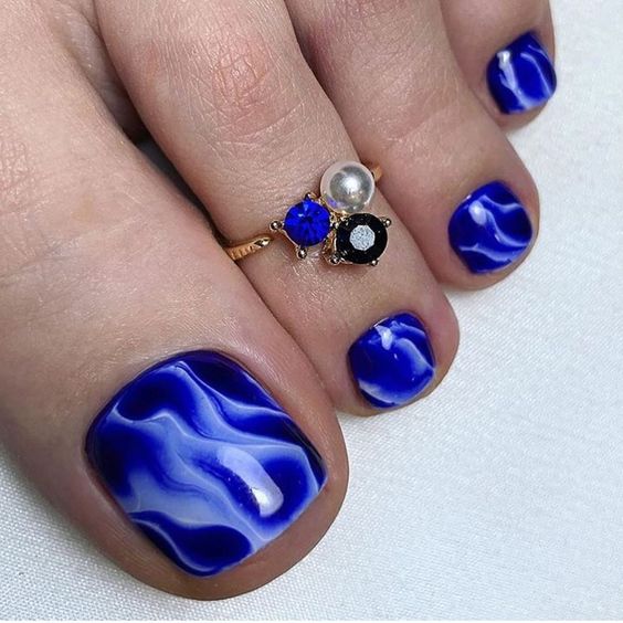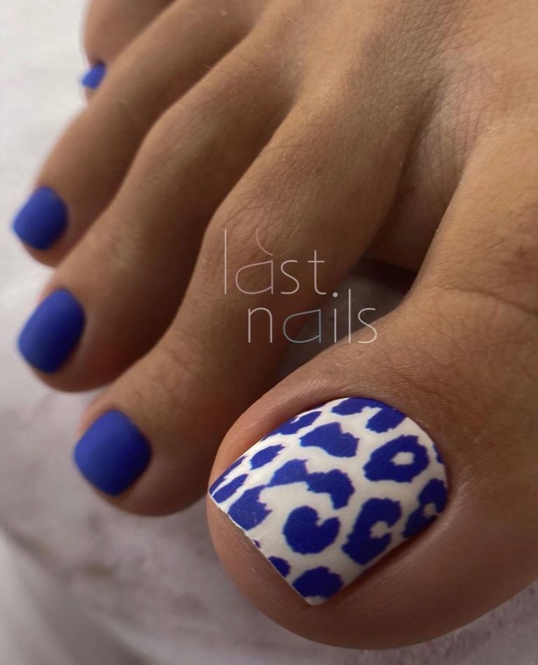 Синяя палитра очень разнообразна, а это значит, что вы сможете сделать яркий педикюр, используя один из популярных оттенков. Трендовым оттенком в этом сезоне считается кобальт. Он очень хорош в однотонном исполнении. Важно, какое покрытие вы выберете — глянцевое или матовое. Кобальт прекрасно сочетается с другими оттенками. Теплое время года, отличную пару он составит с белым, серебряным или золотым.