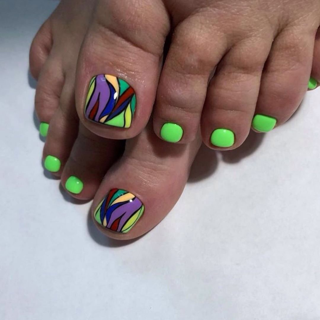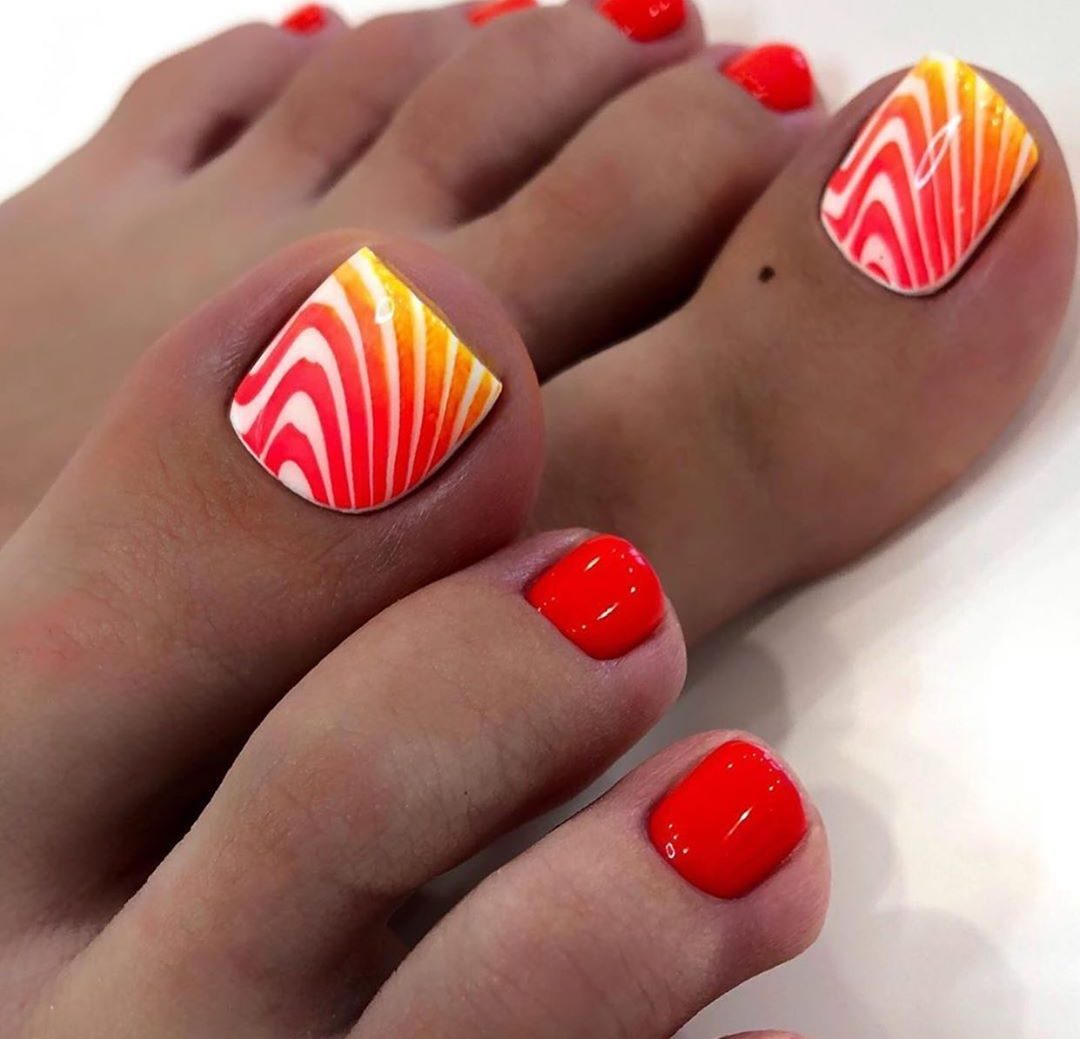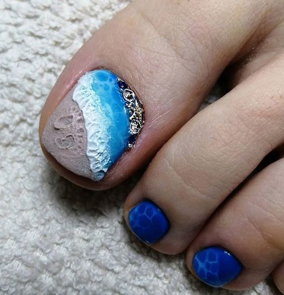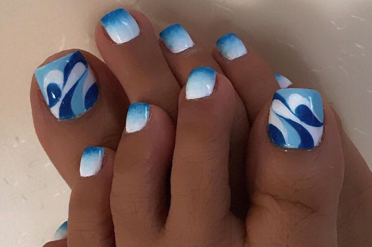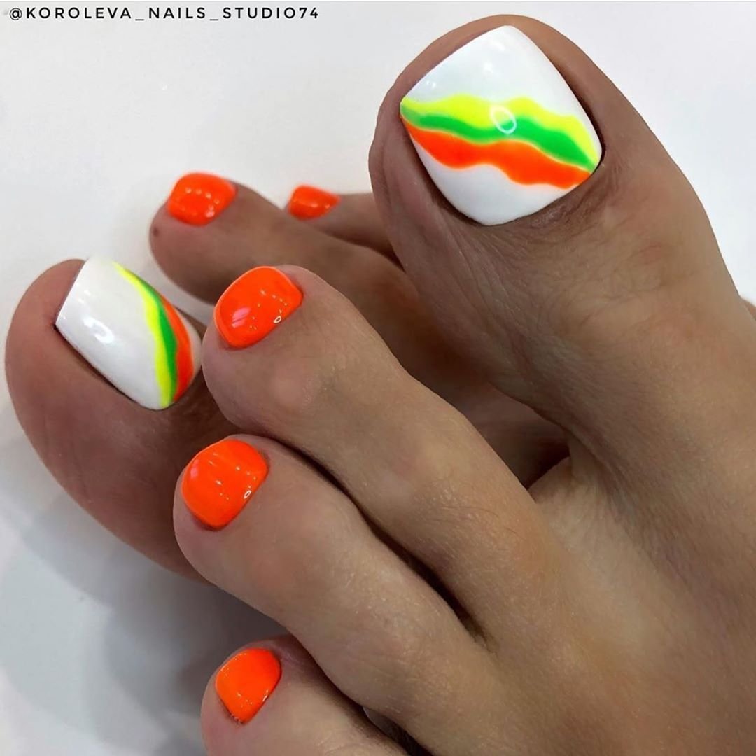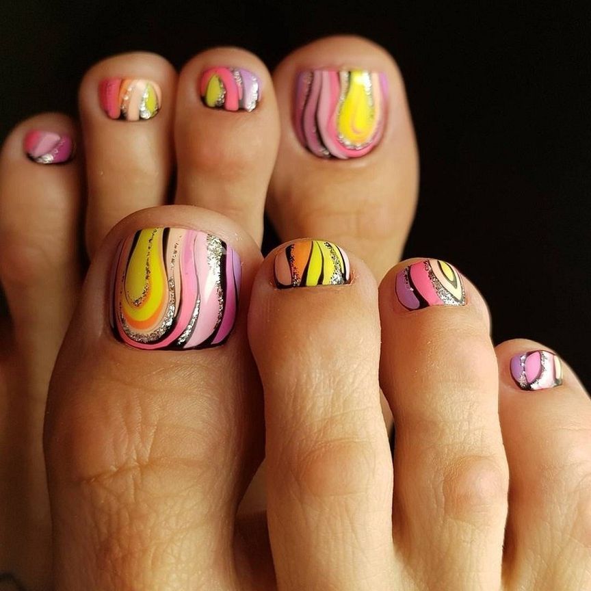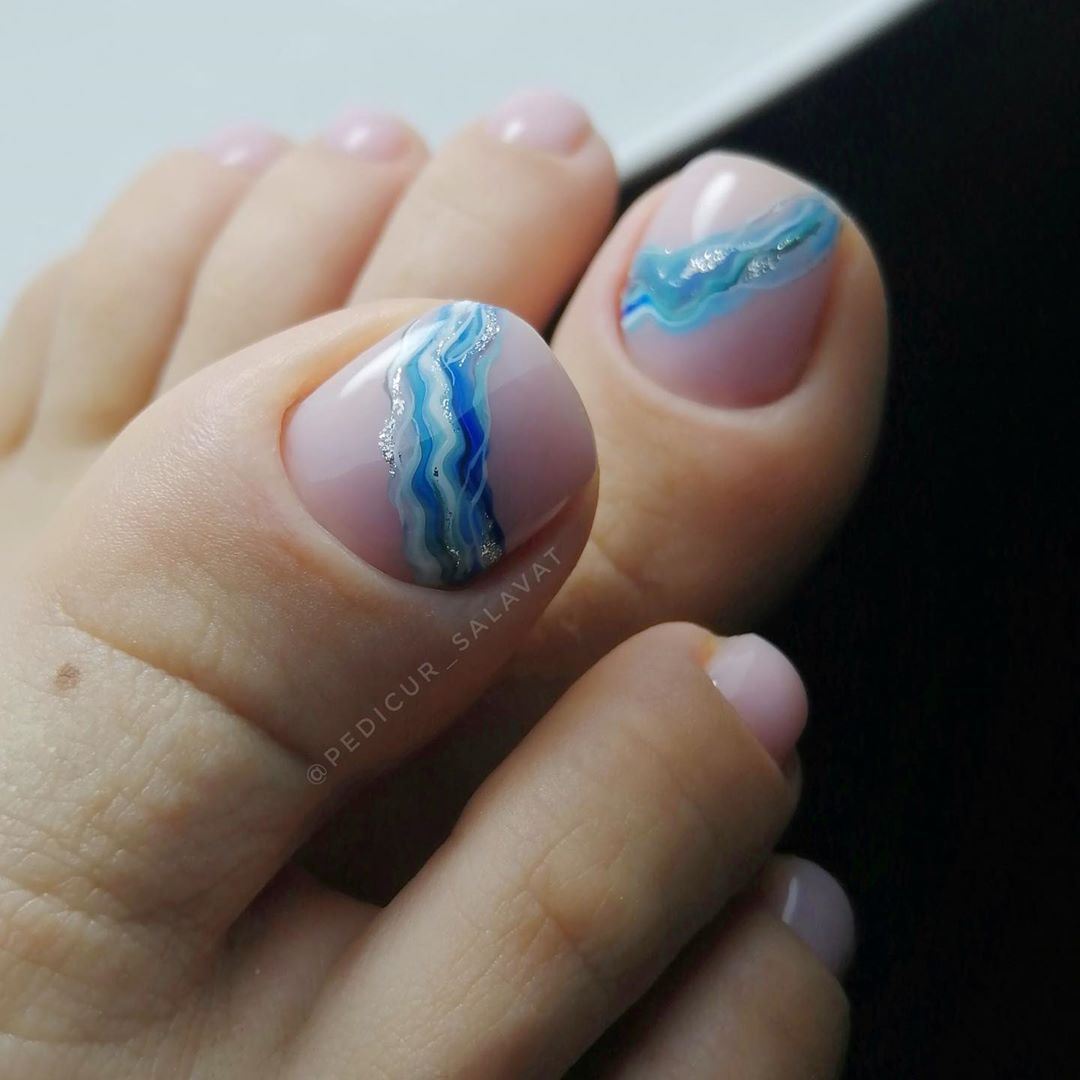 Если вы ищете идеи для яркого педикюра, обратите внимание на рисунок волны. Это могут быть морские волны и пляж или абстрактные волнистые линии разных цветов. И тот, и тот вариант очень актуальны в этом сезоне.