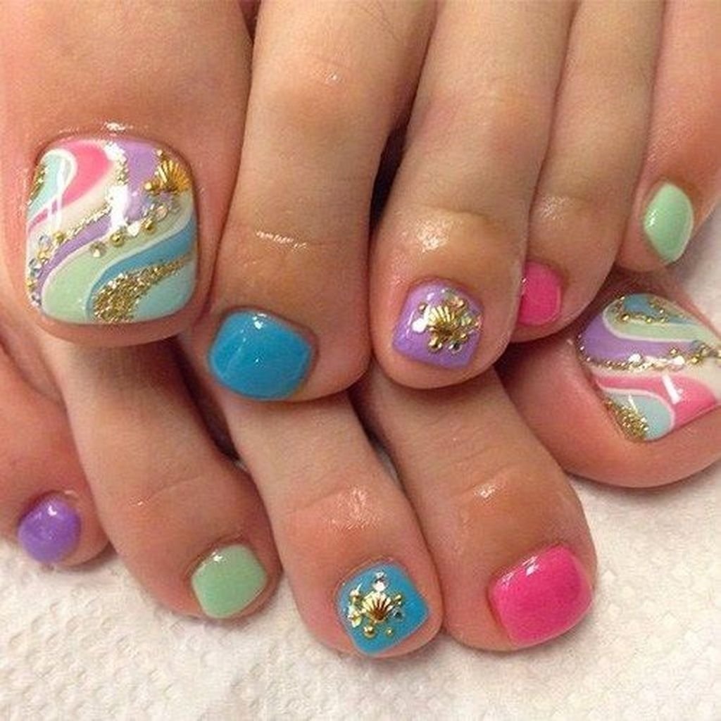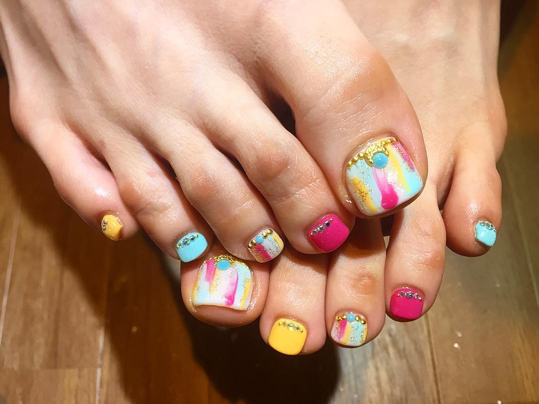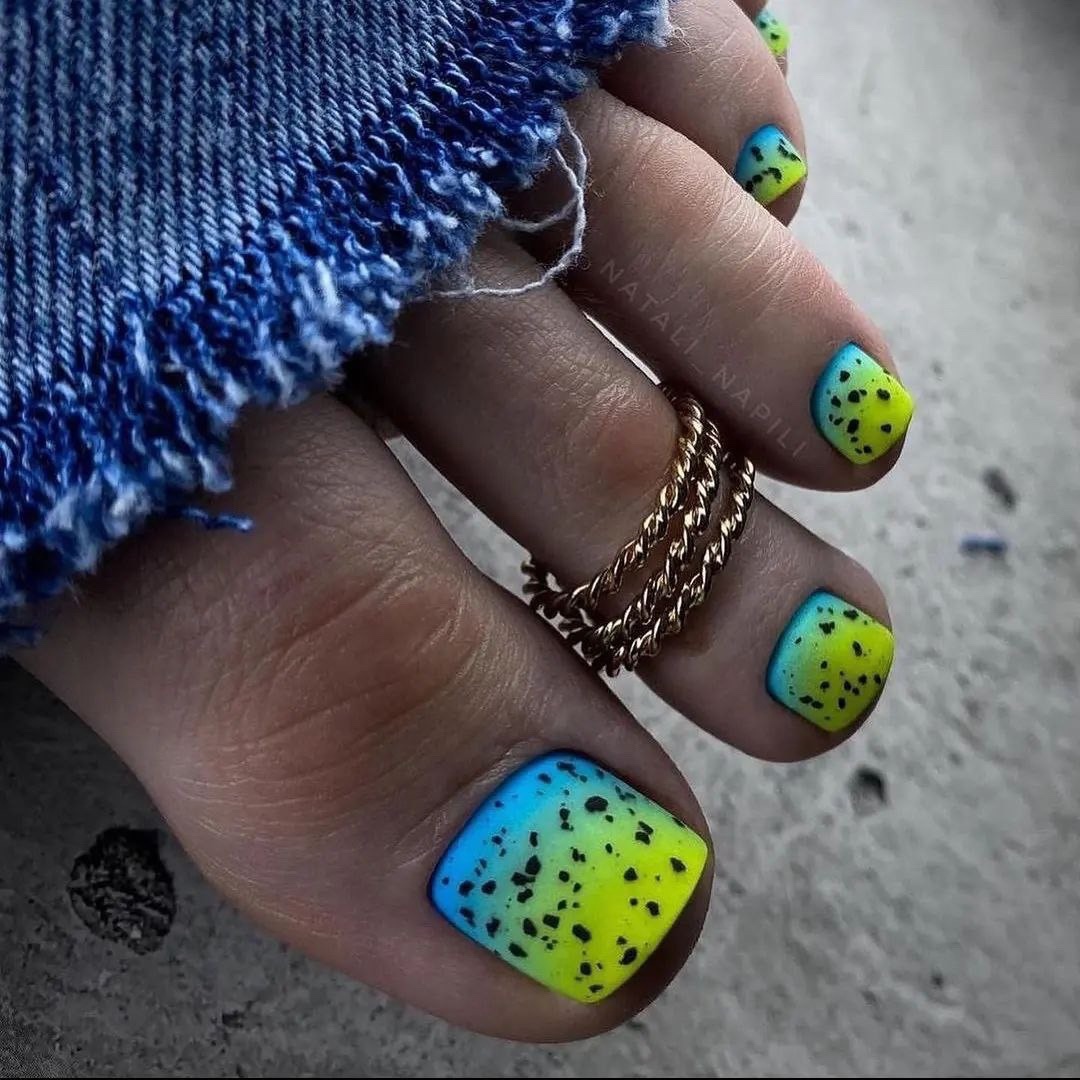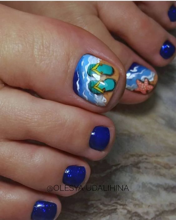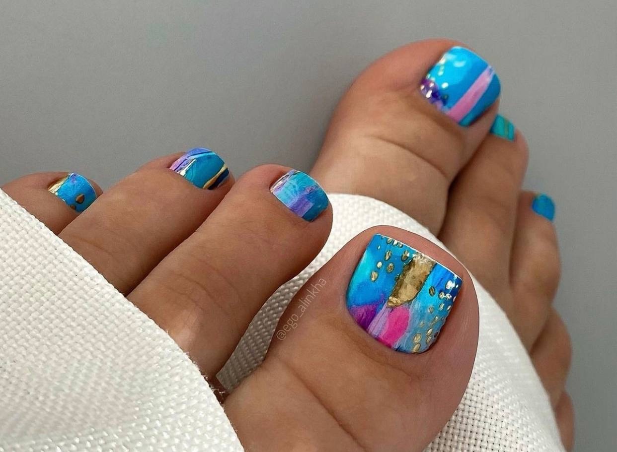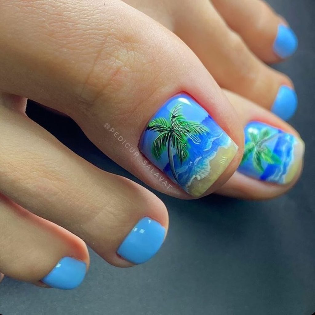 Если вы ищете идеи для яркого педикюра, обратите внимание на рисунок волны. Это могут быть морские волны и пляж или абстрактные волнистые линии разных цветов. И тот, и тот вариант очень актуальны в этом сезоне.