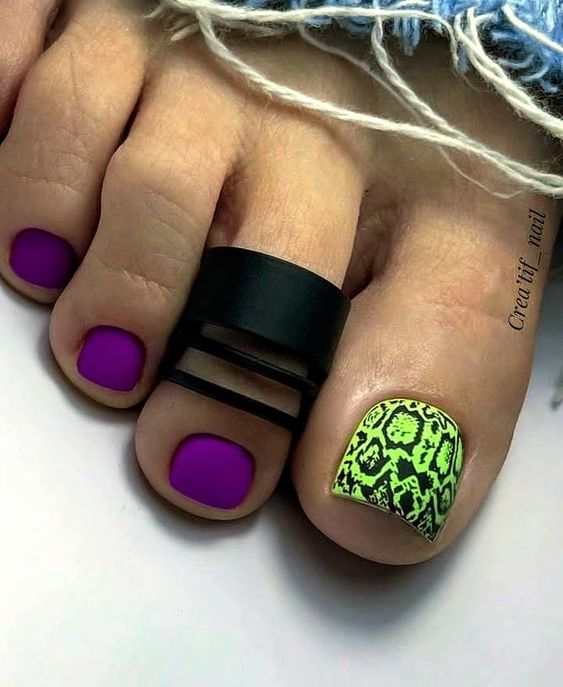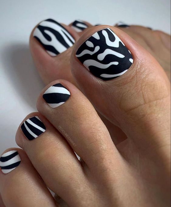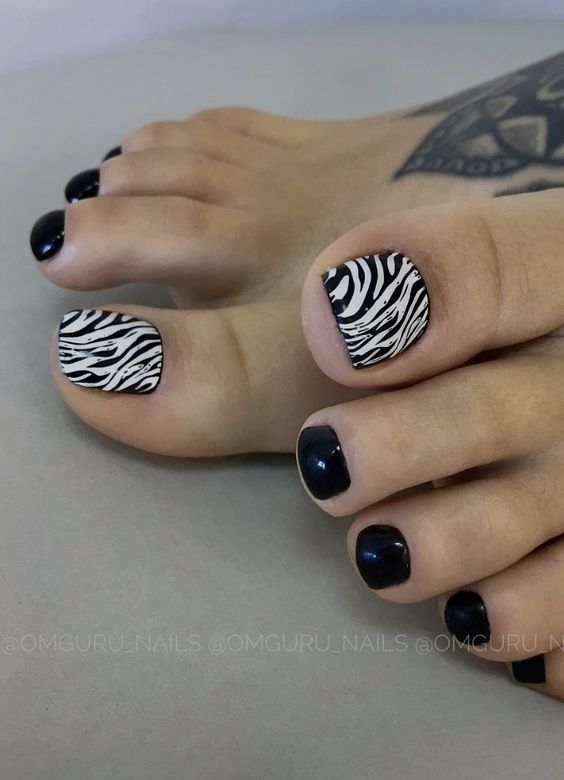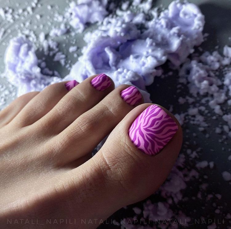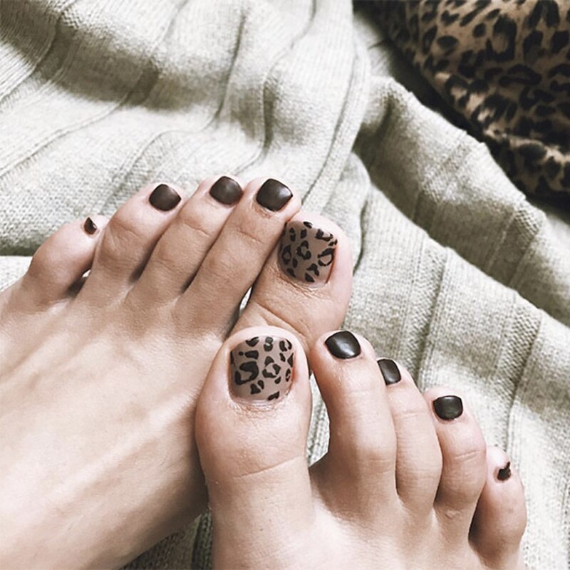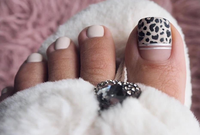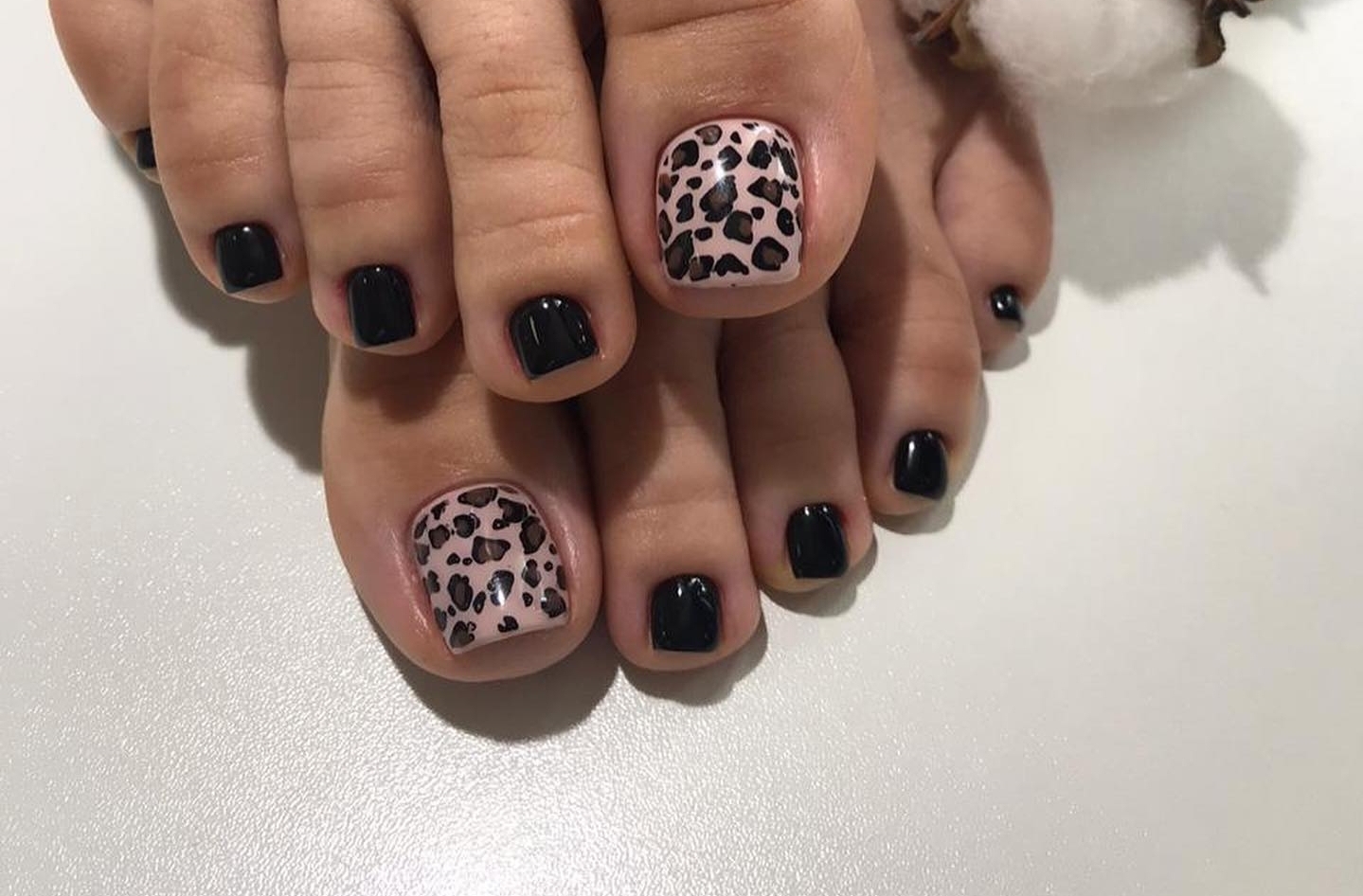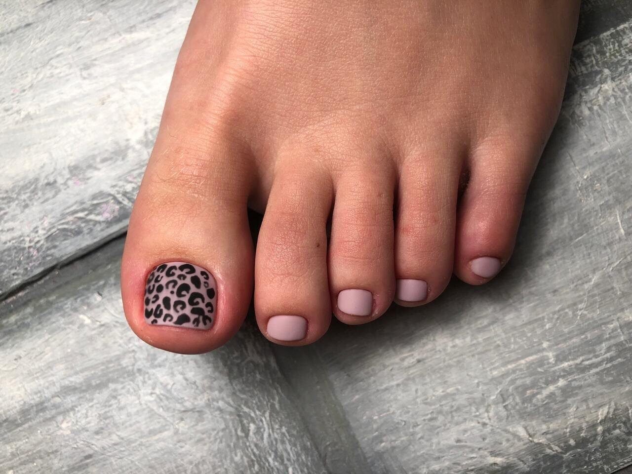 Педикюр с животными принтами — отличная идея для тех, кто хочет добавить немножко страсти. Обратите внимание, что в этом сезоне актуальны не только тигриный и леопардовый принт, но еще и зебра, жираф, корова. Последние, кстати, смотрятся более игриво и мультяшно. Очень интересно, такой педикюр смотрится в паре с однотонным матовым маникюром. Кроме того, животный принт можно делать не в классической расцветке, а выбрать самые яркие оттенки и смело сочетать их так, как вам хочется.