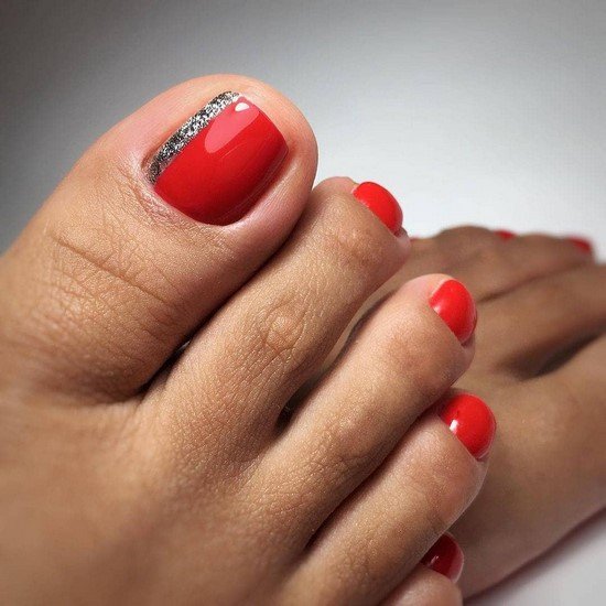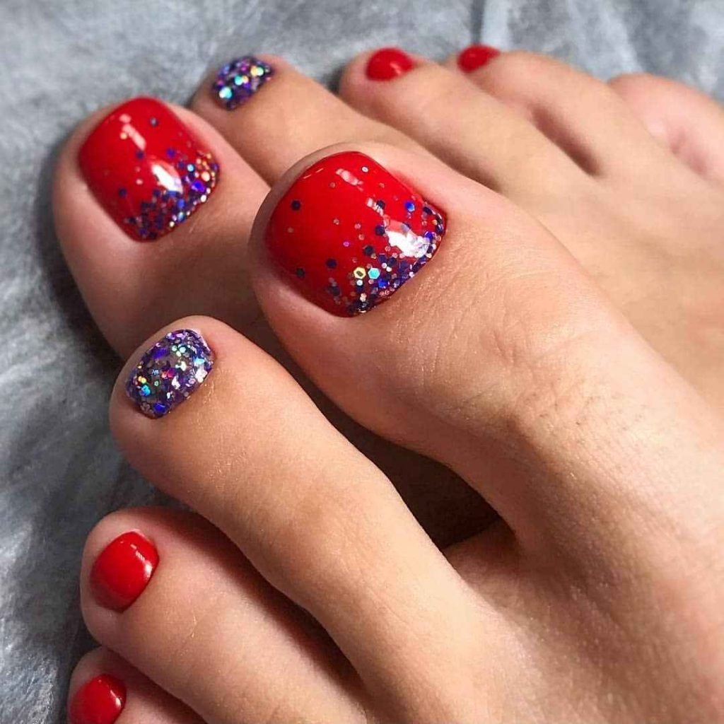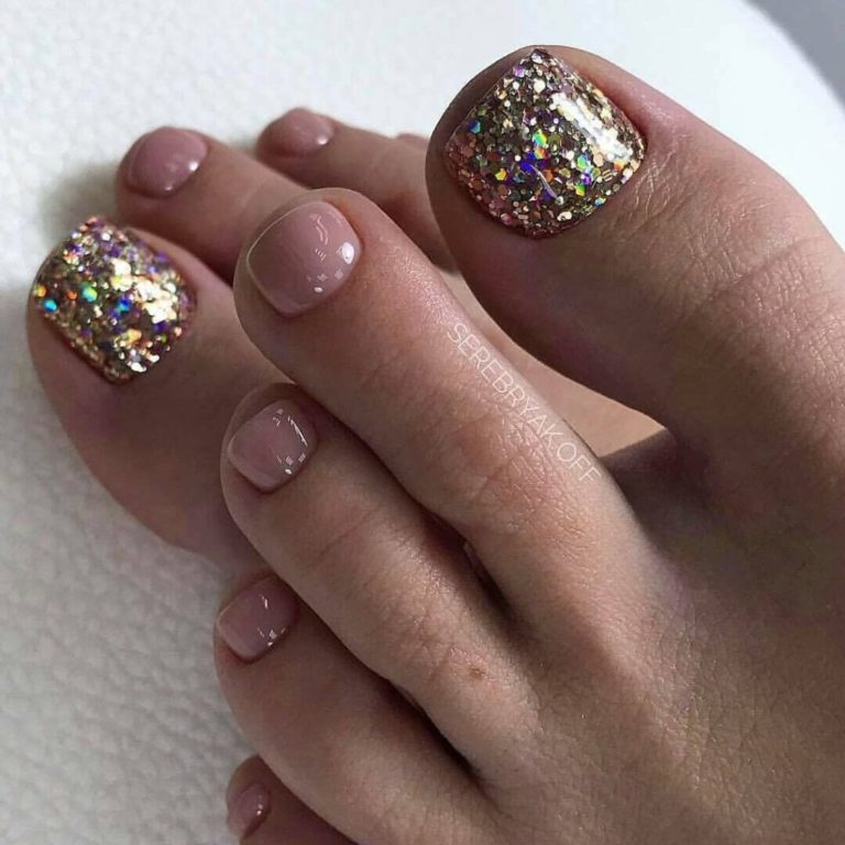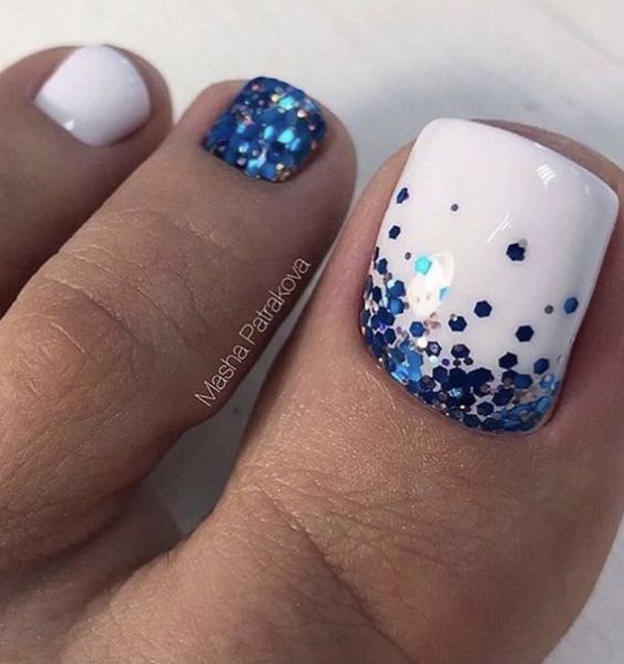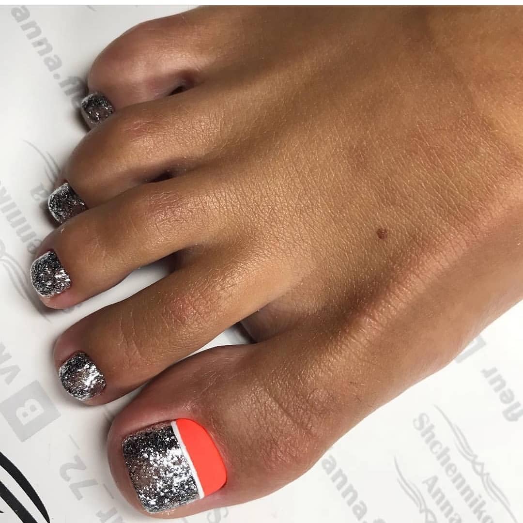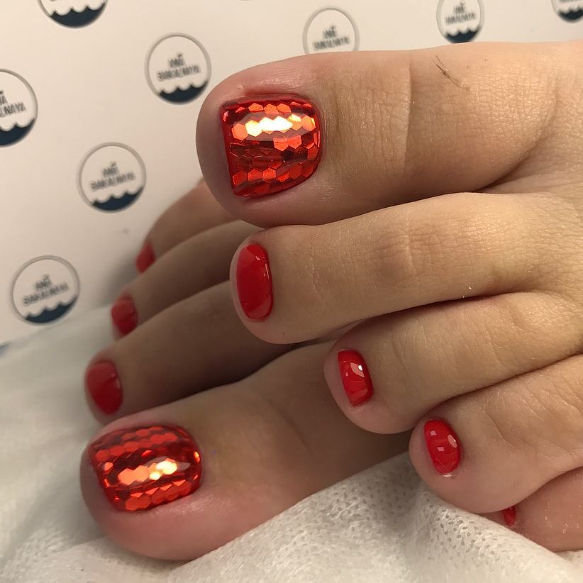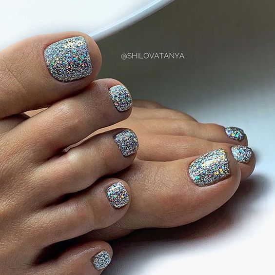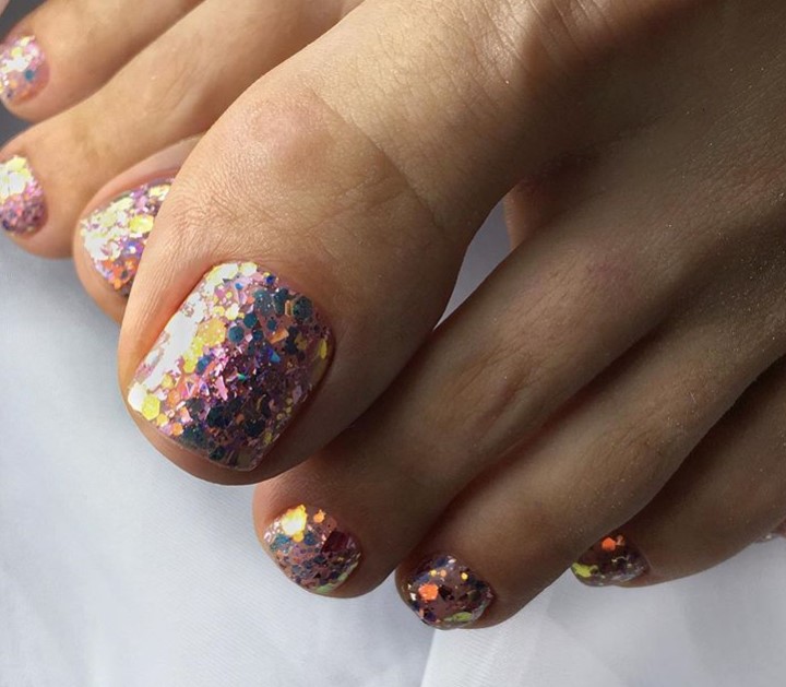 Блестки — это хороший вариант, если вы хотите придать вашему яркому педикюру немного блеска. Все дело в том, что в маникюре вы можете использовать другой прием, это стразы. Для педикюра этот декор не очень подходит. Даже если вы закрепите его очень хорошо. Детали обуви могут повредить стразы. Такой дизайн не продержится очень долго. Кроме того, велик риск травмировать ногтевую пластину. Поэтому вы можете использовать блестки. С их помощью, например, можно выделить лунку. Или нарисовать красивые разводы. Стильно смотрится и педикюр с растяжкой — блестками.