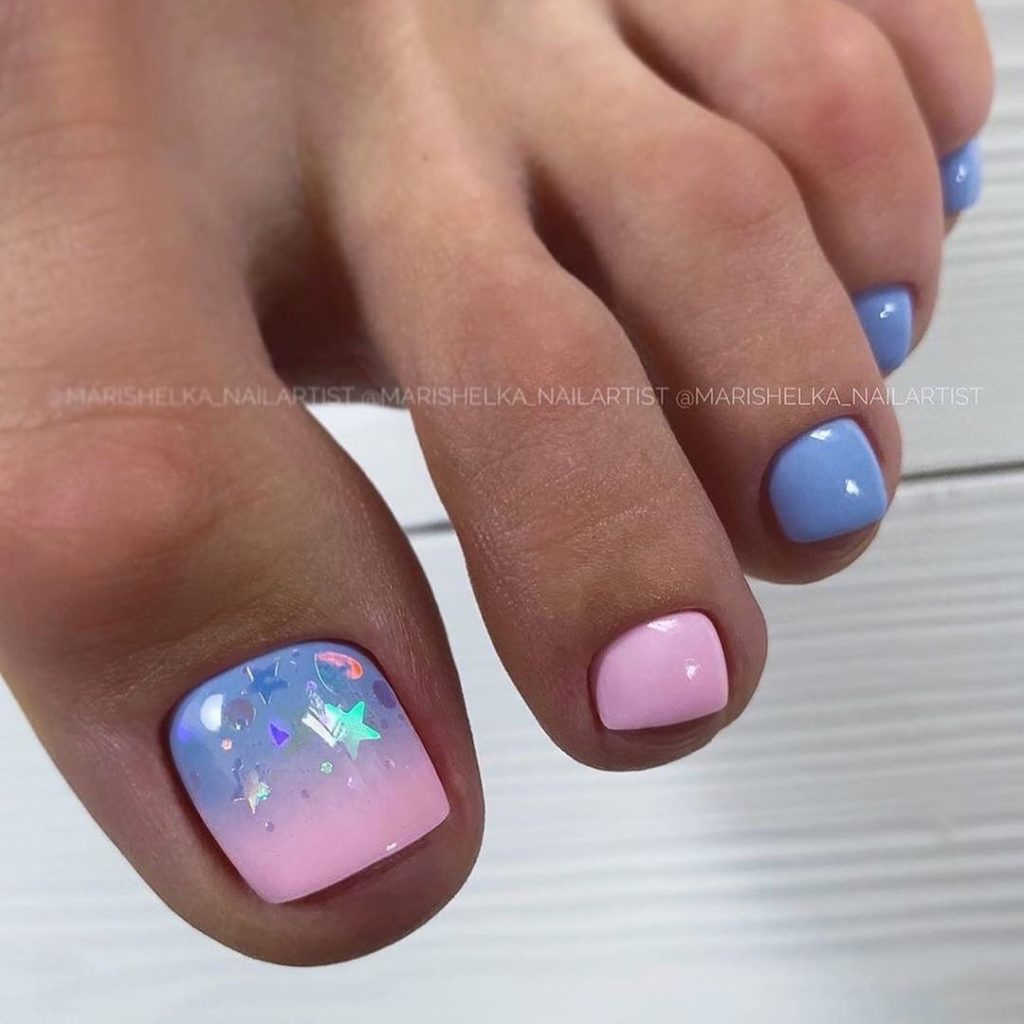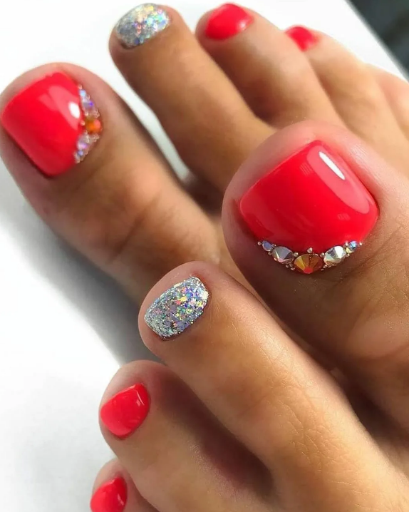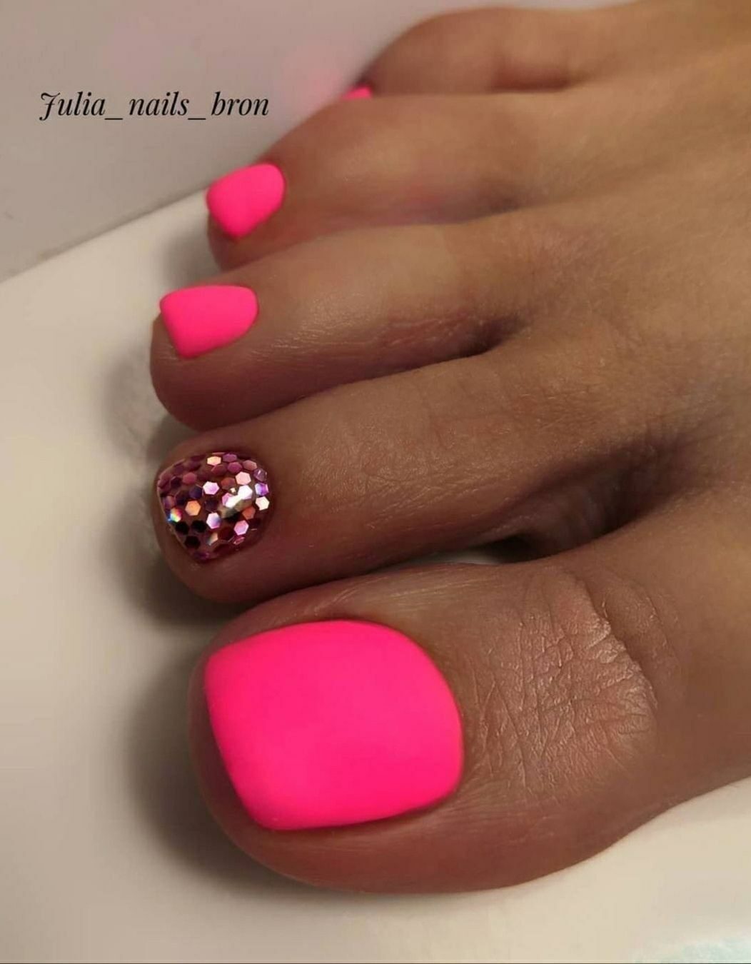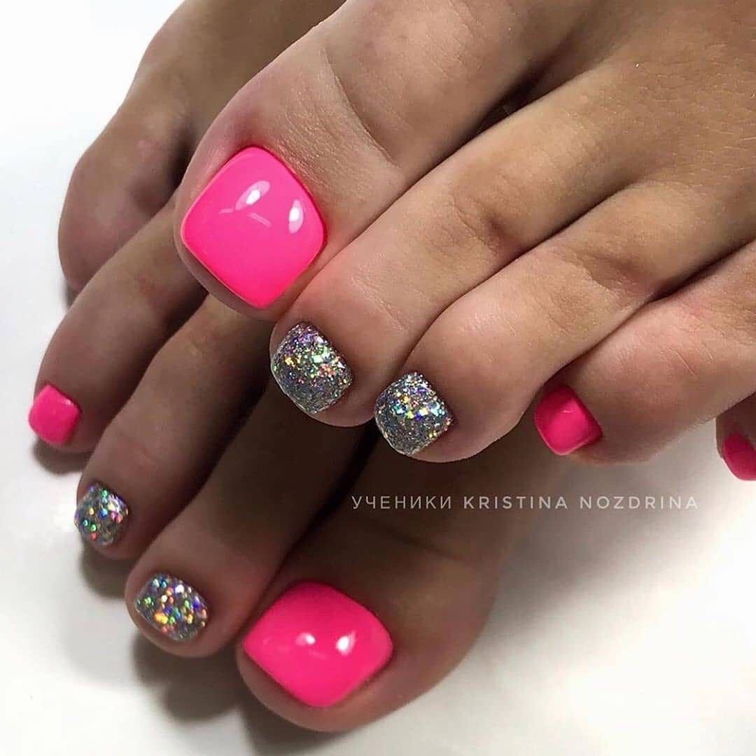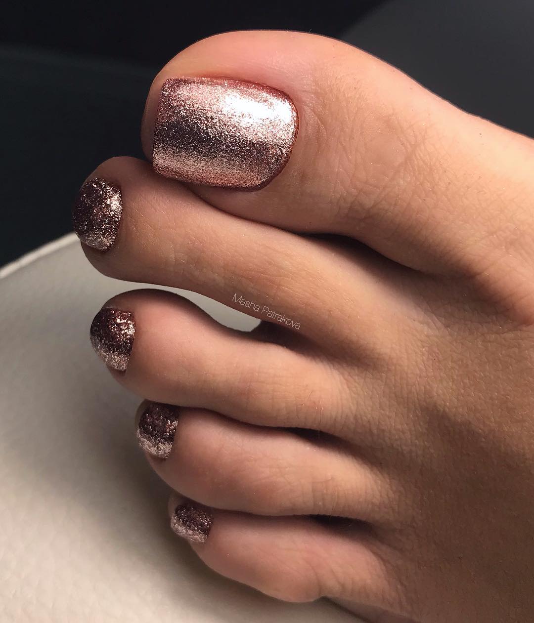 Блестки — это хороший вариант, если вы хотите придать вашему яркому педикюру немного блеска. Все дело в том, что в маникюре вы можете использовать другой прием, это стразы. Для педикюра этот декор не очень подходит. Даже если вы закрепите его очень хорошо. Детали обуви могут повредить стразы. Такой дизайн не продержится очень долго. Кроме того, велик риск травмировать ногтевую пластину. Поэтому вы можете использовать блестки. С их помощью, например, можно выделить лунку. Или нарисовать красивые разводы. Стильно смотрится и педикюр с растяжкой — блестками.