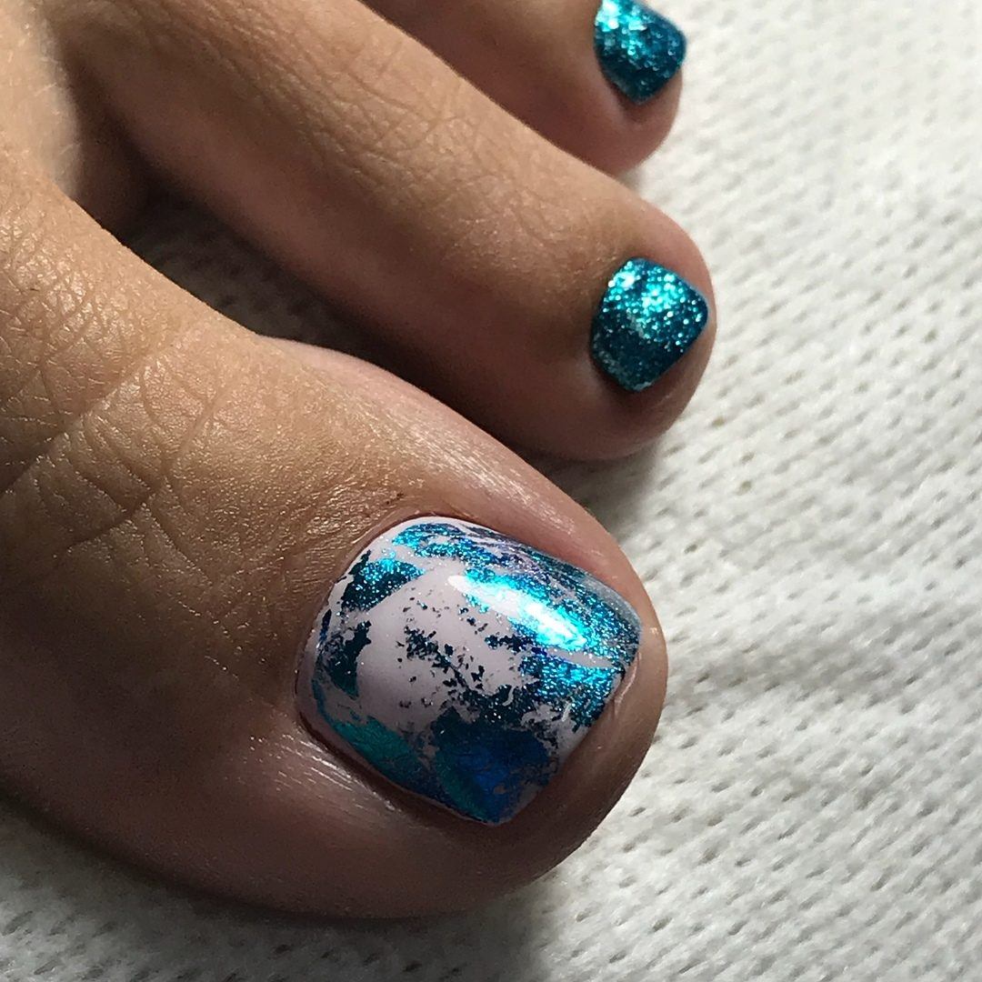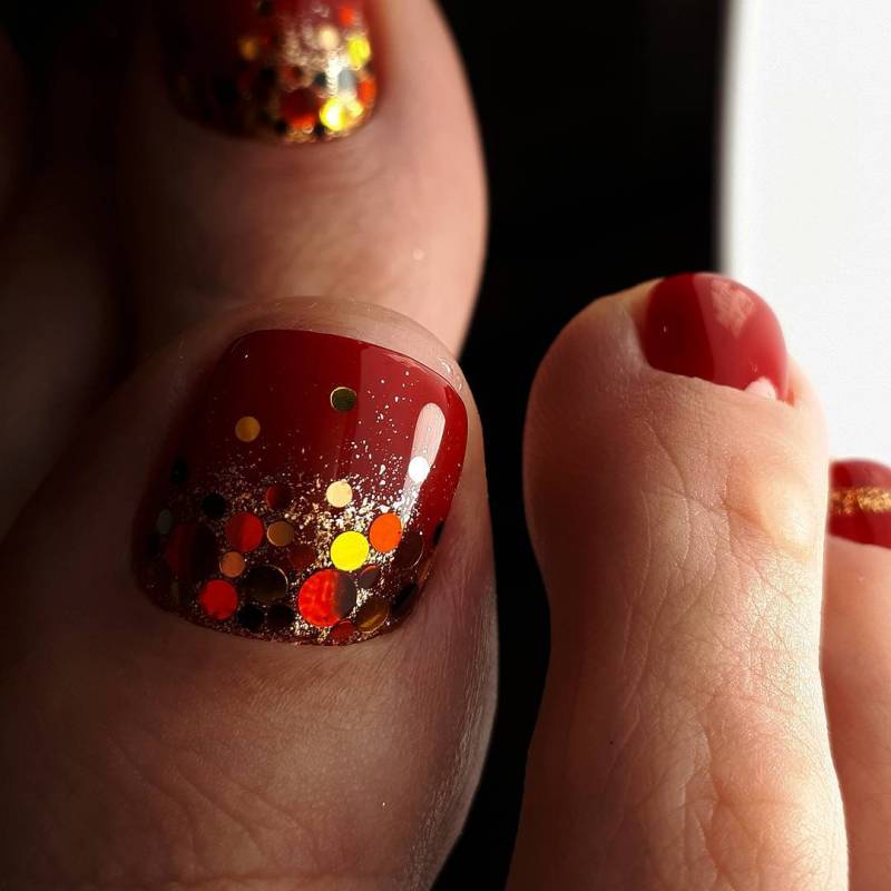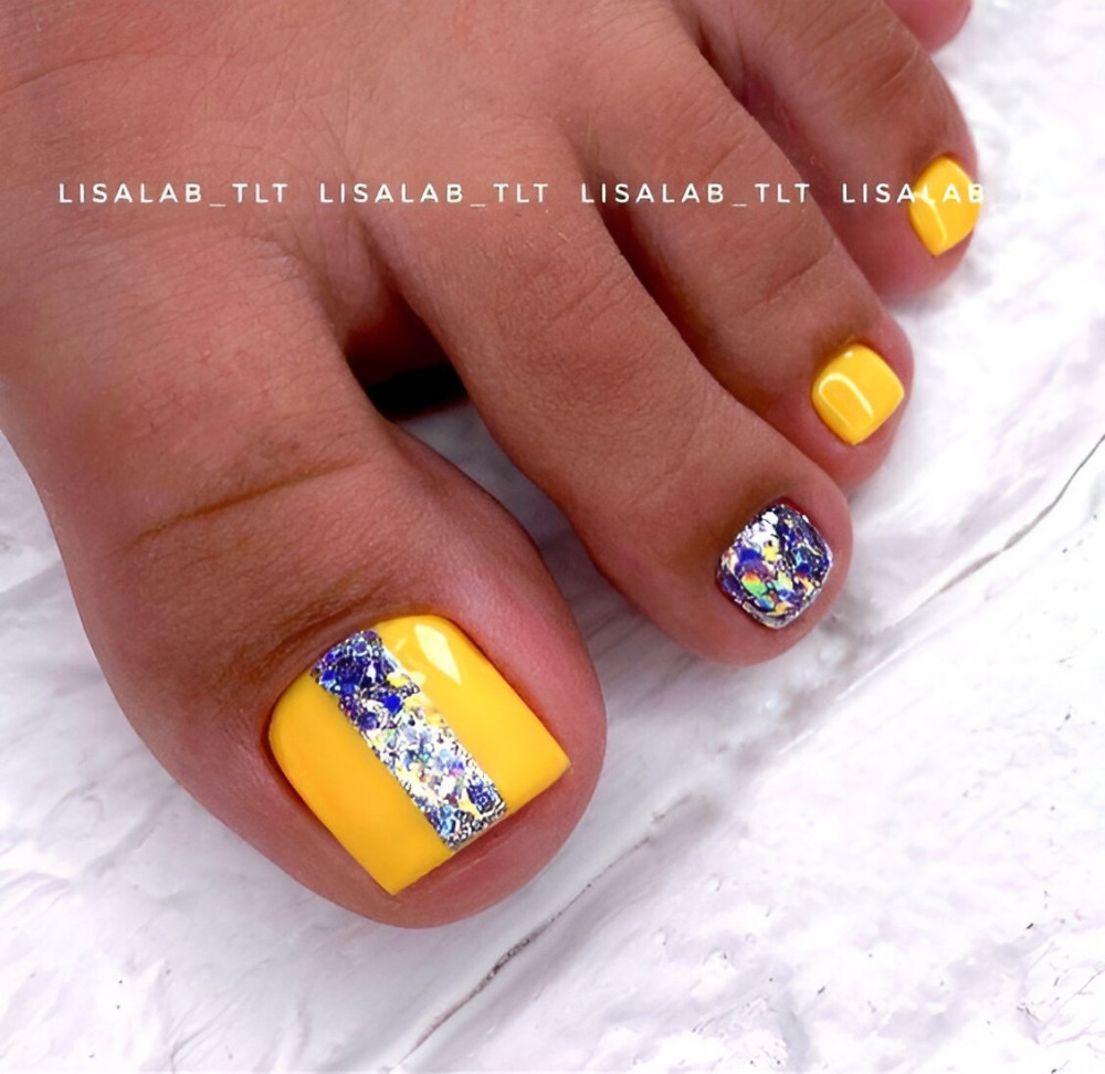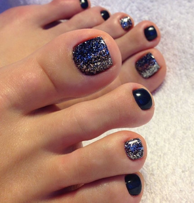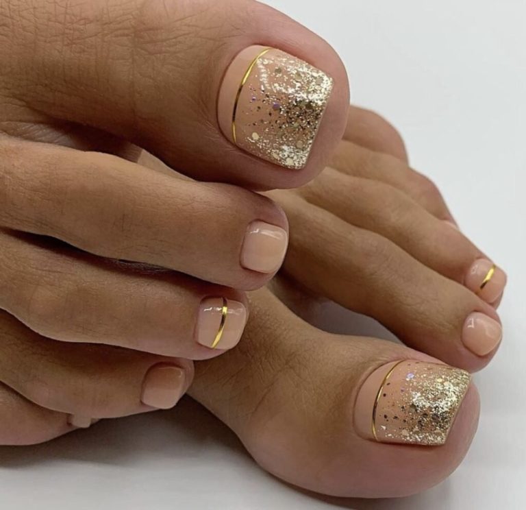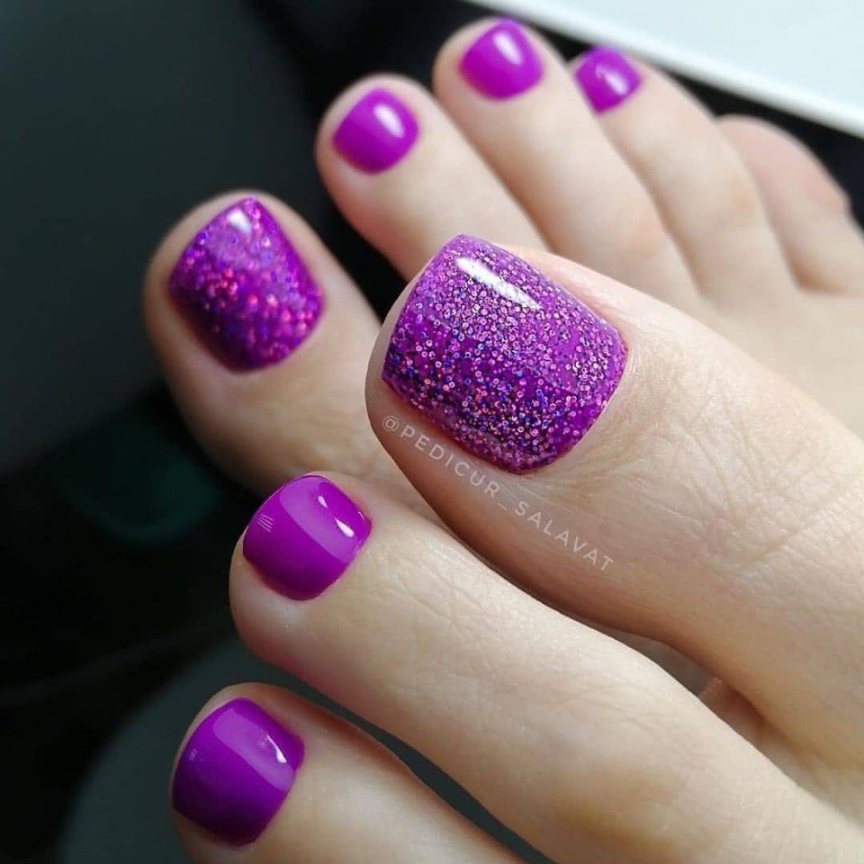 Блестки — это хороший вариант, если вы хотите придать вашему яркому педикюру немного блеска. Все дело в том, что в маникюре вы можете использовать другой прием, это стразы. Для педикюра этот декор не очень подходит. Даже если вы закрепите его очень хорошо. Детали обуви могут повредить стразы. Такой дизайн не продержится очень долго. Кроме того, велик риск травмировать ногтевую пластину. Поэтому вы можете использовать блестки. С их помощью, например, можно выделить лунку. Или нарисовать красивые разводы. Стильно смотрится и педикюр с растяжкой — блестками.