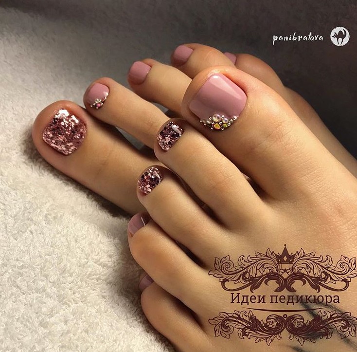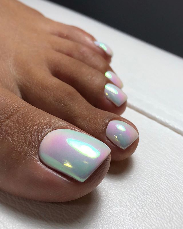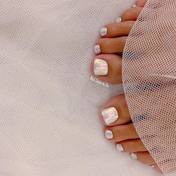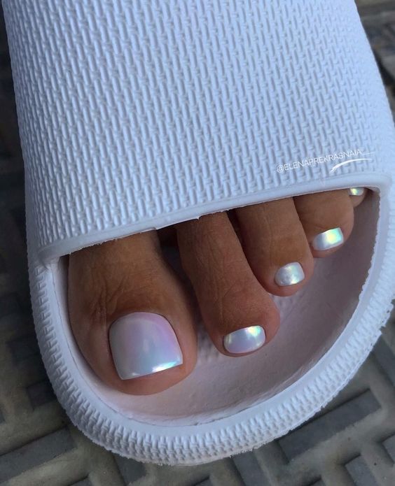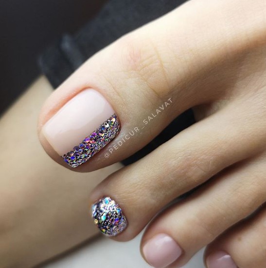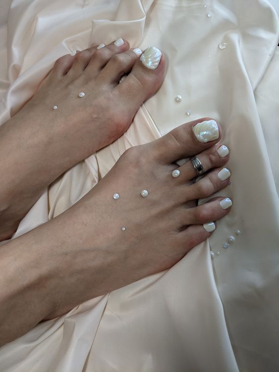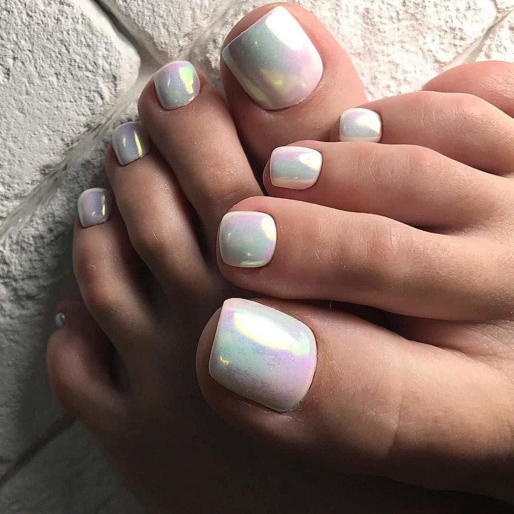 Если все же хочется разнообразить педикюр жемчужным оттенком, выбирайте блестящие или матовые акценты. Но размещайте их на одном или двух пальчиках на ноге. Например, на большом. Этого будет достаточно.