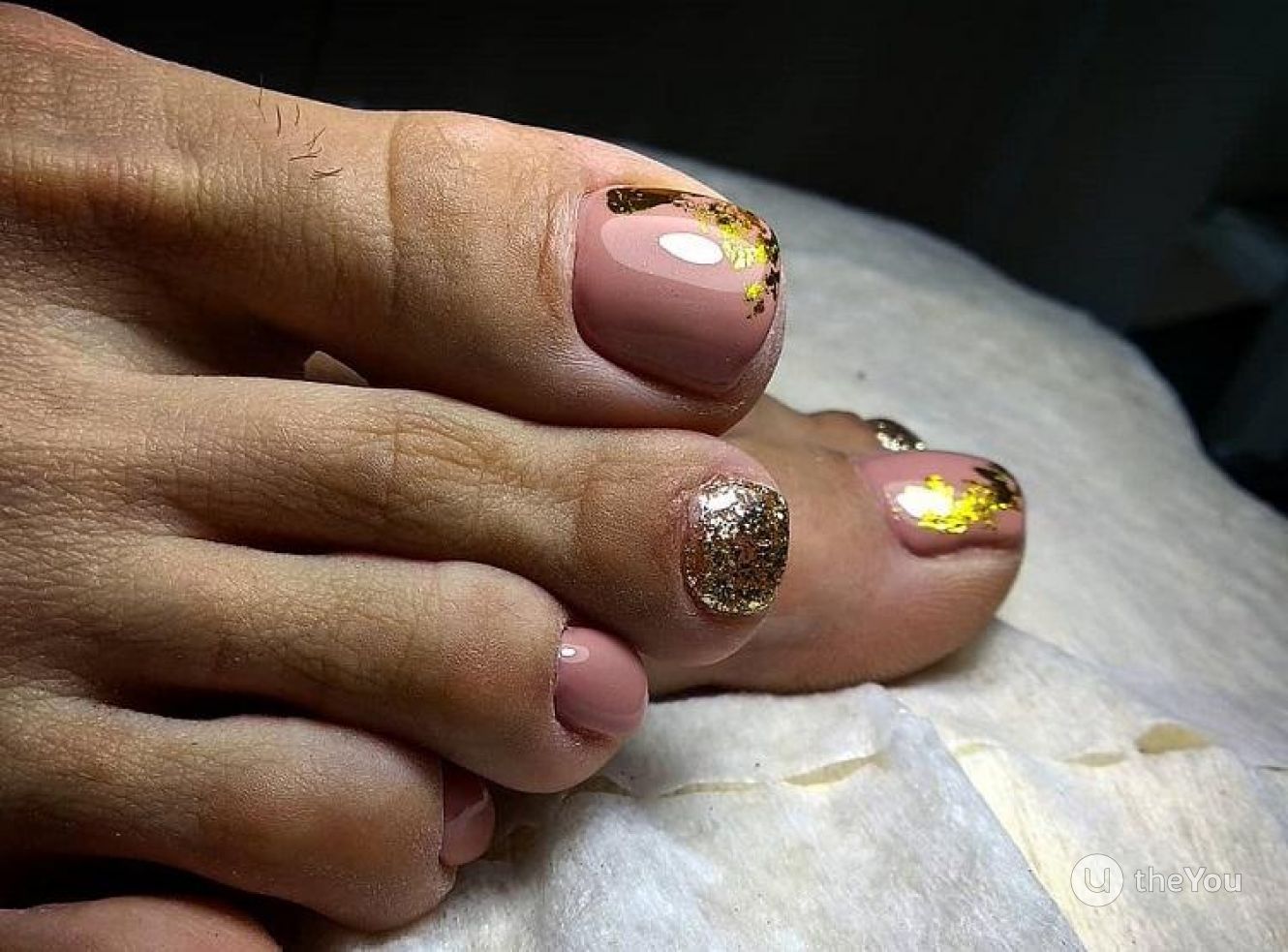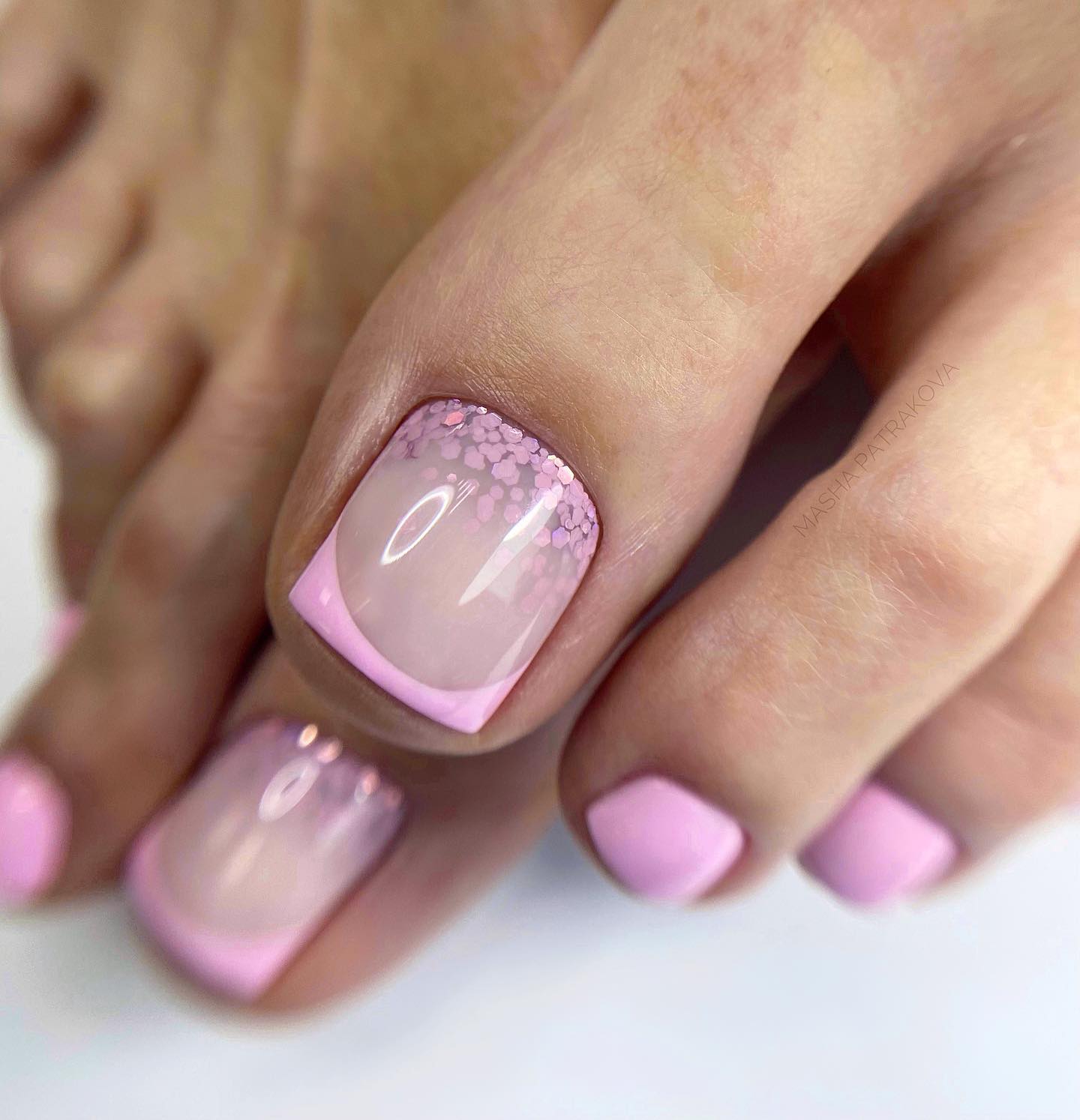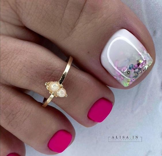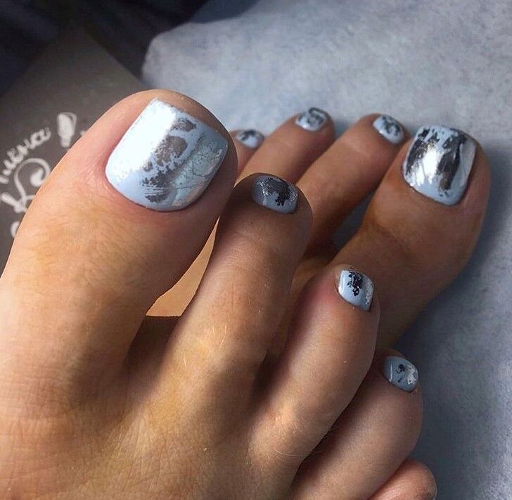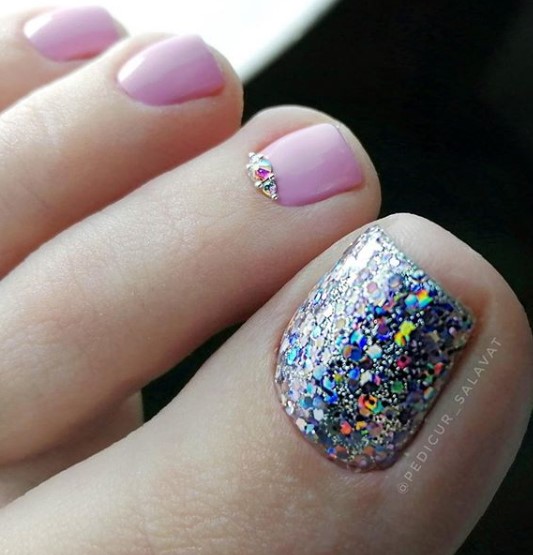 Если все же хочется разнообразить педикюр жемчужным оттенком, выбирайте блестящие или матовые акценты. Но размещайте их на одном или двух пальчиках на ноге. Например, на большом. Этого будет достаточно.