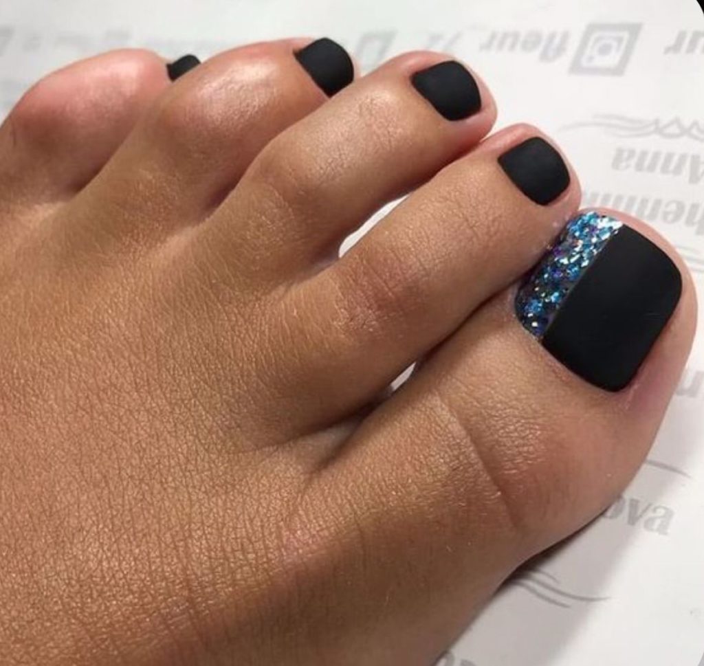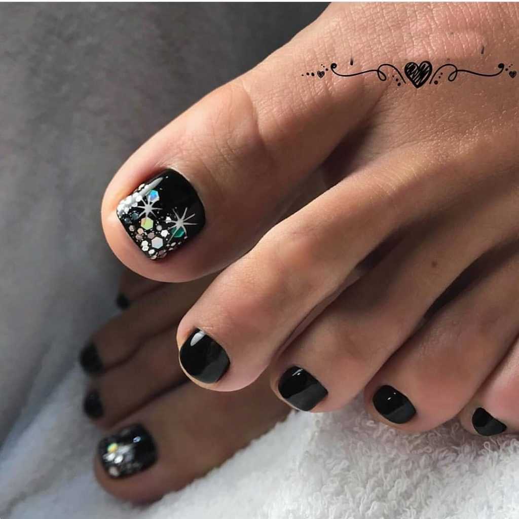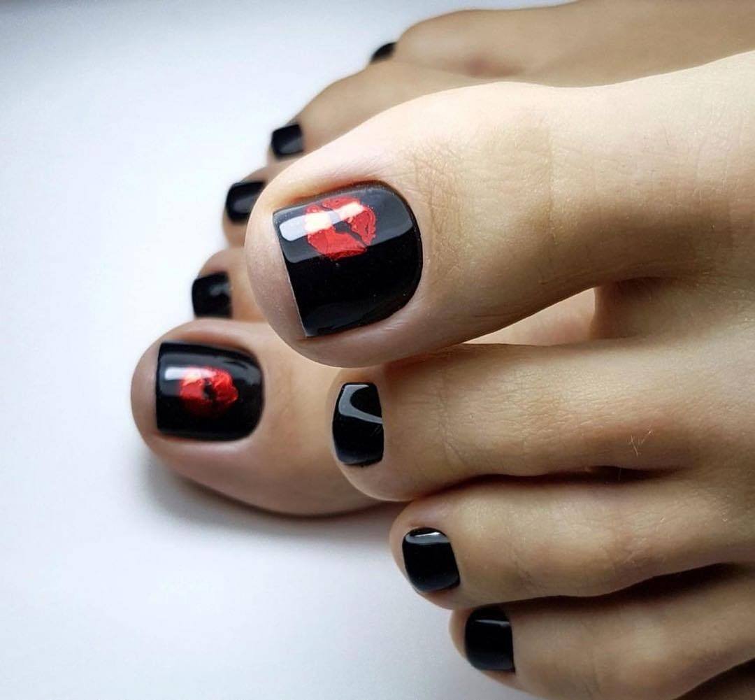 Еще один классический вариант для создания яркого стильного педикюра. Многим кажется, что маникюр и педикюр в этом оттенке будут слишком мрачными. Но спешим вас уверить, черный оттенок популярен даже в летние деньки. Это не просто красиво и ярко, но еще и очень практично. Все дело в том, что, например, летом мы носим открытую обувь. И светлые лаки очень быстро накапливают на своей поверхности загрязнения: пыль, грязь, песок и так далее. А вот черному цвету это не грозит. Вы смело можете сделать черный педикюр и отправляться в отпуск на море. Кроме того, черный цвет прекрасно подходит к любому цвету обуви.
