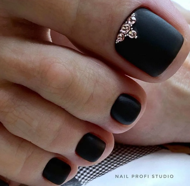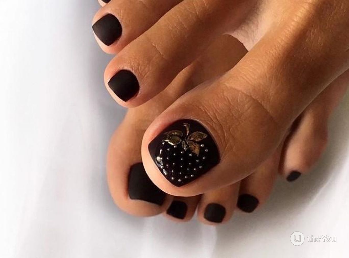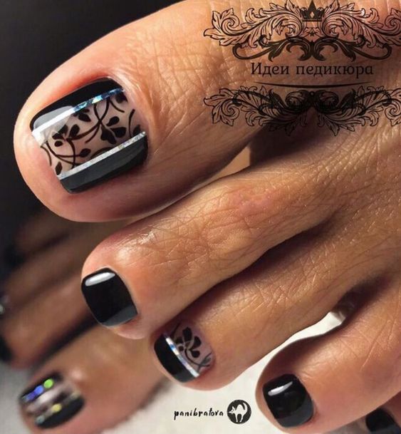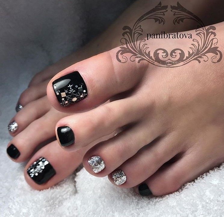Ну и, конечно, чтобы сделать очень стильный и яркий педикюр, вы можете дополнить черную базу самыми разными вариантами декора. Например, фольгой, красивыми рисунками. А вот использовать стразы мы рекомендуем только летом. В другие сезоны ношения закрытой обуви помешает целостности такого педикюра.