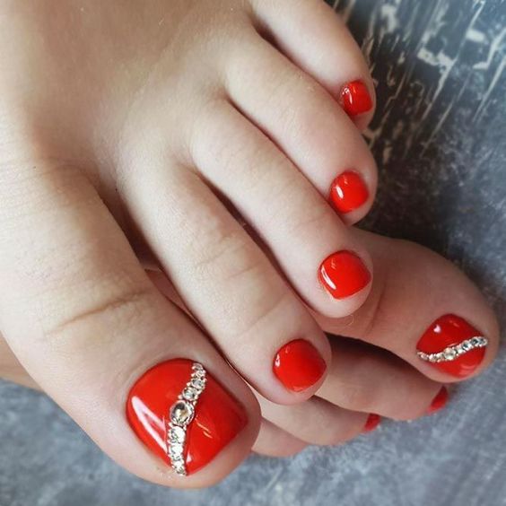 Без преувеличения скажем, что этот оттенок популярен всегда и везде. Именно с ним получится создать яркий и страстный педикюр. В этом сезоне популярны оттенки от яркого неонового до глубокого бордового. Чтобы разнообразить яркий педикюр, предлагаем добавить в него декор в виде ярких страз или блестящих фольгированных полосок. Стильно смотрятся рисунке в минималистичном дизайне. Кроме того, красный яркий педикюр можно добавить камифубуки.