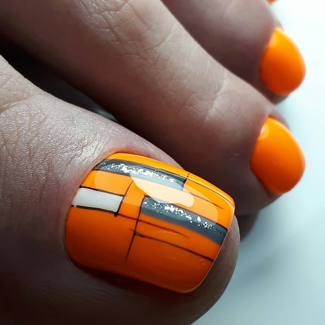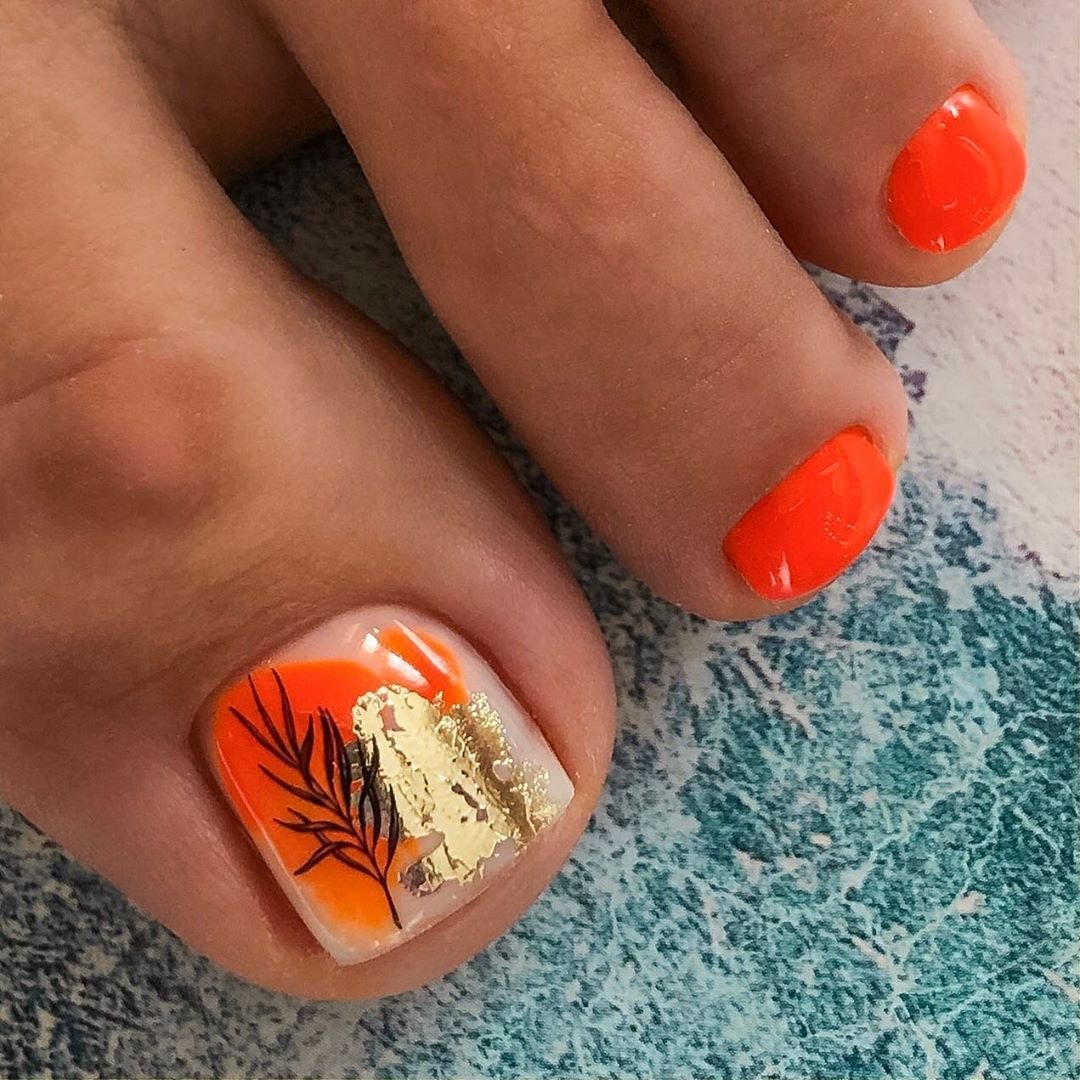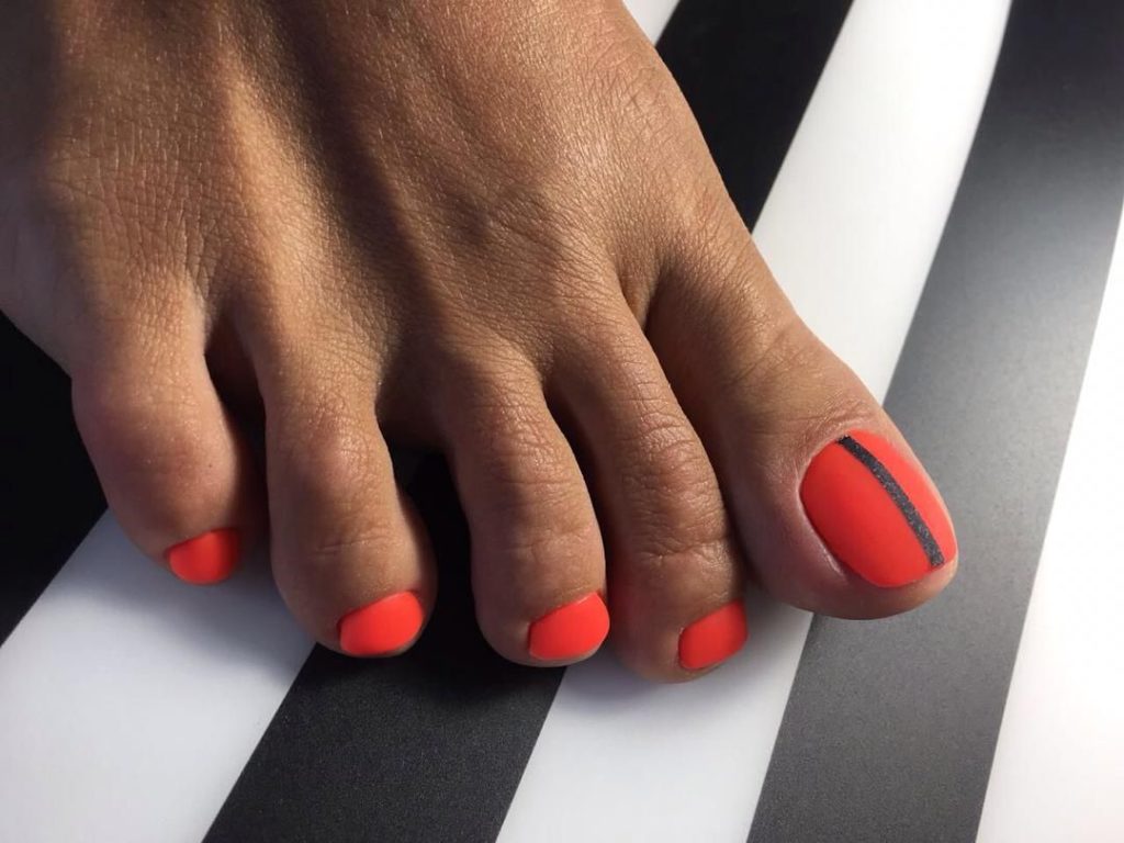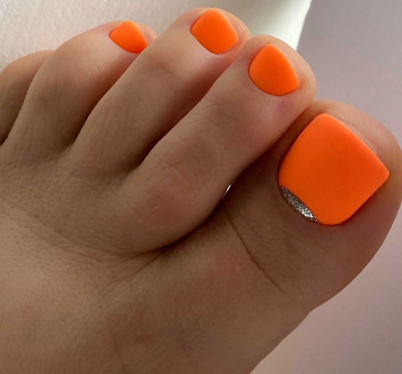Оранжевый — это, наверное, синоним яркого педикюра. Он отлично смотрится в технике омбре в сочетании с другими цветами. Кроме того, обязательно попробуйте сочетать этот яркий цвет с матовым топом. Вы увидите, как ваши пальчики будут выглядеть стильно и очень дорого. Кроме того, этот удивительный цвет отлично сочетается с любой парой открытой обуви. Но если вы решите сделать оранжевый педикюр зимой или осенью, то он греет вас своим теплом и яркостью. Оранжевый цвет очень активен, поэтому его можно не дополнять декором. Если очень хочется, выбирайте фольгу, слайдеры или минималистичные рисунки.