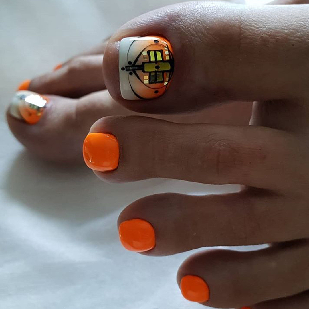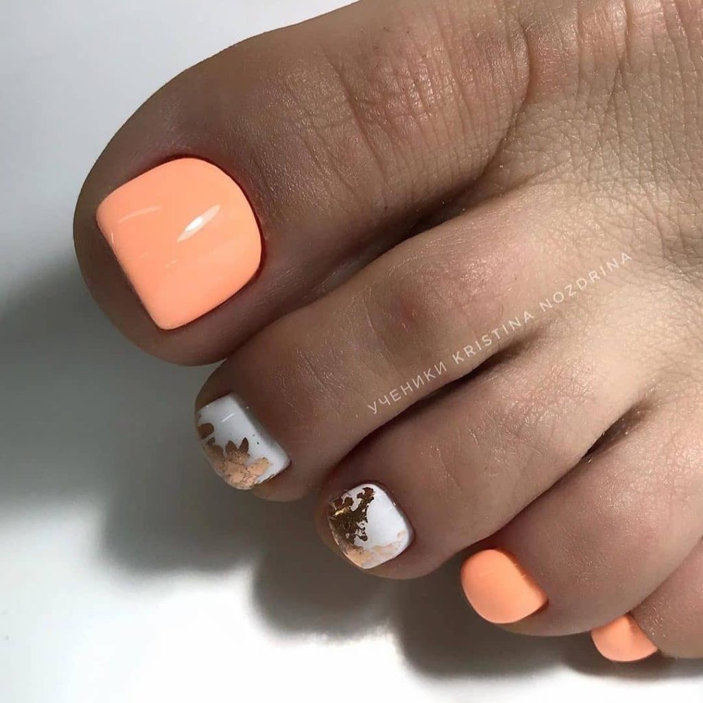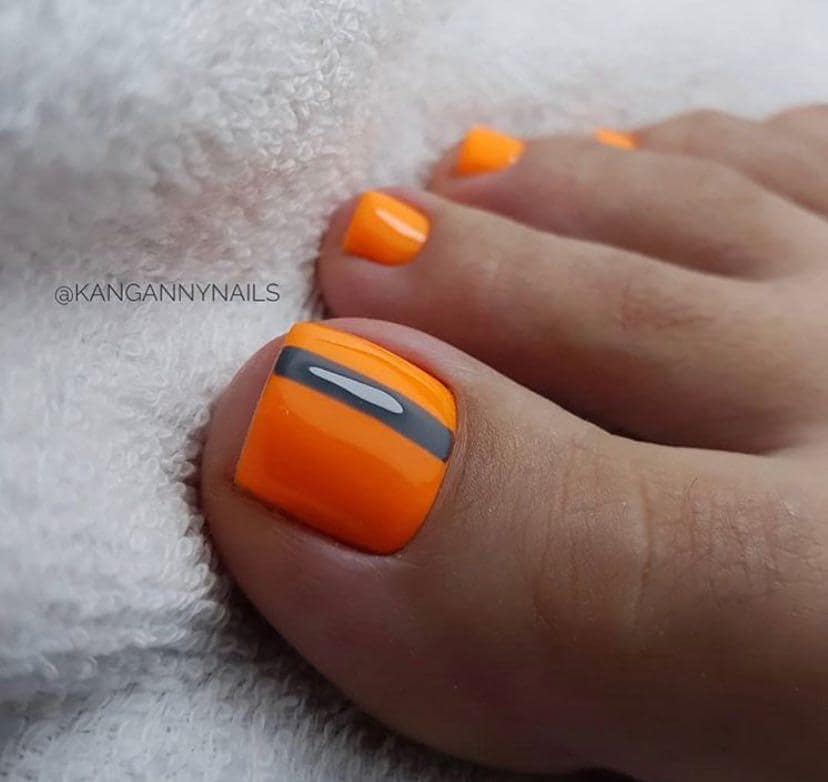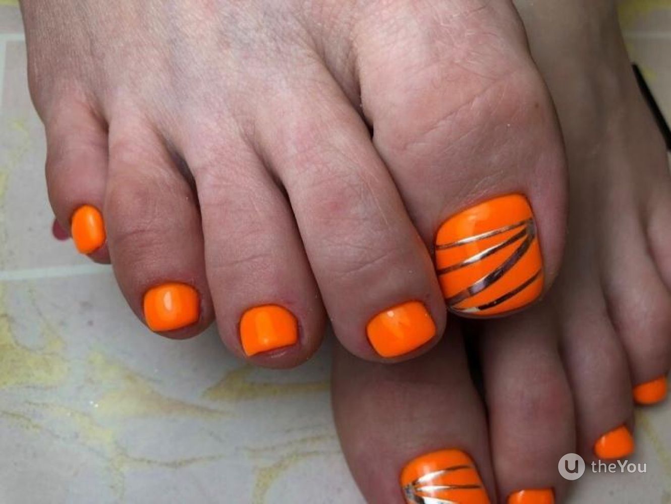 Оранжевый — это, наверное, синоним яркого педикюра. Он отлично смотрится в технике омбре в сочетании с другими цветами. Кроме того, обязательно попробуйте сочетать этот яркий цвет с матовым топом. Вы увидите, как ваши пальчики будут выглядеть стильно и очень дорого. Кроме того, этот удивительный цвет отлично сочетается с любой парой открытой обуви. Но если вы решите сделать оранжевый педикюр зимой или осенью, то он греет вас своим теплом и яркостью. Оранжевый цвет очень активен, поэтому его можно не дополнять декором. Если очень хочется, выбирайте фольгу, слайдеры или минималистичные рисунки.