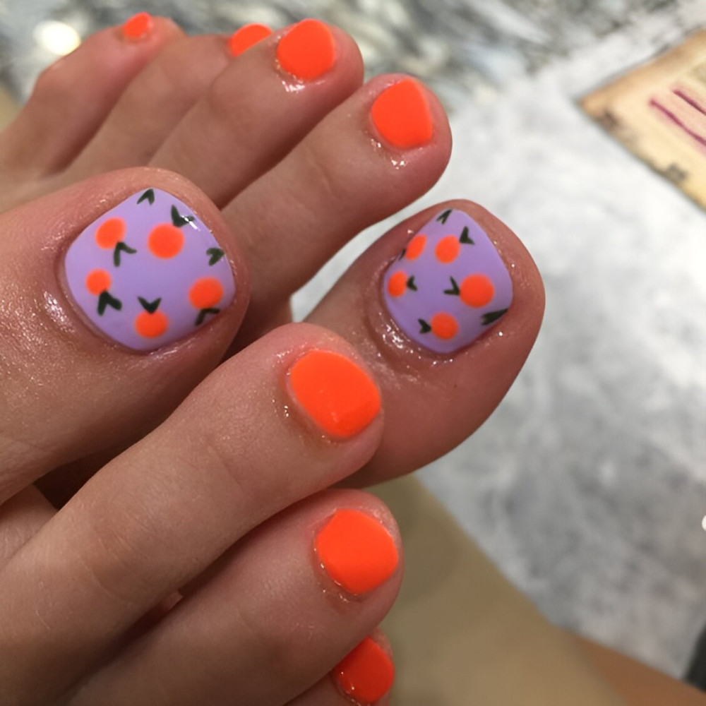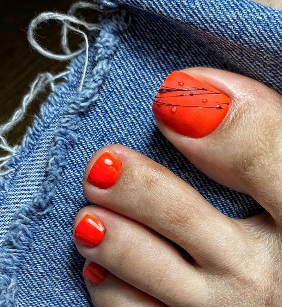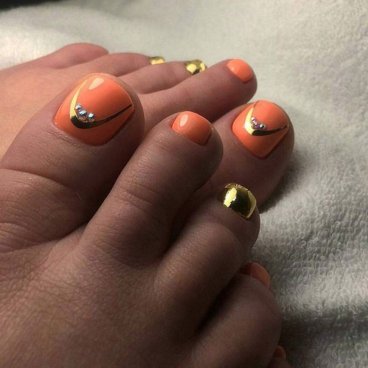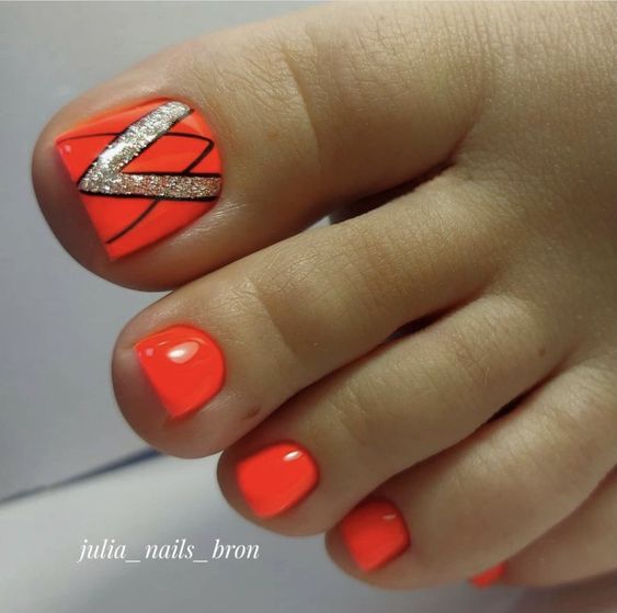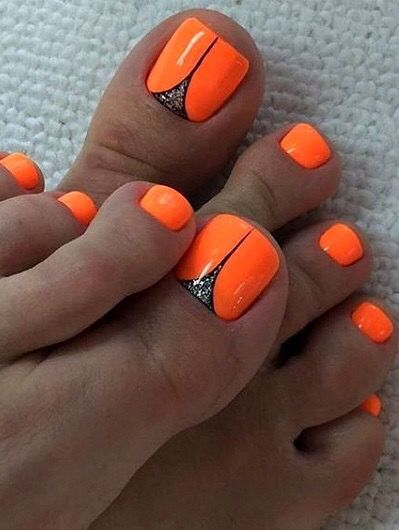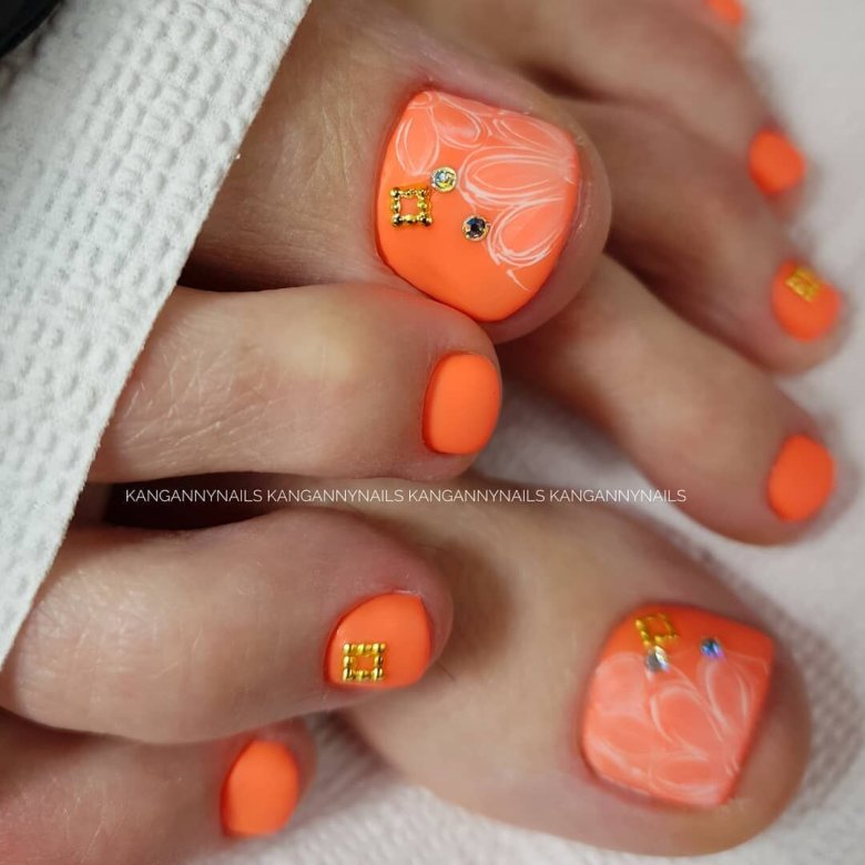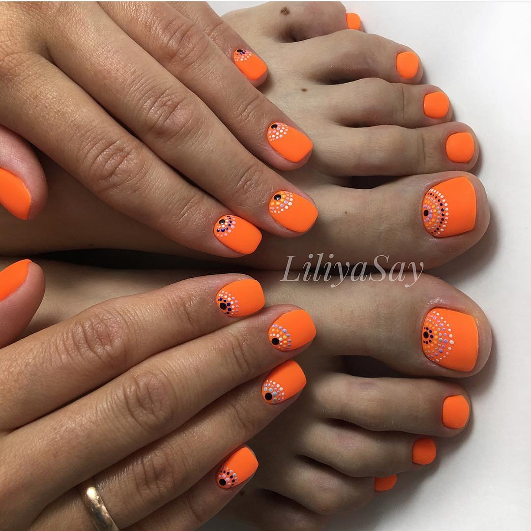 Оранжевый — это, наверное, синоним яркого педикюра. Он отлично смотрится в технике омбре в сочетании с другими цветами. Кроме того, обязательно попробуйте сочетать этот яркий цвет с матовым топом. Вы увидите, как ваши пальчики будут выглядеть стильно и очень дорого. Кроме того, этот удивительный цвет отлично сочетается с любой парой открытой обуви. Но если вы решите сделать оранжевый педикюр зимой или осенью, то он греет вас своим теплом и яркостью. Оранжевый цвет очень активен, поэтому его можно не дополнять декором. Если очень хочется, выбирайте фольгу, слайдеры или минималистичные рисунки.