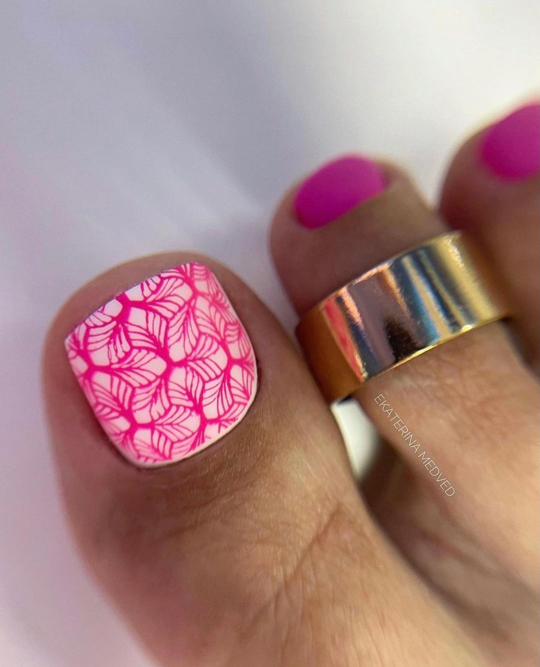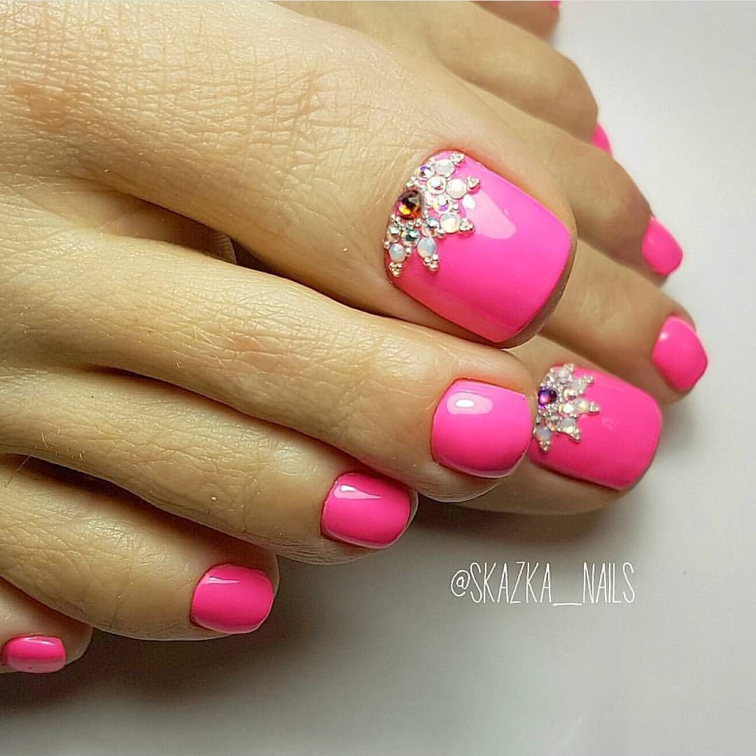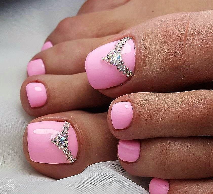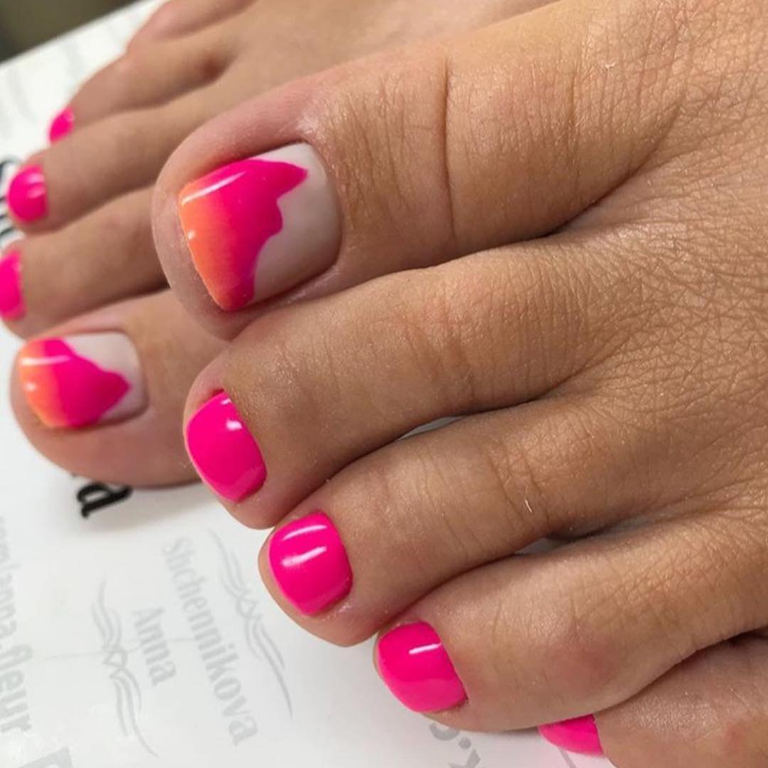 Не менее разнообразная палитра есть и у розового цвета. В этом сезоне мы предлагаем обратить внимание не на романтично и пастельные оттенки она яркие. Например, фуксия или viva magento. Мастера маникюра утверждают, что розовой подходит практически всем оттенкам кожи. И вам не придется долго и мучительно подбирать свой оттенок. Розовый отлично сочетается с лаконичными рисунками в стиле минимализм, а также слайдерами с цветочным принтом. Если вы сторонница классики, то яркий педикюр можно сделать, сочетая технику френч и добавив блестящих акцентов.