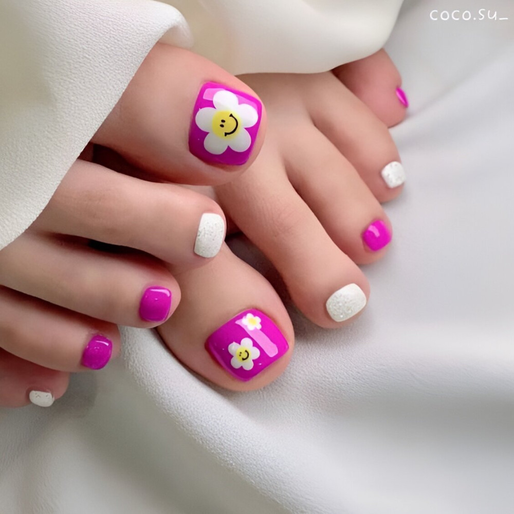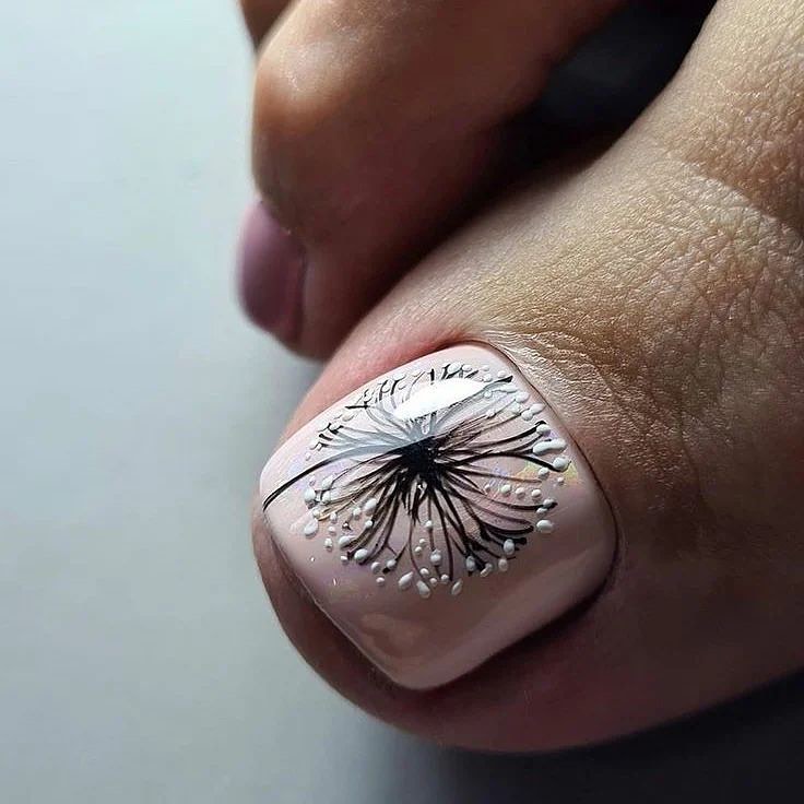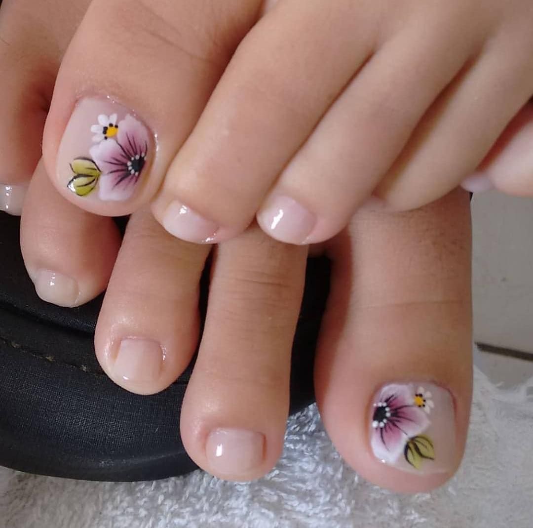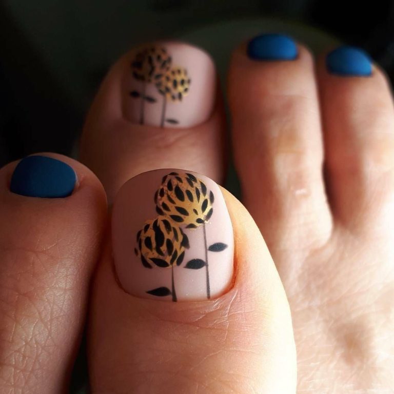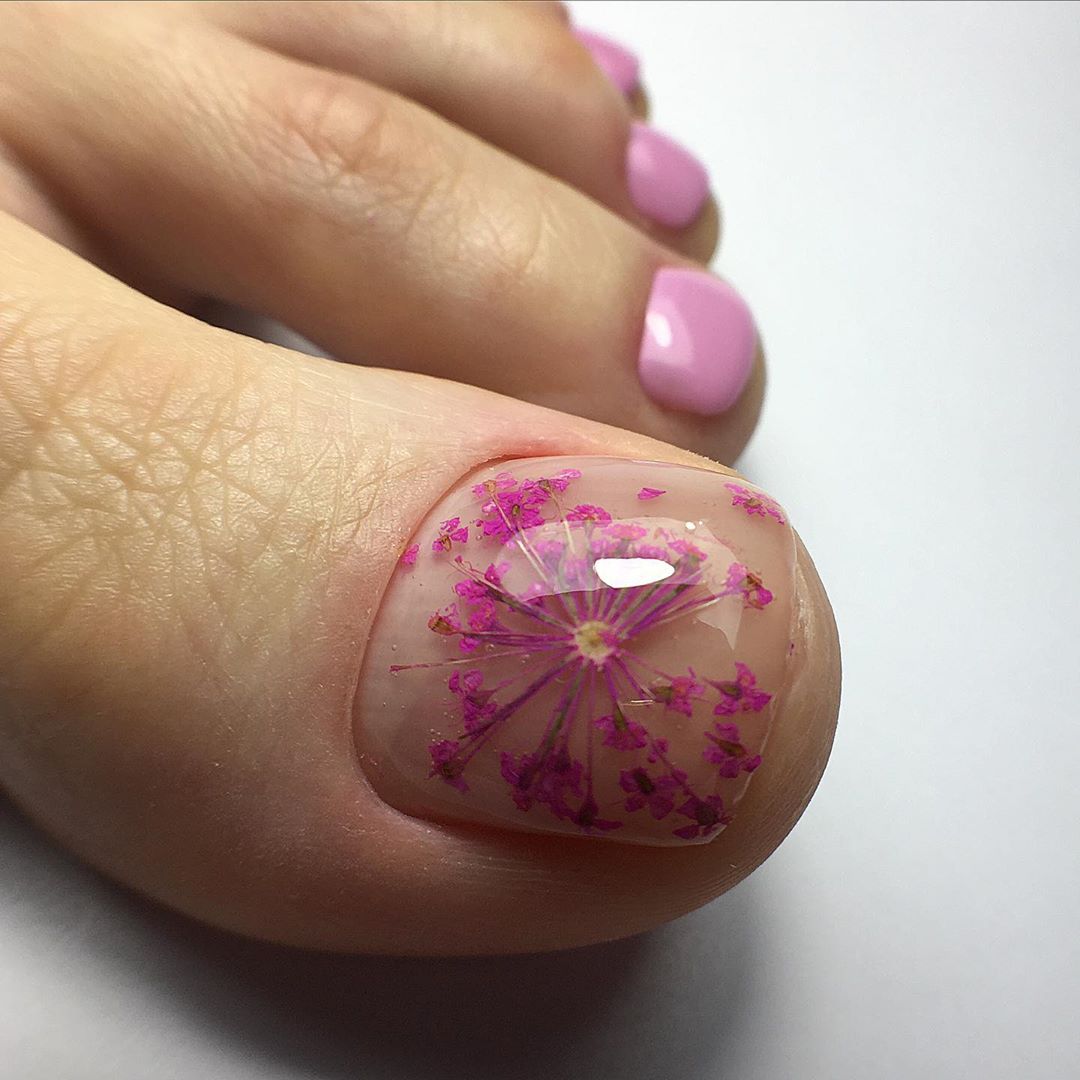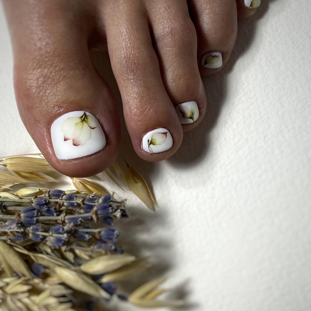 Удивительно, но цветочная тематика популярна не только летом, но и зимой. Причем она не сдает свои позиции с самых первых дней возникновения нейл — арта. Флористика актуальна уже не 1 сезон, но в 2026 году мы рекомендуем рисовать не лепестки и веточки, а цветы. Например, ромашки, незабудки, розы и другие. Попробуйте сделать педикюр с сухоцветами.