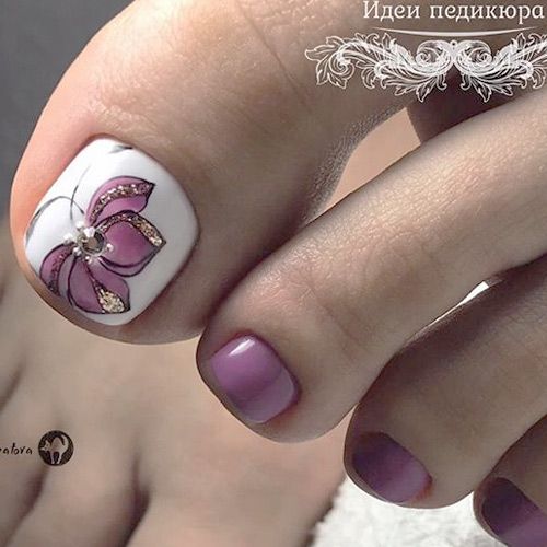 Для создания уникального дизайна можете использовать любую технику. Актуальные очень аккуратно смотрятся, цветочный дизайн в технике стемпинг. Кроме того, можете использовать слайдеры или нарисовать цветы кистью. Цветочный дизайн всегда можно дополнить блестящими стразами, глитером или сухими блестками. Обратите внимание, что яркий педикюр с цветами отлично смотрится в матовом исполнении.