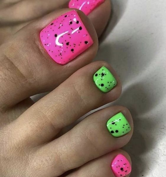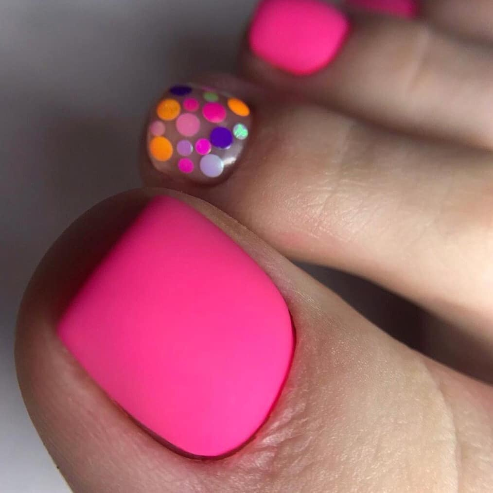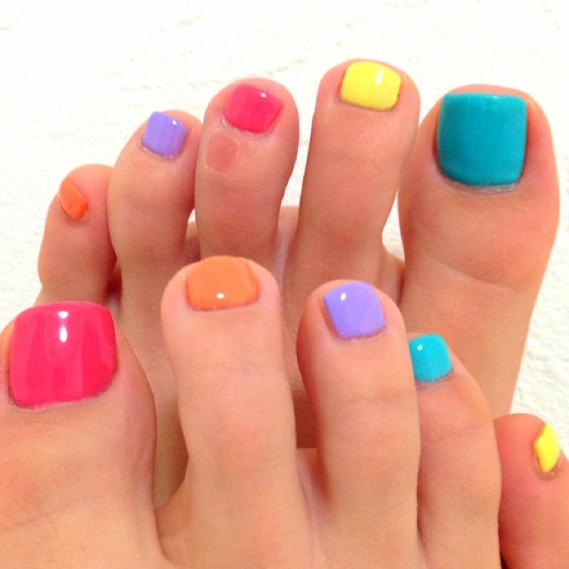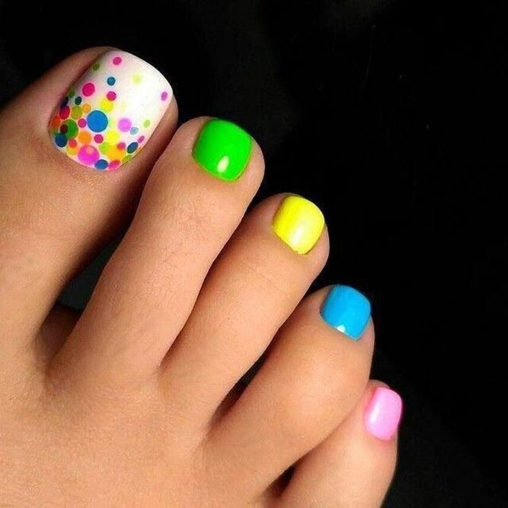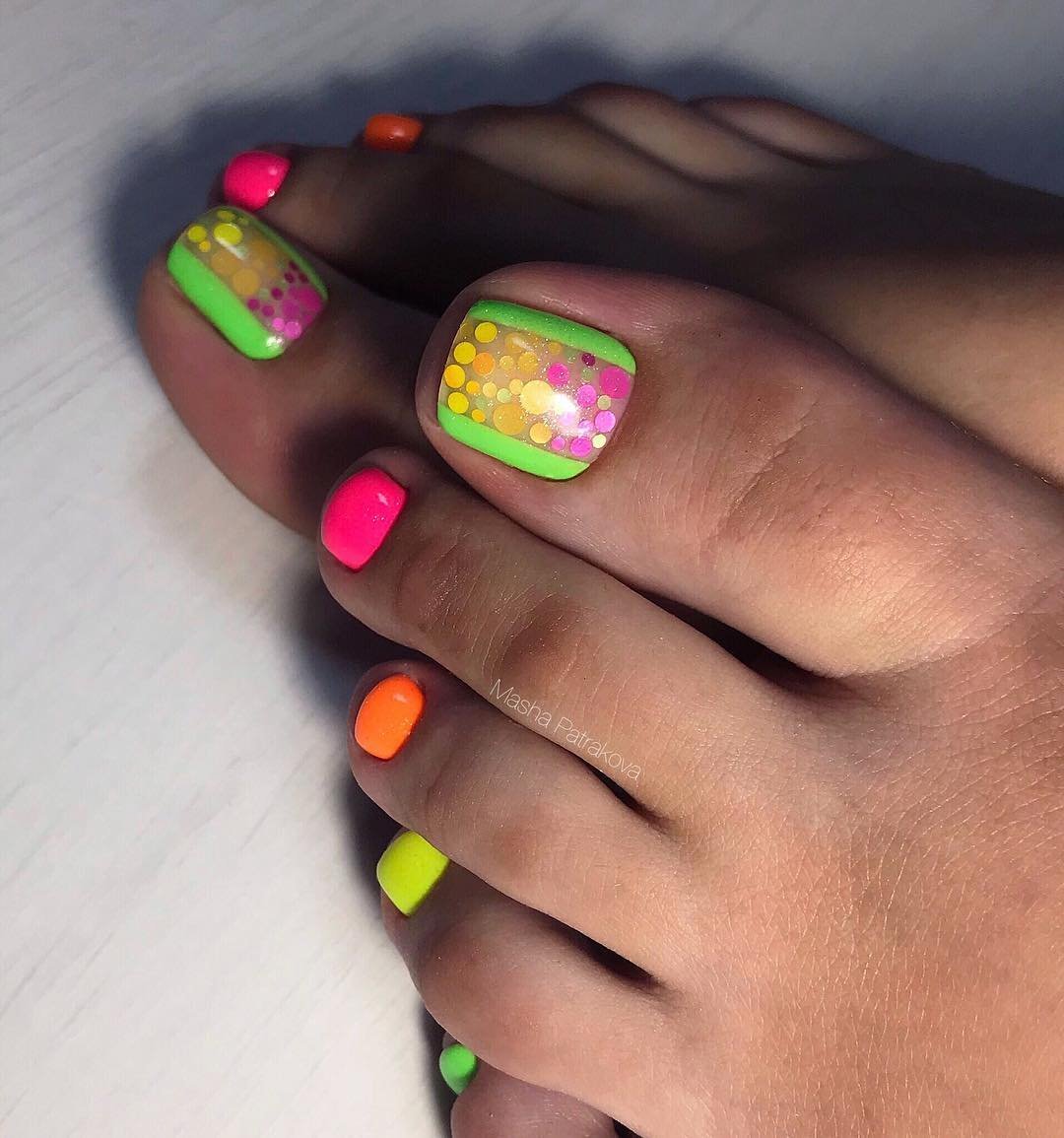 Максимально яркий педикюр можно сделать, если использовать сразу несколько цветов в одном дизайне. Например, два контрастных оттенка, которые будут сочетаться в геометрическом рисунке. Кроме того, можно сделать очень интересный педикюр, френч или лунный. Для этого на базовом лаке вам нужно будет прорисовать улыбку или лунку контрастного оттенка и, возможно, необычной формы. Есть еще одно очень интересное решение. Для каждого ноготка на ноге, вам нужно будет выбрать свой оттенок. Конечно же, очень красивый и яркий. Такой разноцветный дизайн мы можем отнести к универсальным. Ведь любой оттенок лака будет хорошо сочетаться с любой парой обуви. Если, конечно, вы правильно их подберете.