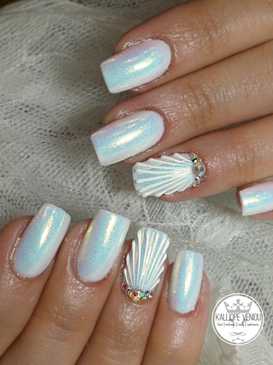 Mermaid Nails с жемчужным эффектом — это изысканный и роскошный стиль маникюра, вдохновленный магией морской русалки и ее неповторимым блеском. Этот дизайн создает эффект жемчужной поверхности на ногтях, придавая им утонченный и элегантный вид.