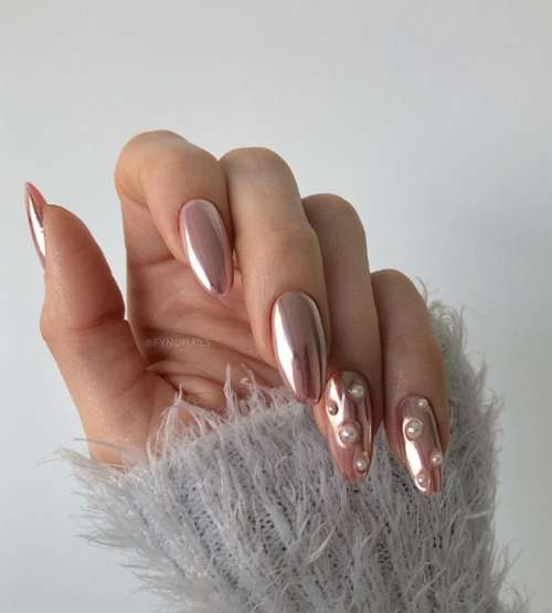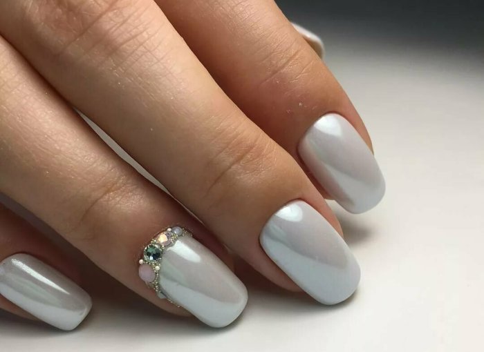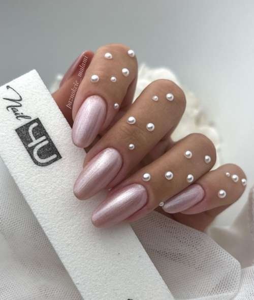 - декоративные элементы. Жемчужный маникюр можно дополнить декоративными элементами, такими как стразы, стеклярус, наклейки с жемчужинами или металлическими вставками;