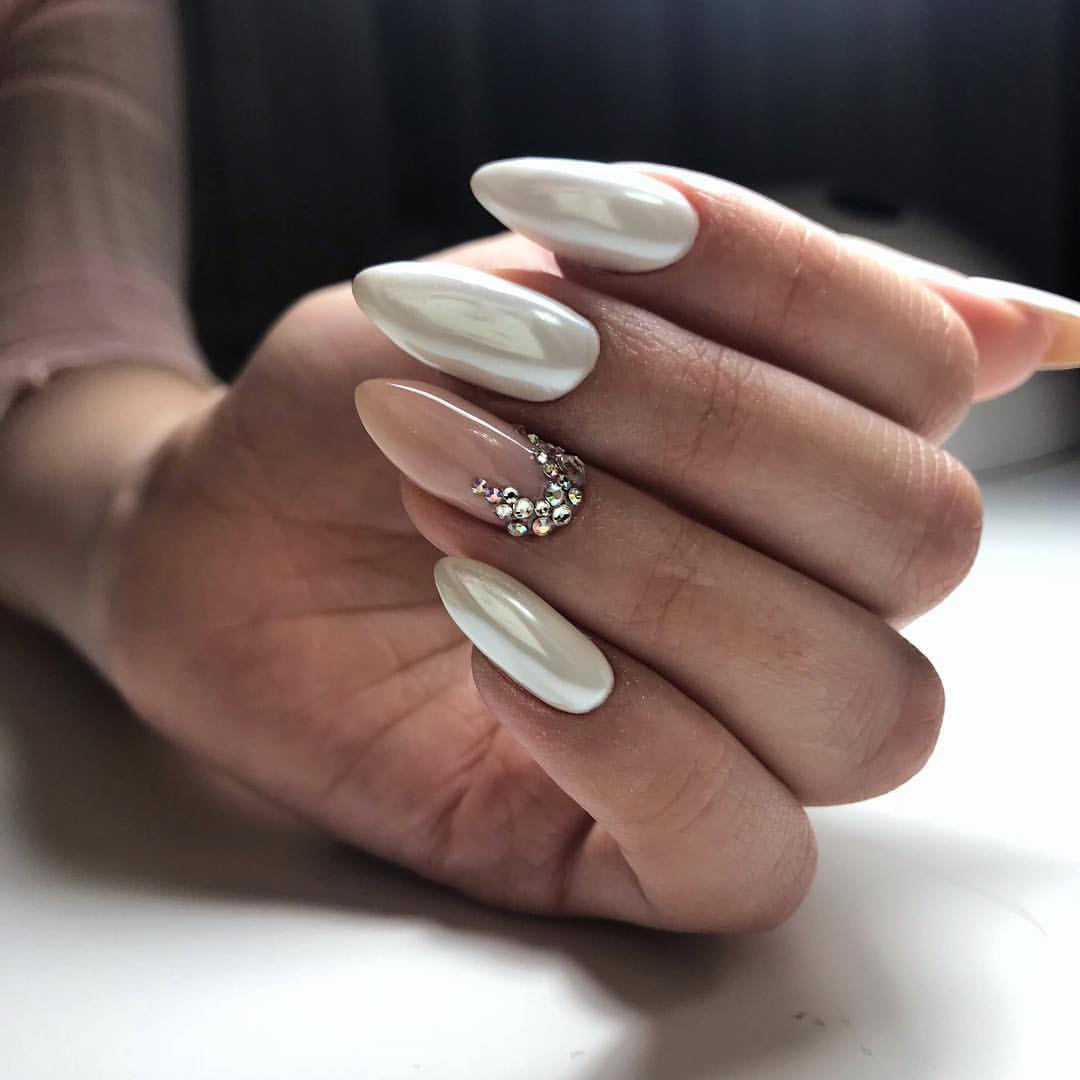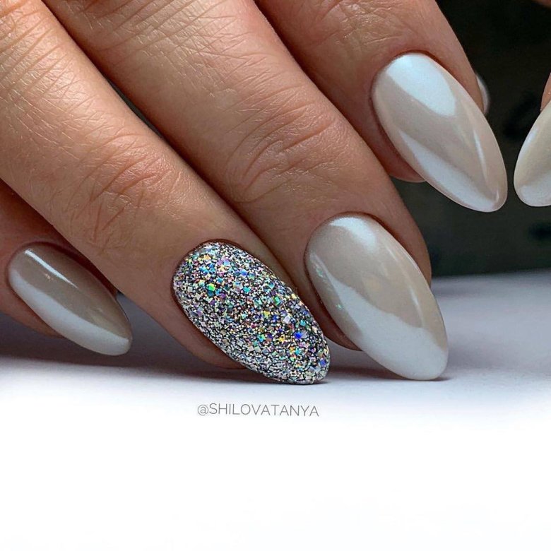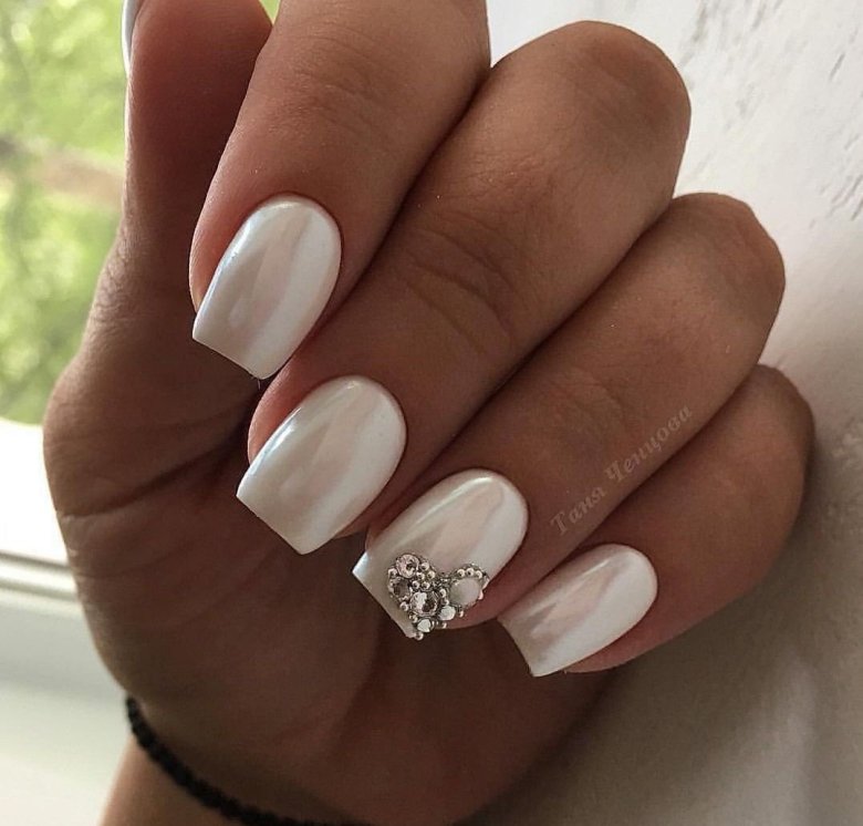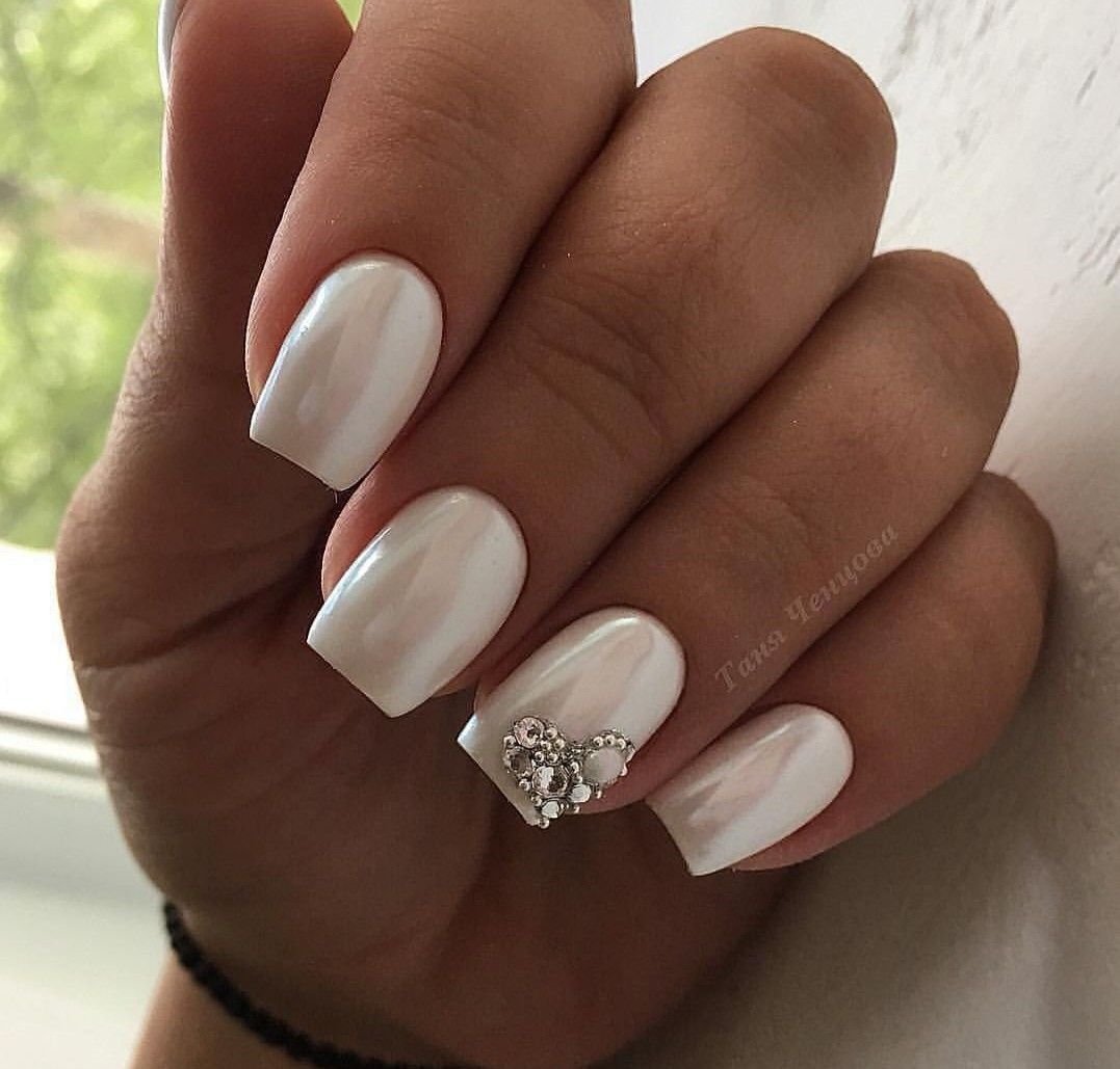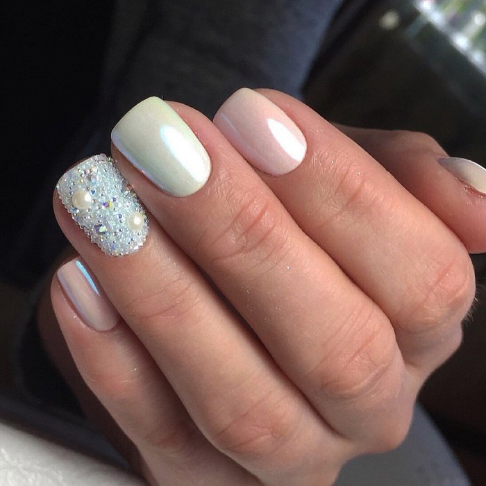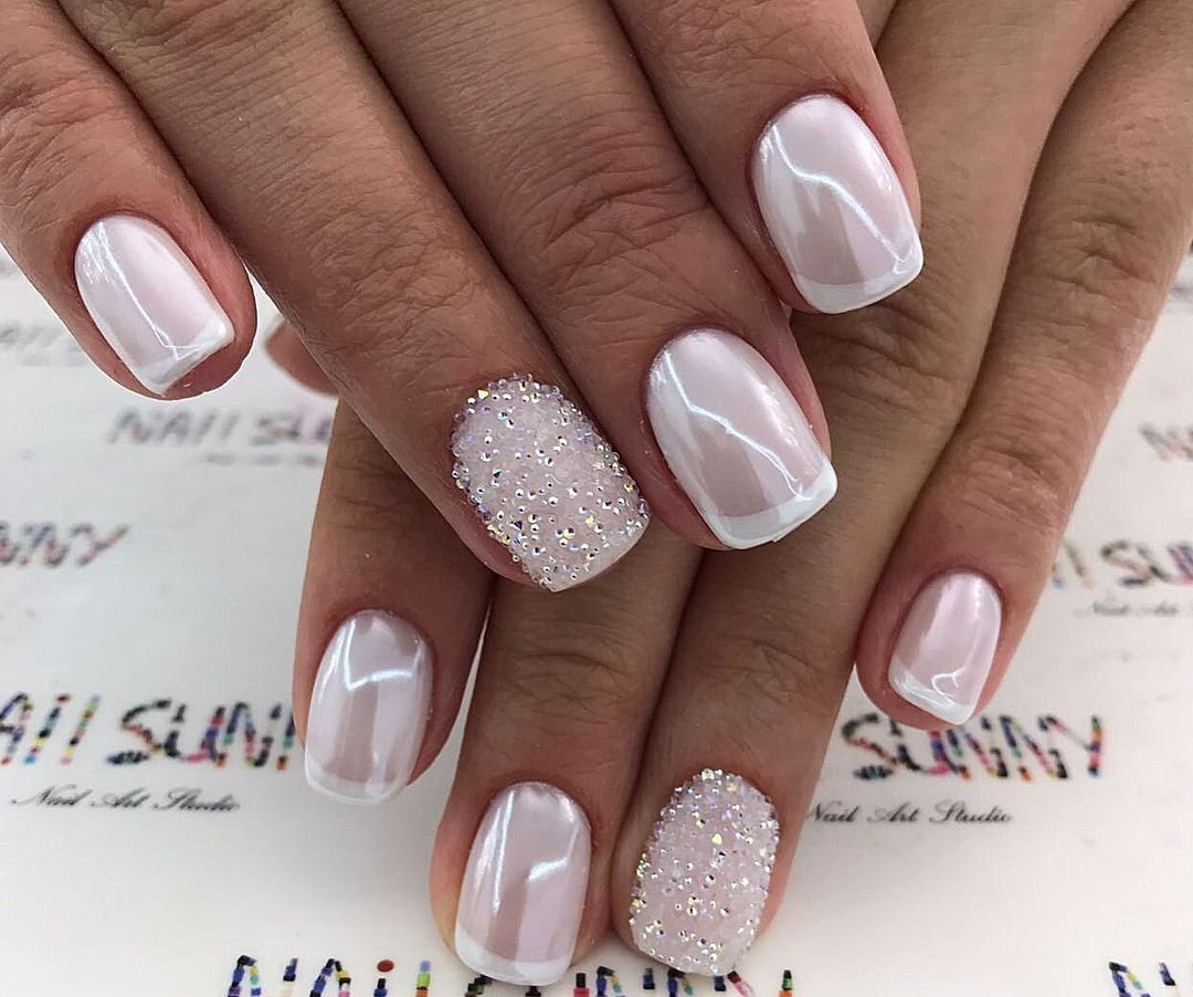 - с акцентом на «белое платье» ногтей. Создайте жемчужный маникюр с акцентом на «белое платье» ногтей, то есть нанесите блестки на края ногтей, создавая эффект подобный подолу свадебного платья;