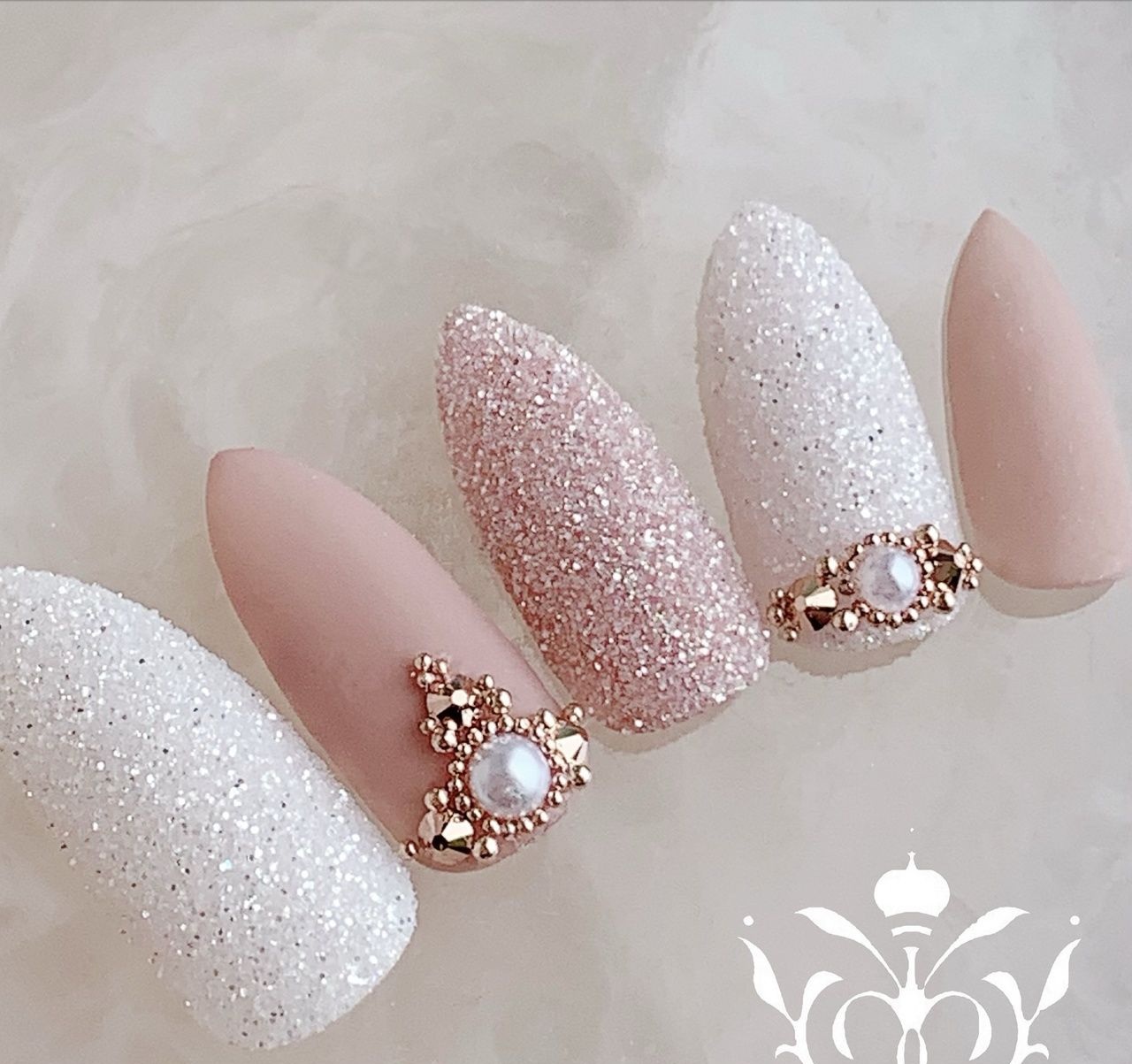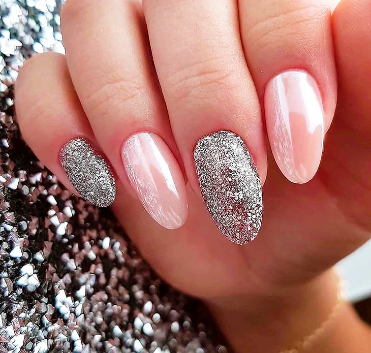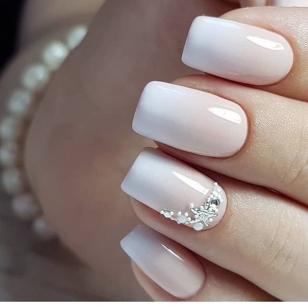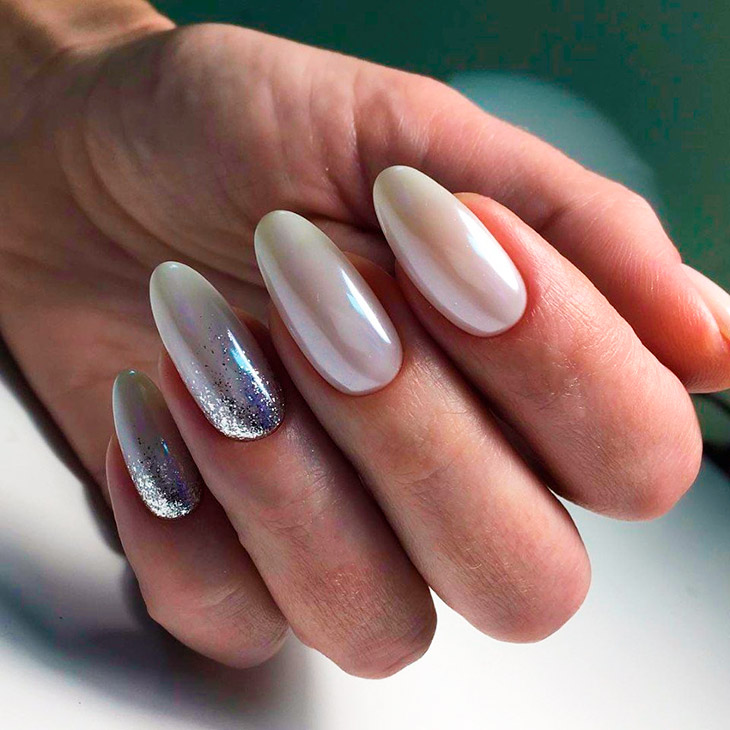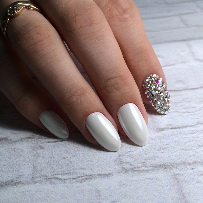 - с акцентом на «белое платье» ногтей. Создайте жемчужный маникюр с акцентом на «белое платье» ногтей, то есть нанесите блестки на края ногтей, создавая эффект подобный подолу свадебного платья;