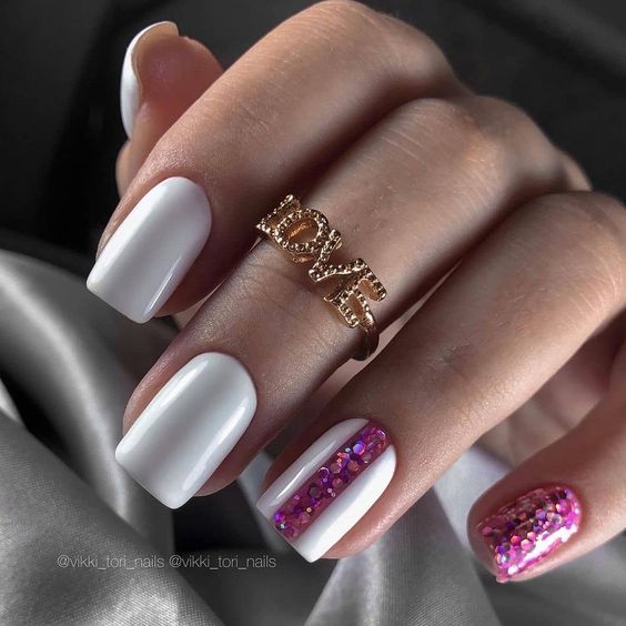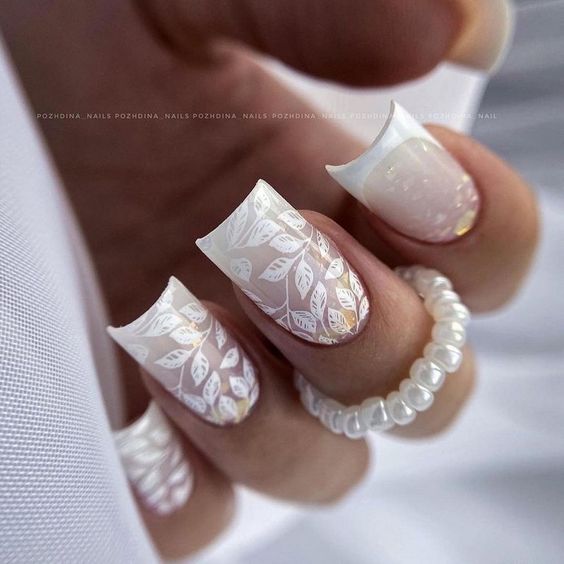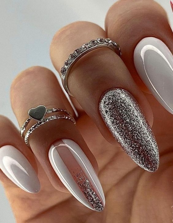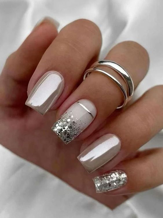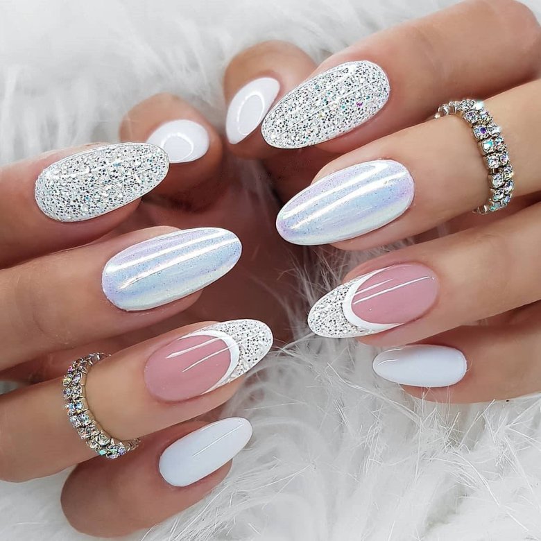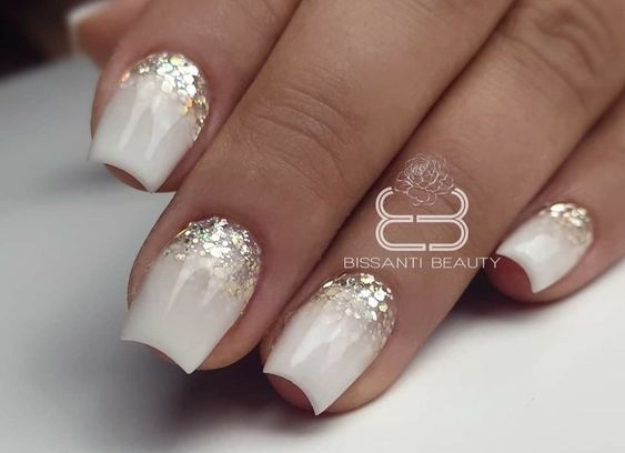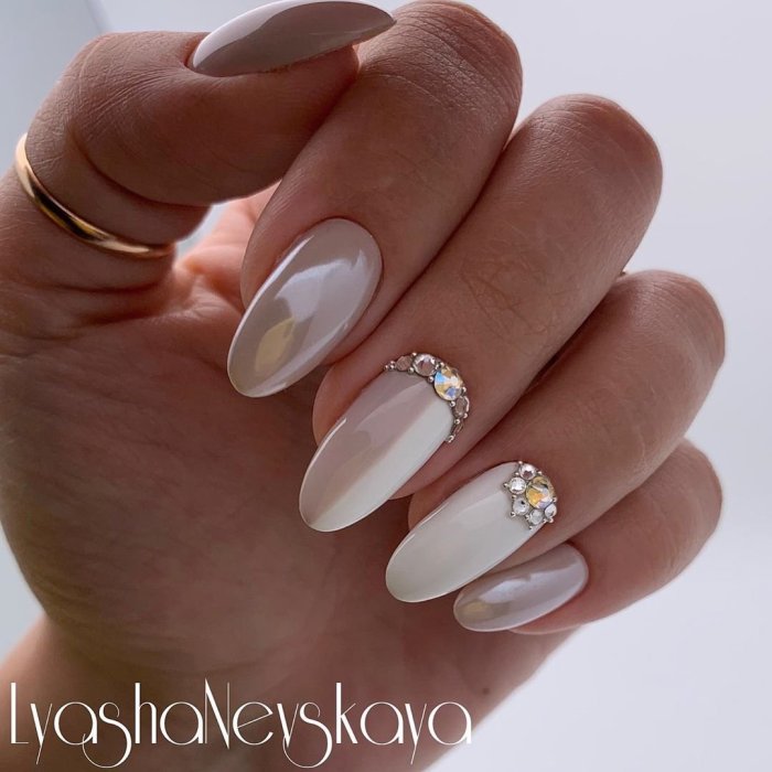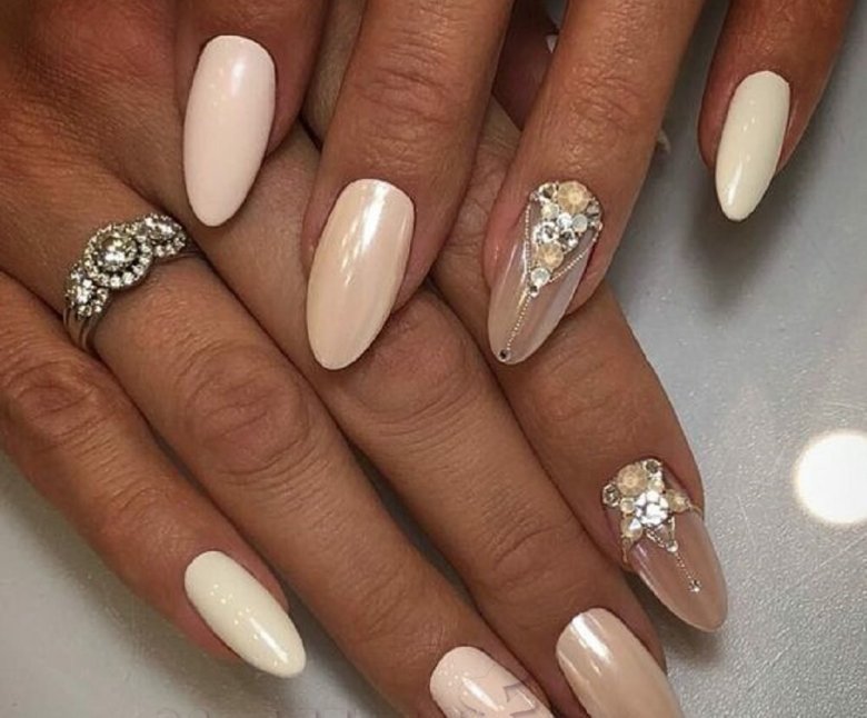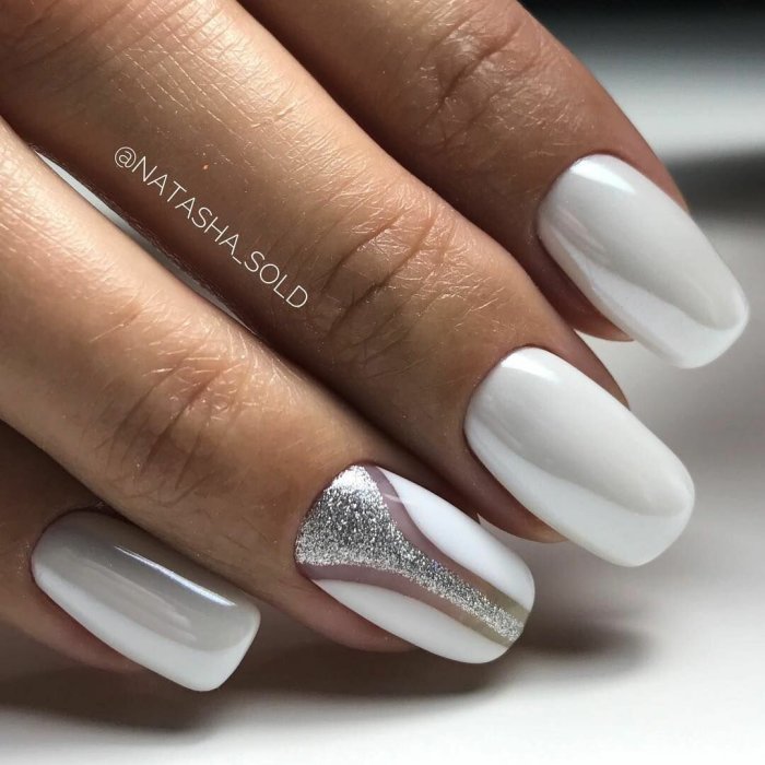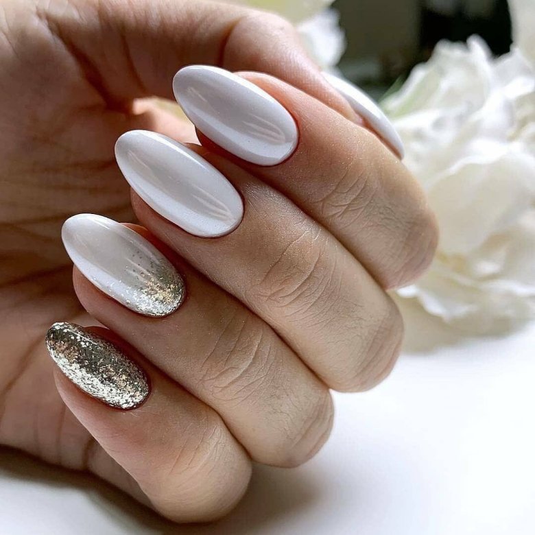 - с акцентом на «белое платье» ногтей. Создайте жемчужный маникюр с акцентом на «белое платье» ногтей, то есть нанесите блестки на края ногтей, создавая эффект подобный подолу свадебного платья;