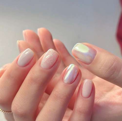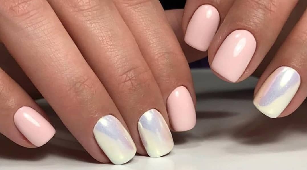 - выбор цвета для коротких ногтей. Основной элемент жемчужного маникюра — это нежные и перламутровые оттенки. Выберите пастельные или нейтральные цвета, такие как белый, светло-розовый, серый, бледно-голубой и другие аналогичные оттенки;