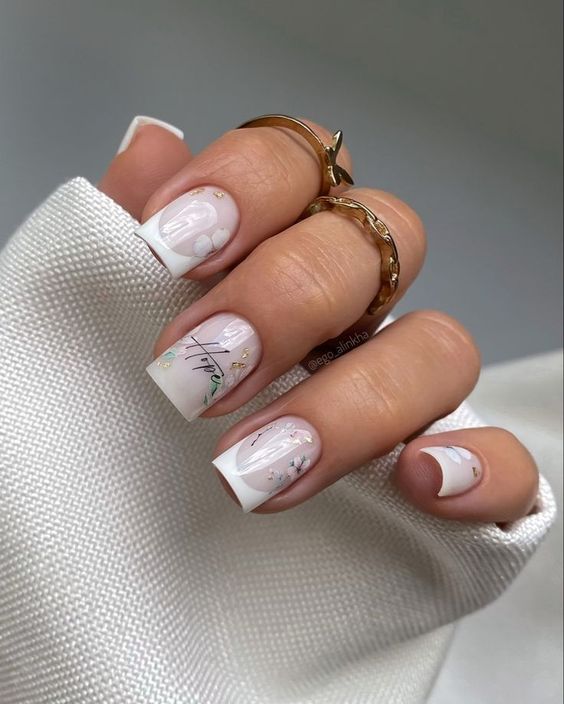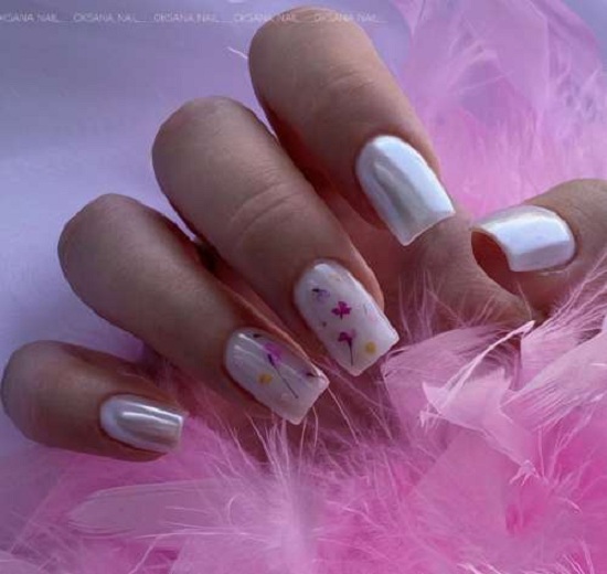 Маникюр, объединяющий нежные сухоцветы и эффект жемчужной втирки, создает уникальный и романтичный дизайн, который привлекает внимание своей изысканной красотой. Этот стильный маникюр сочетает в себе естественность с изысканностью и идеально подходит для особых моментов.