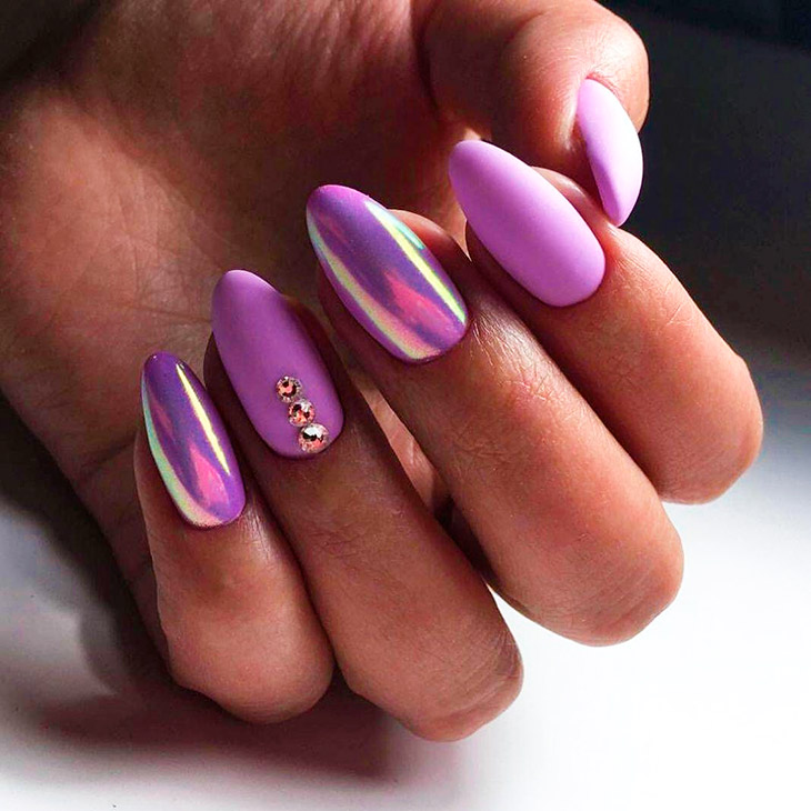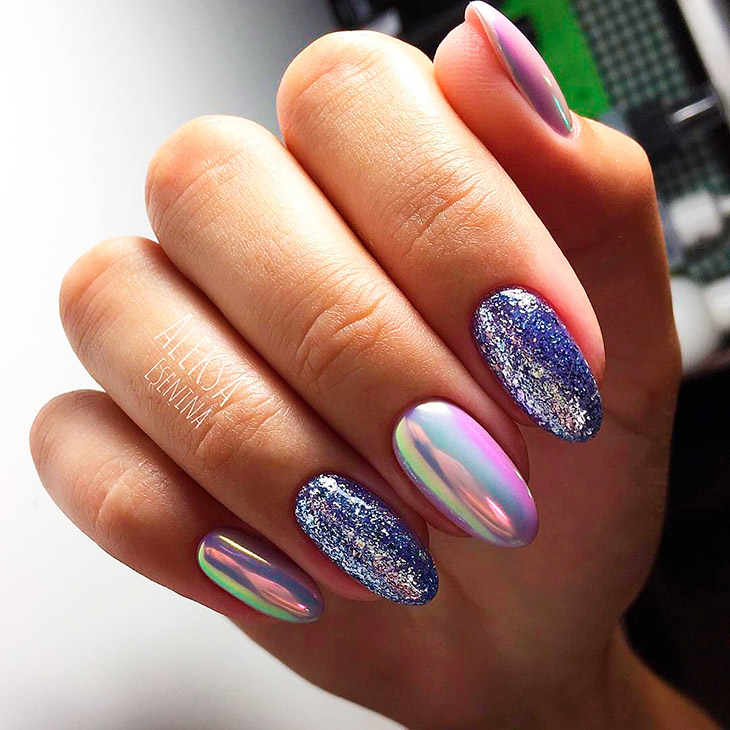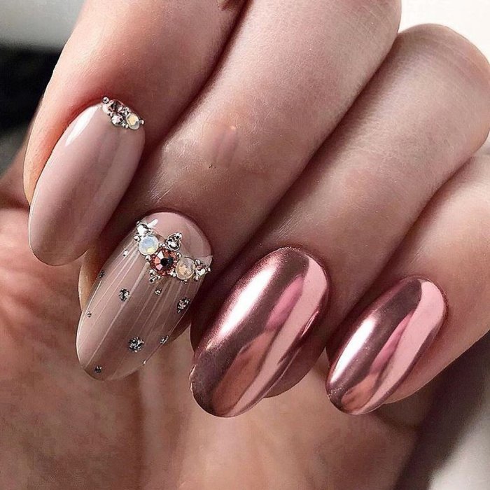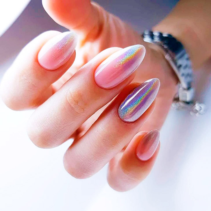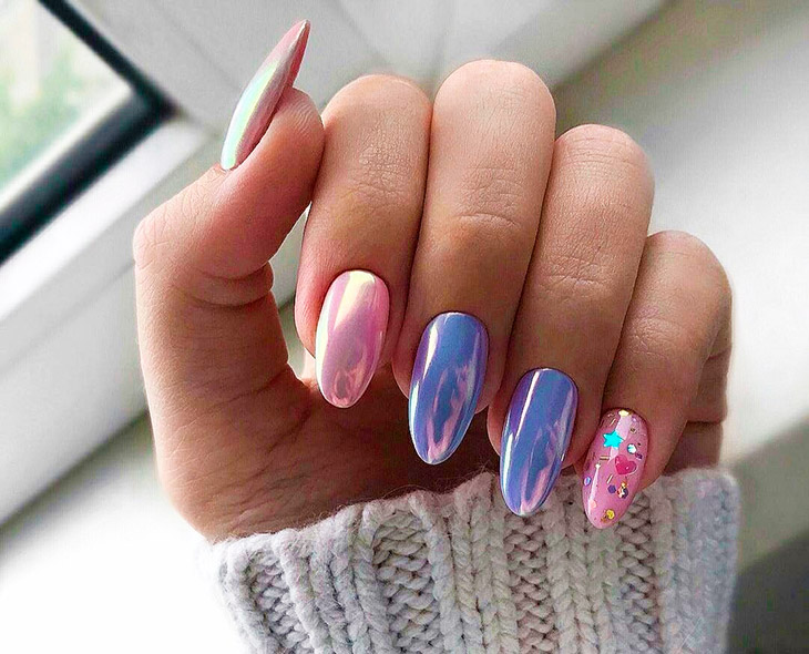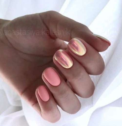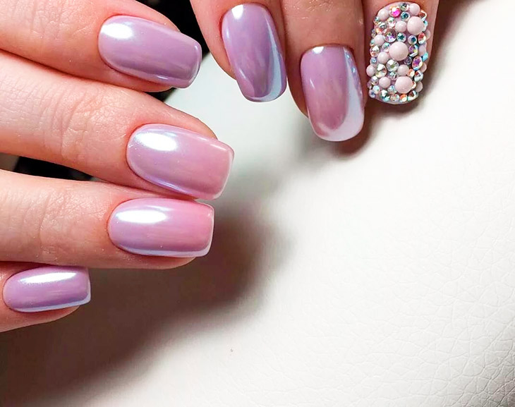 - акцентный ноготь. Выделите один или несколько ногтей более ярким и насыщенным перламутровым оттенком, чтобы создать акцент и привлечь внимание;