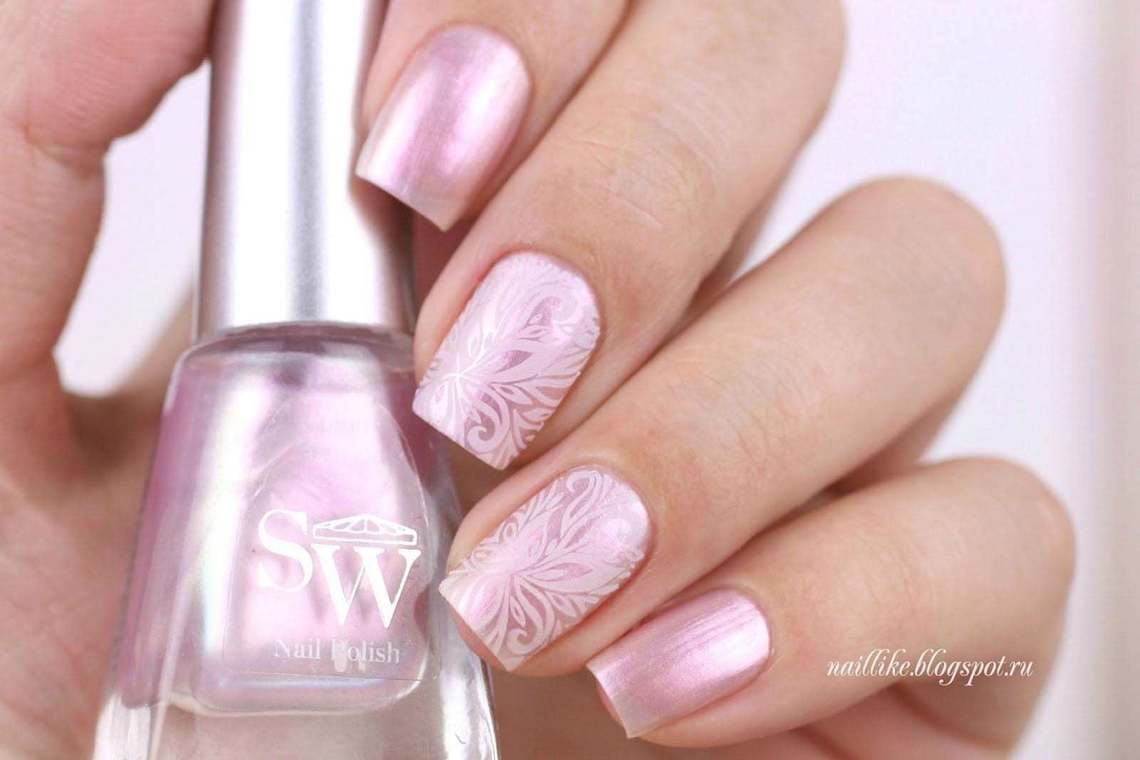 - цветовая палитра. Жемчужный маникюр часто выполнен в нежных и пастельных цветах, напоминающих оттенки жемчуга: белый, перламутровый, розовый, бледно-голубой и другие подобные оттенки;