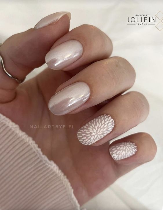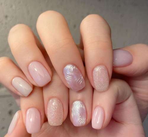 - игра текстур. Чтобы усилить эффект жемчужности, можно использовать различные текстуры и финиши. Например, комбинировать матовые и перламутровые покрытия на разных ногтях;