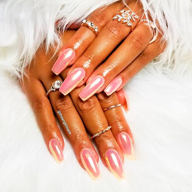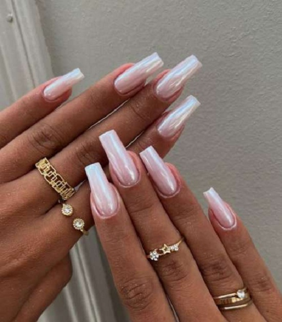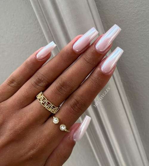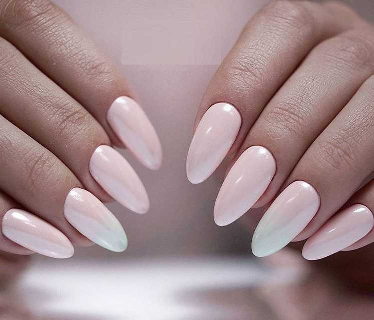 - градиент и эффект «мокрых ногтей». Эти техники могут прекрасно сочетаться с жемчужным маникюром на длинных ногтях, добавляя интересных текстур и переливов.