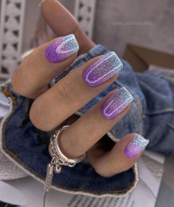 Обычно используется спонж для создания градиента. Каждый ноготь может быть украшен своим уникальным цветовым сочетанием, либо же градиент может повторяться на всех ногтях.