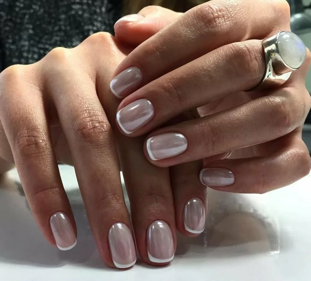 - френч-маникюр. Френч с перламутровыми кончиками — отличный способ сочетания классики и жемчужного дизайна. Проявите креативность, играя с цветами кончиков и основы. Для коротко длины подойдут тонкие варианты улыбки;