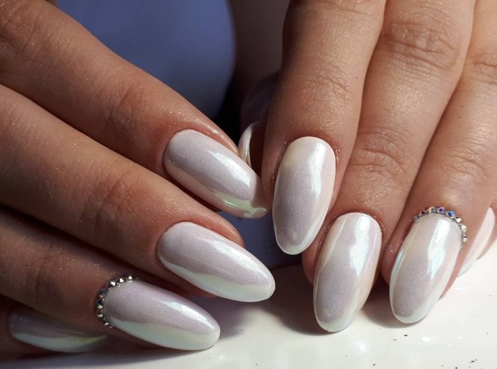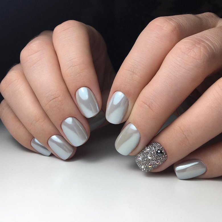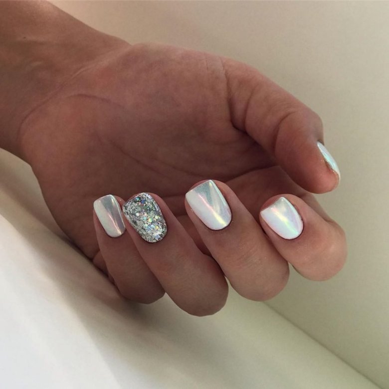 - использование жемчужных блесток. Основная особенность жемчужного маникюра — использование мелких жемчужных блесток или пудры, которые придают ногтям нежное перламутровое сияние;