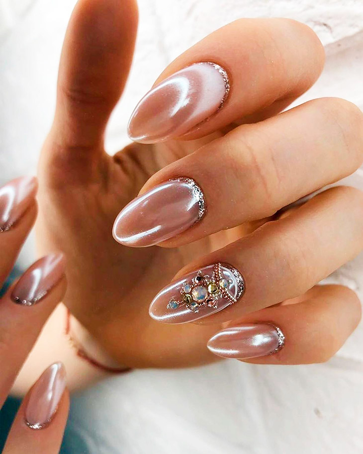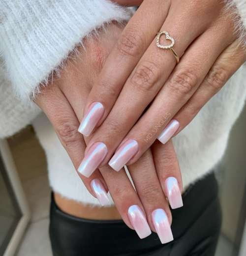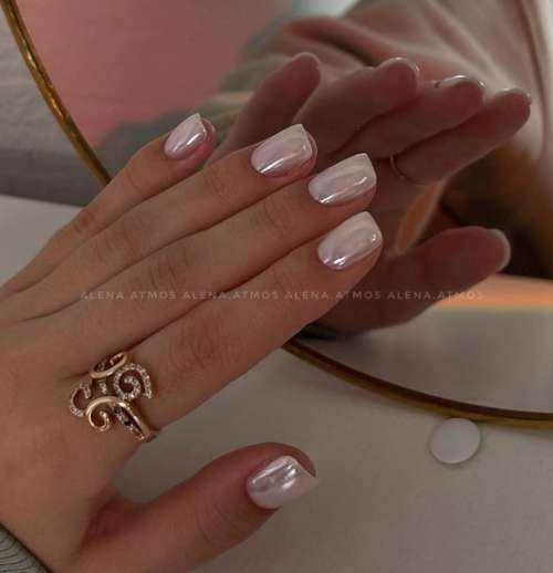 - градиентный эффект. Мастера могут создать градиентный эффект, плавно переходящий от основы к жемчужному оттенку на кончиках ногтей. Это придает маникюру дополнительную глубину и изысканность;