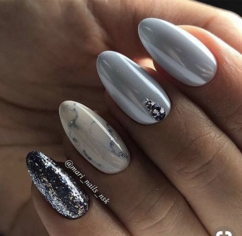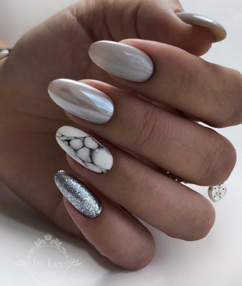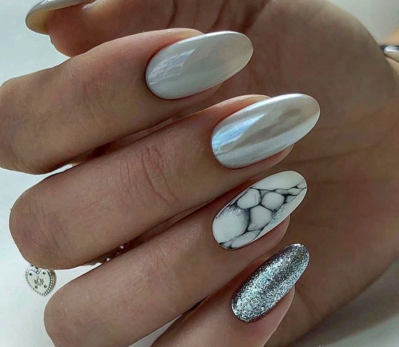 - творческие комбинации. Блогеры часто экспериментируют с жемчужным маникюром, сочетая его с другими популярными трендами, такими как мраморный дизайн, геометрия или абстрактные узоры;
