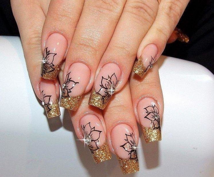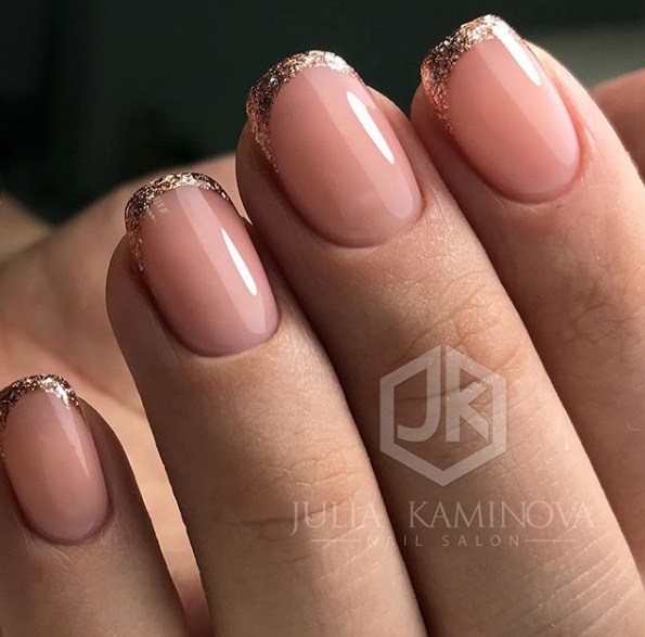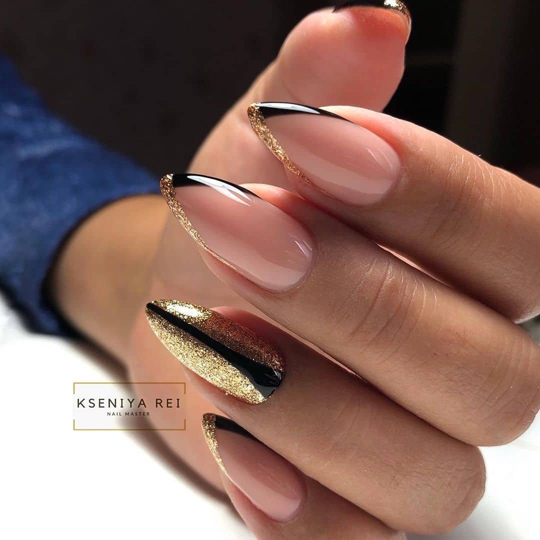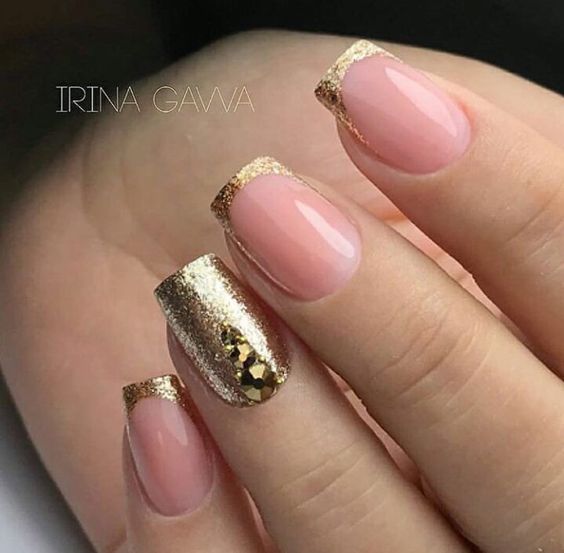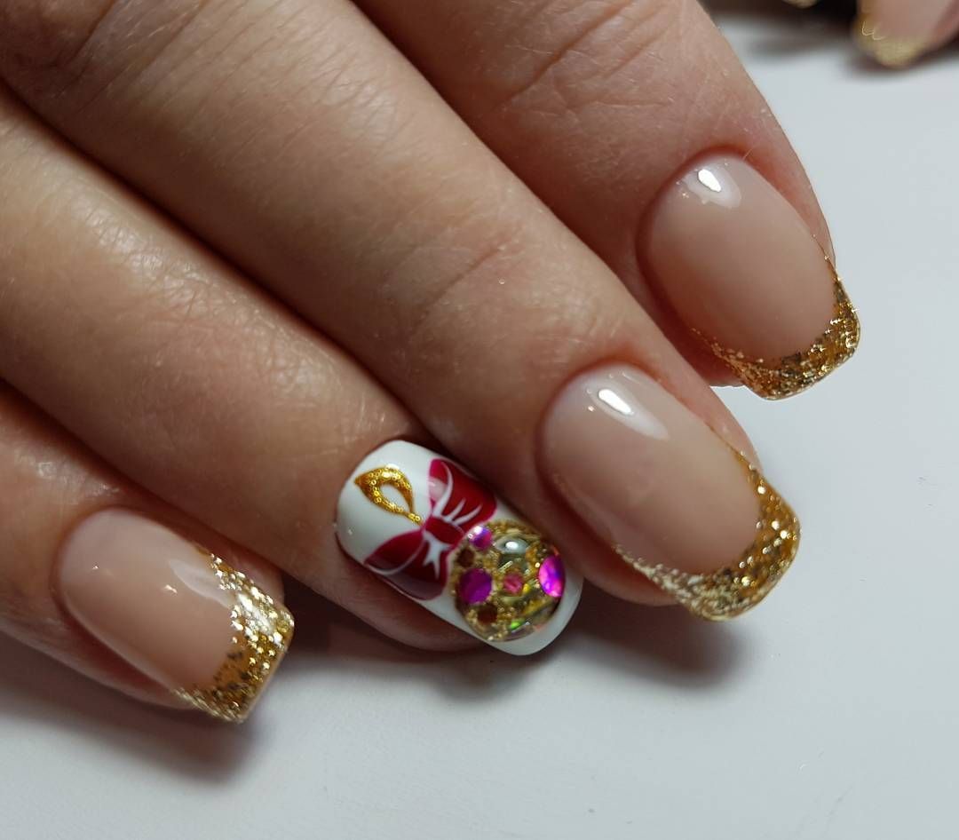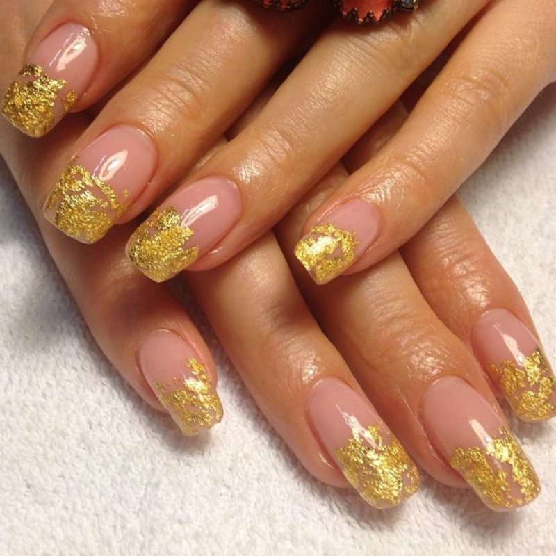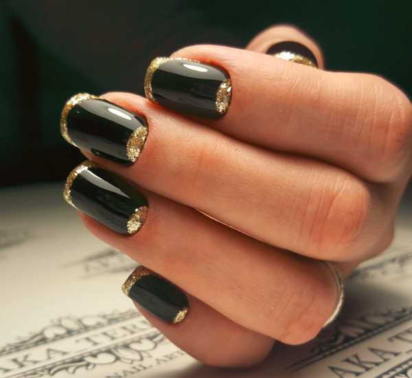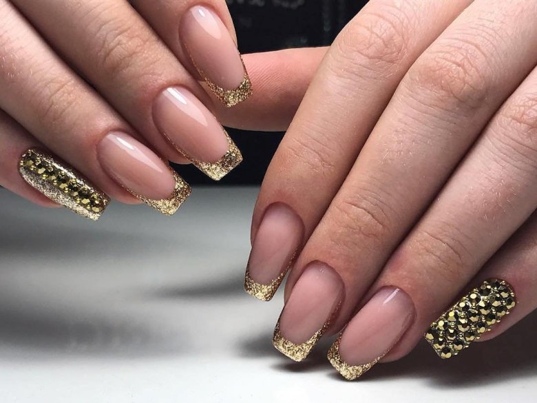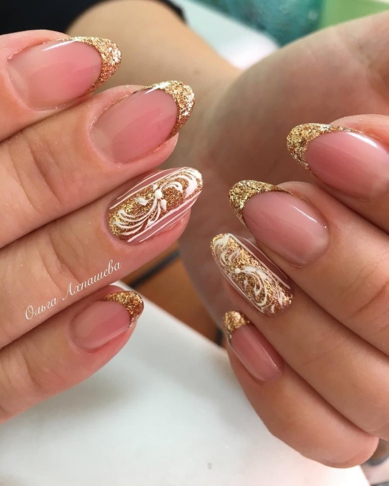 - золотой лак или глиттер на кончиках ногтей, придающий им блестящий и изысканный вид.