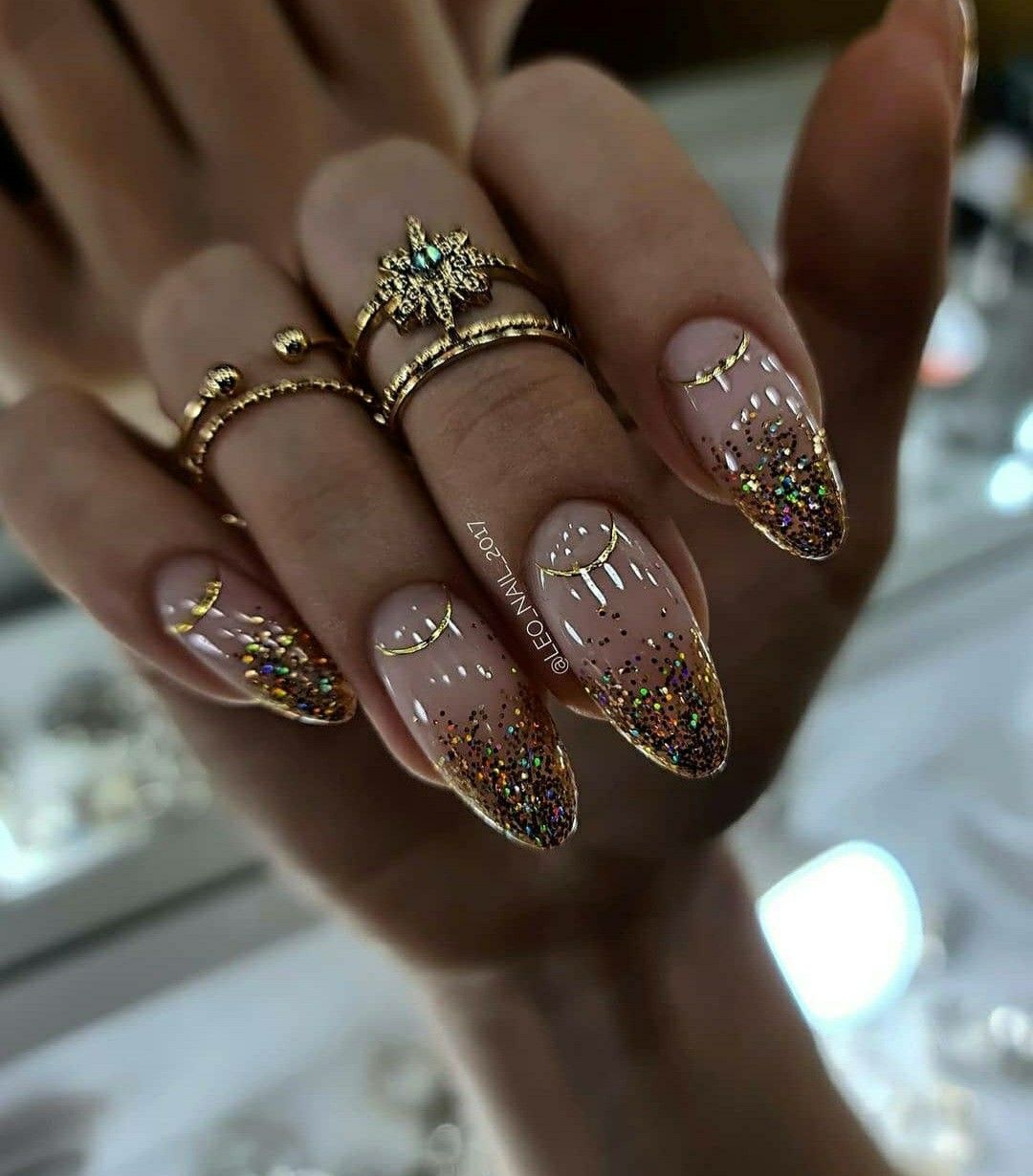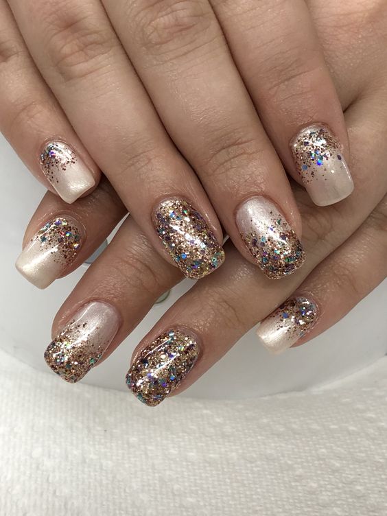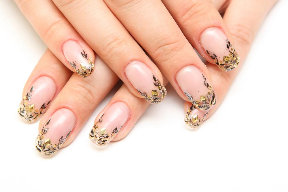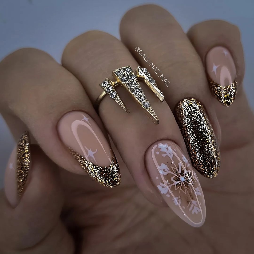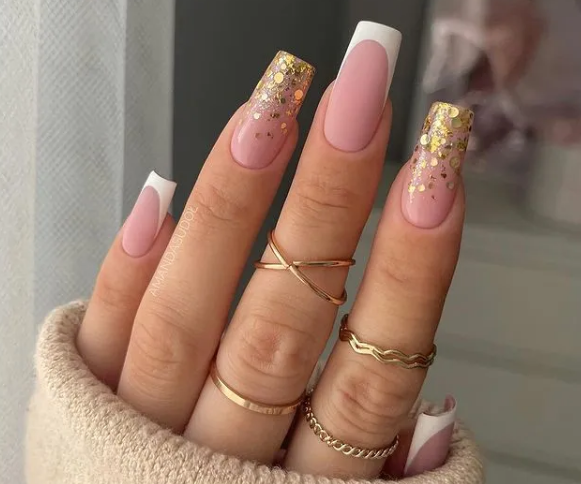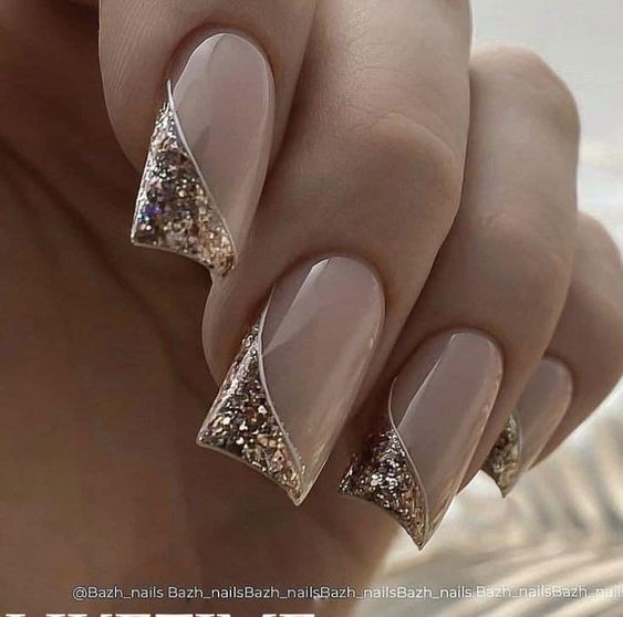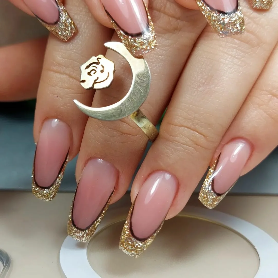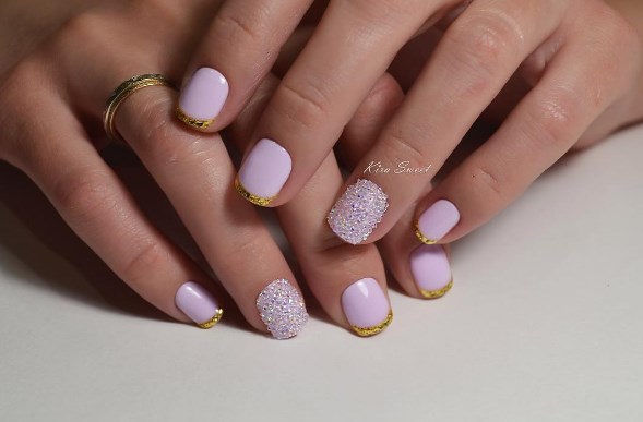 - золотой лак или глиттер на кончиках ногтей, придающий им блестящий и изысканный вид.