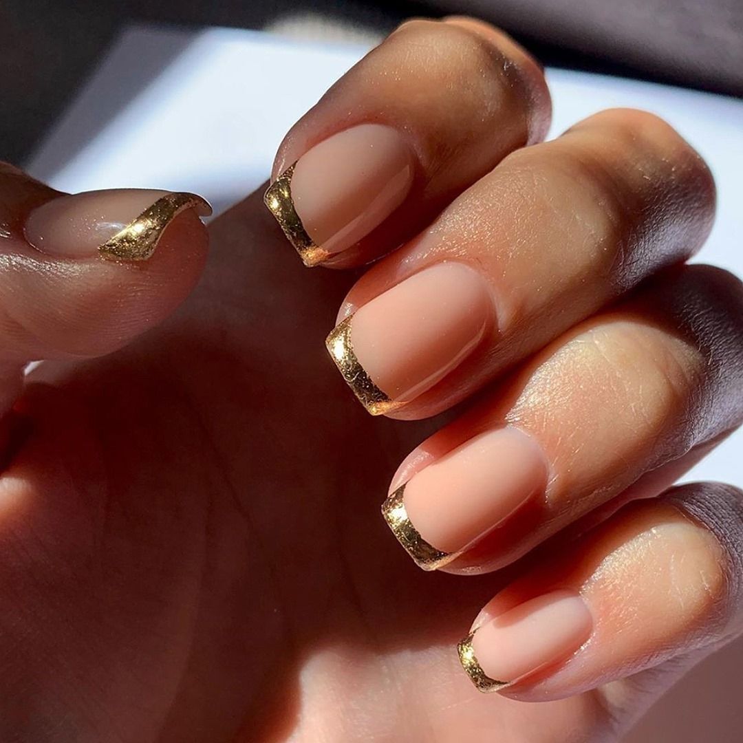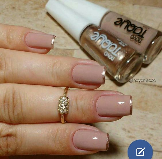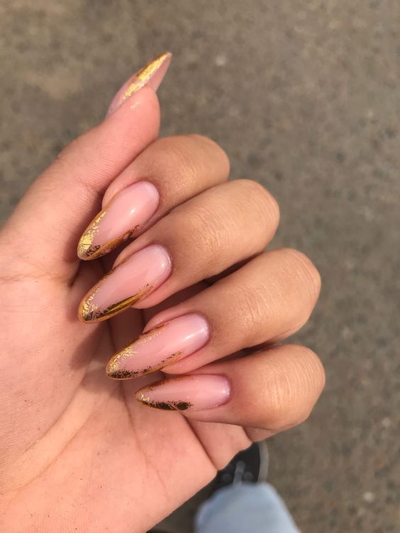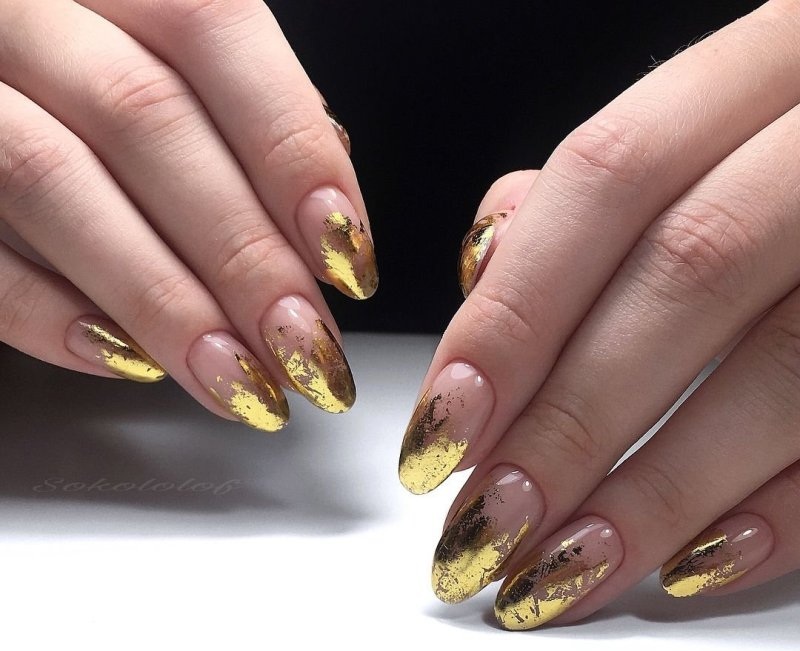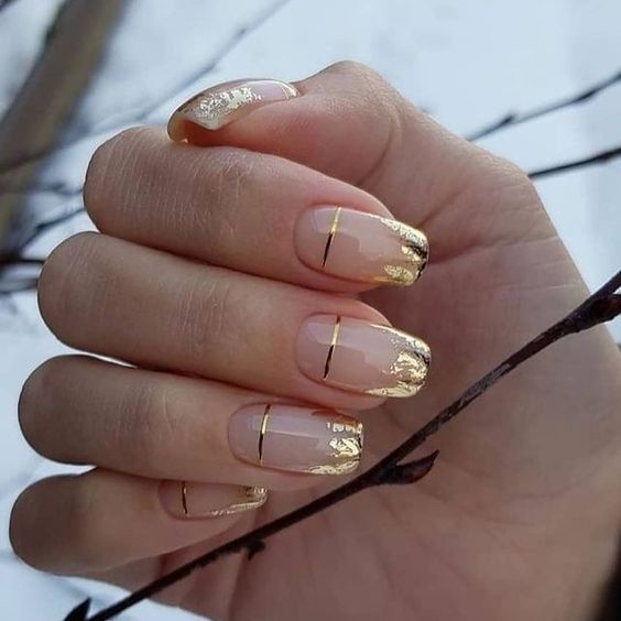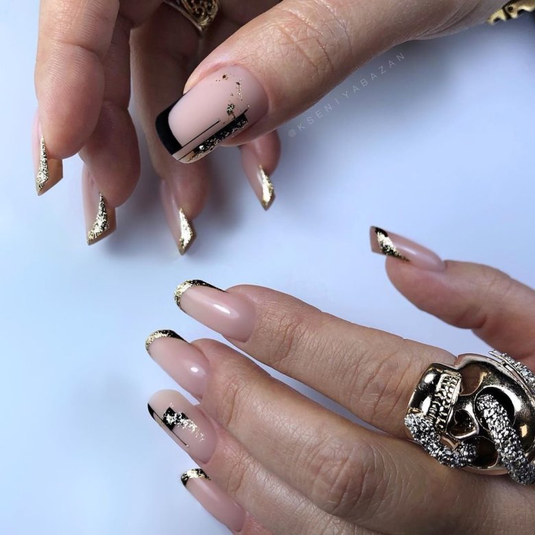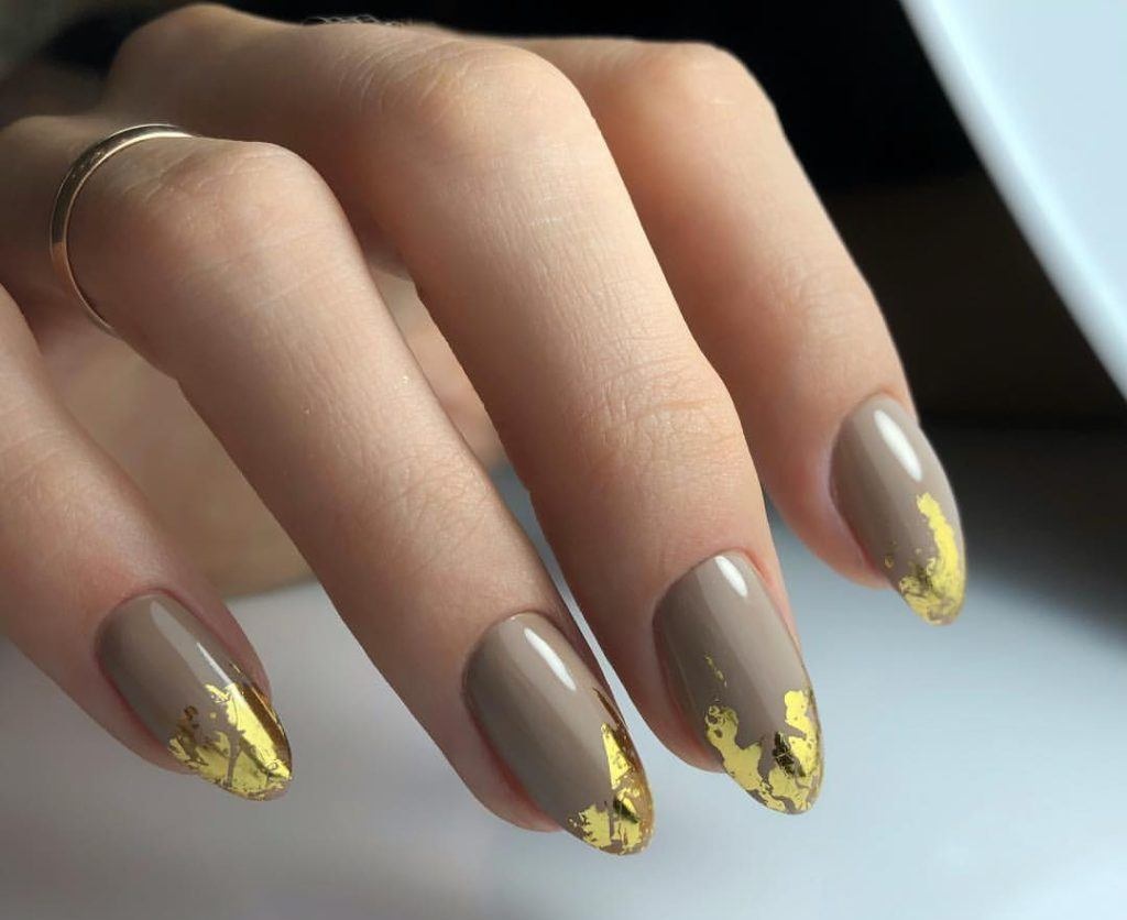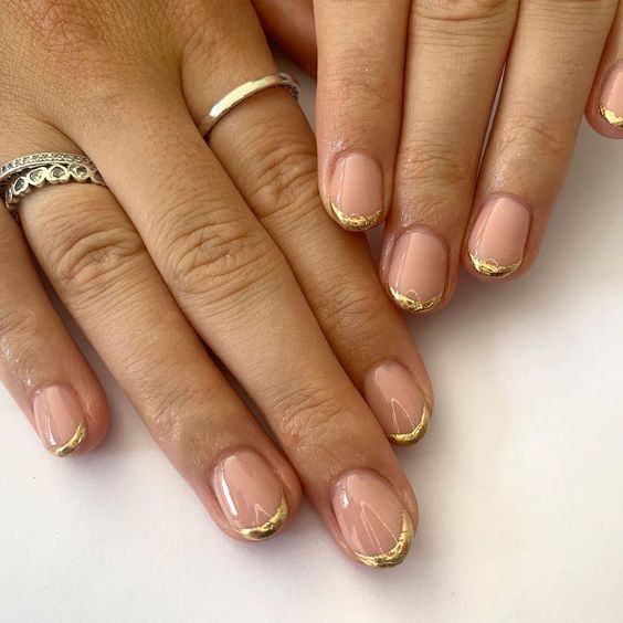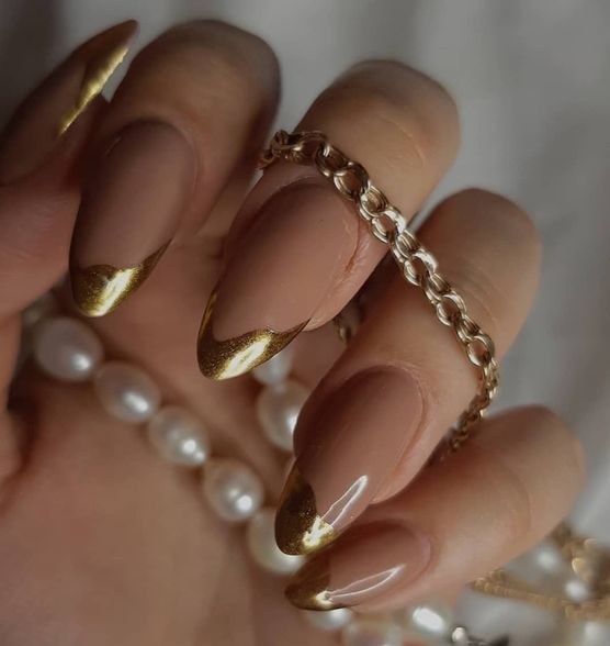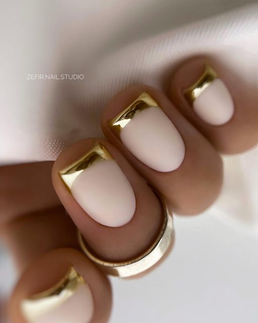 Используйте нюдовый оттенок лака для основы ногтей, а золотой цвет наложите на кончиках, что создаст эффект глубины и контраста.