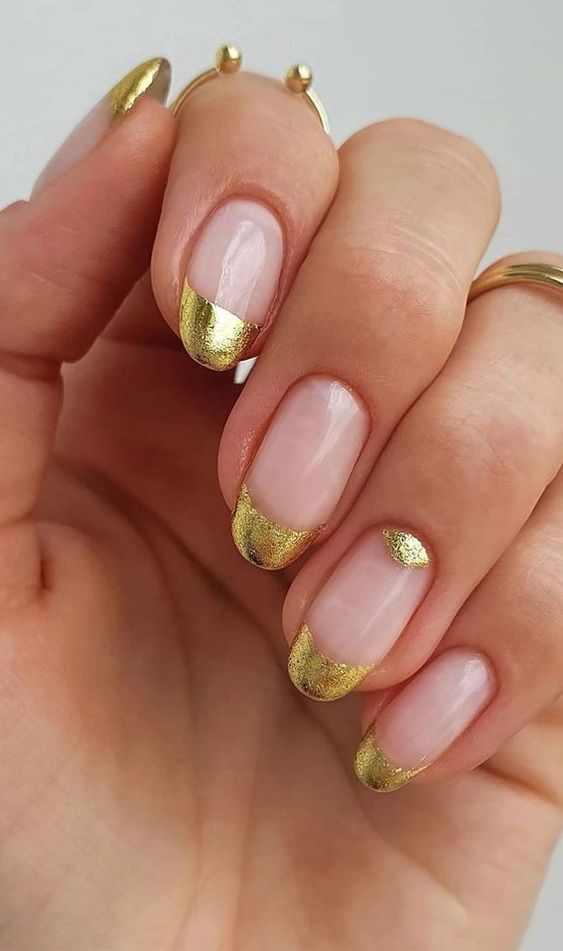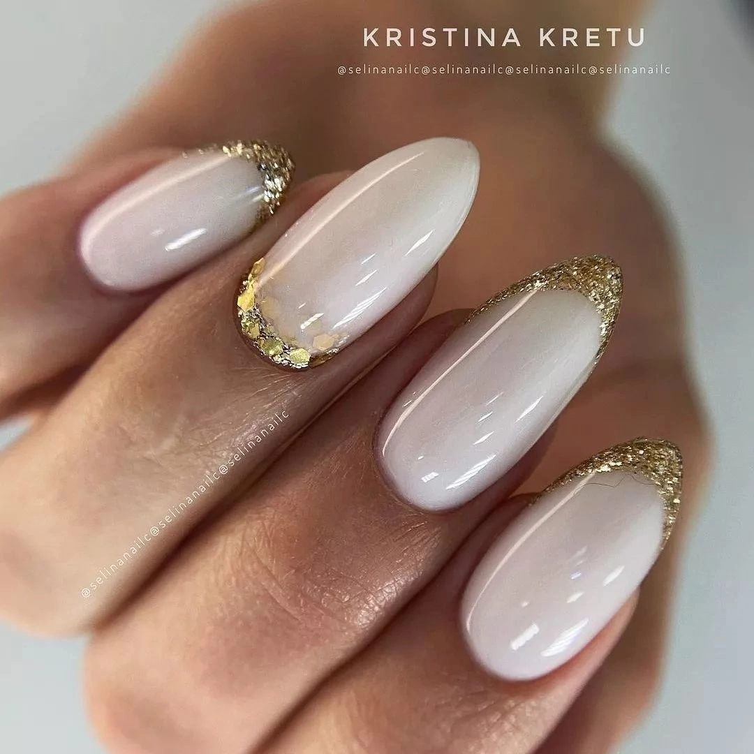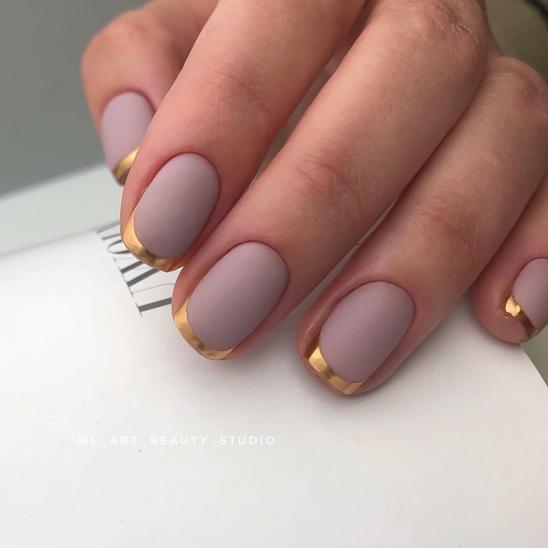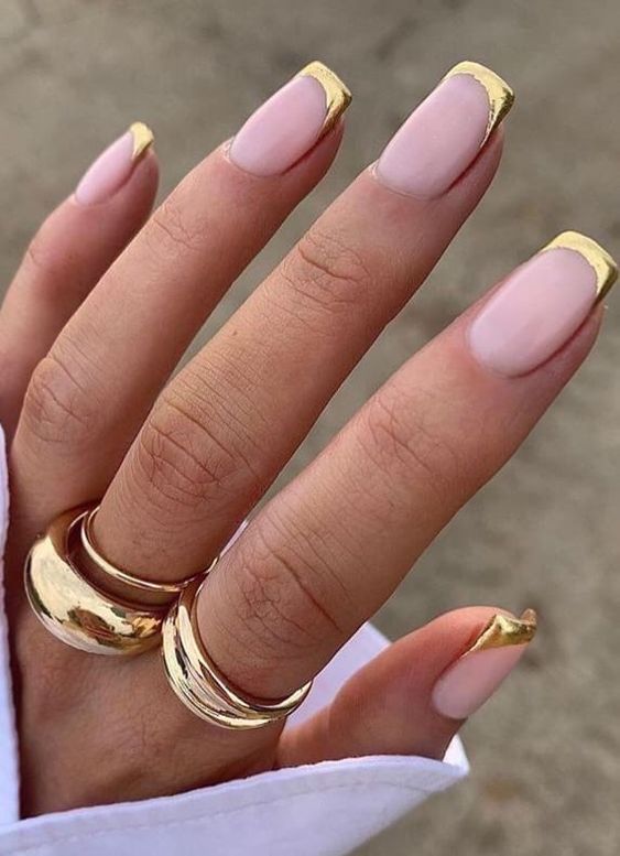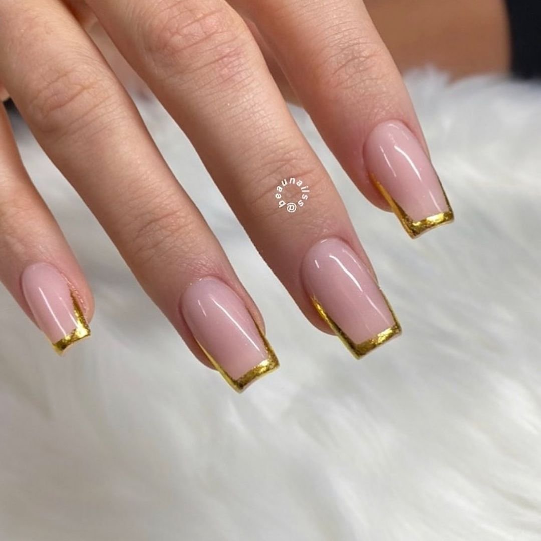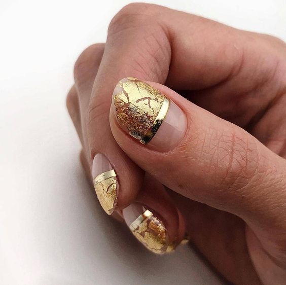 Используйте нюдовый оттенок лака для основы ногтей, а золотой цвет наложите на кончиках, что создаст эффект глубины и контраста.
