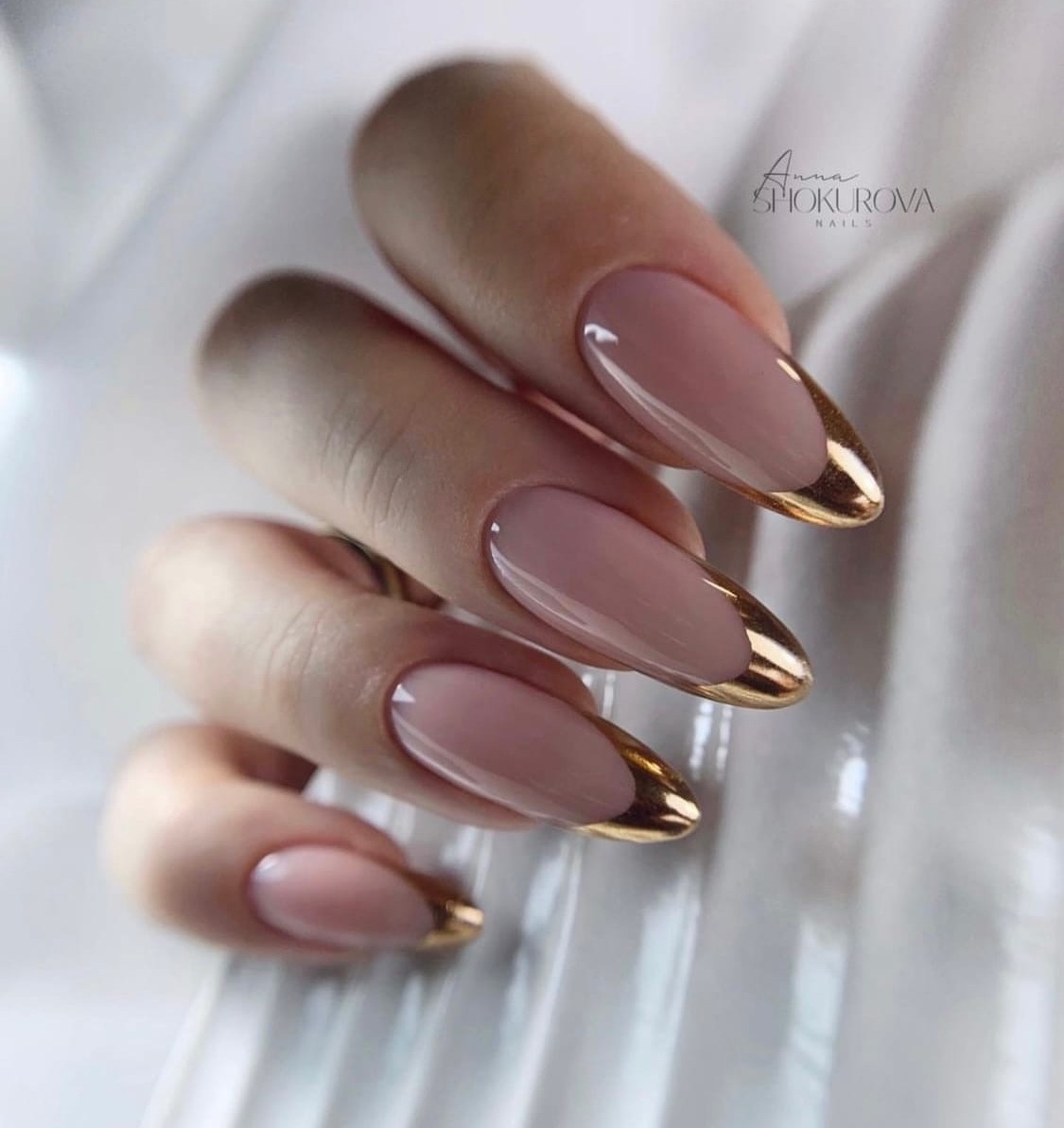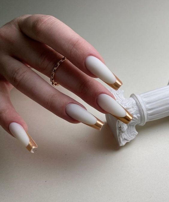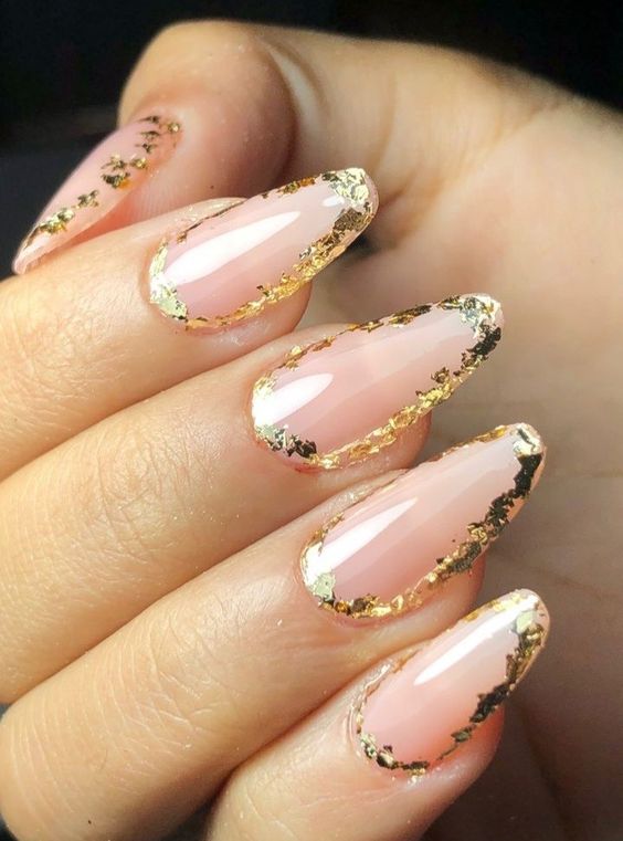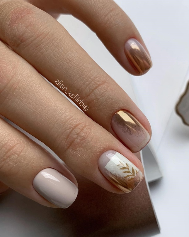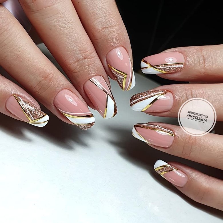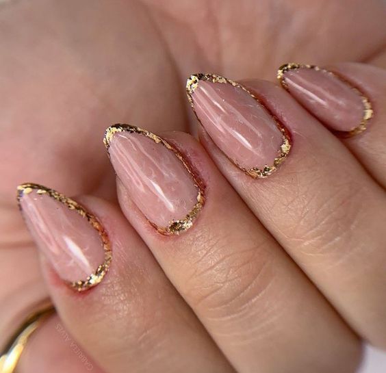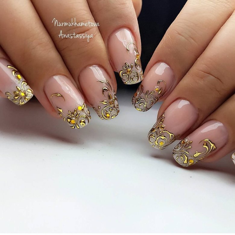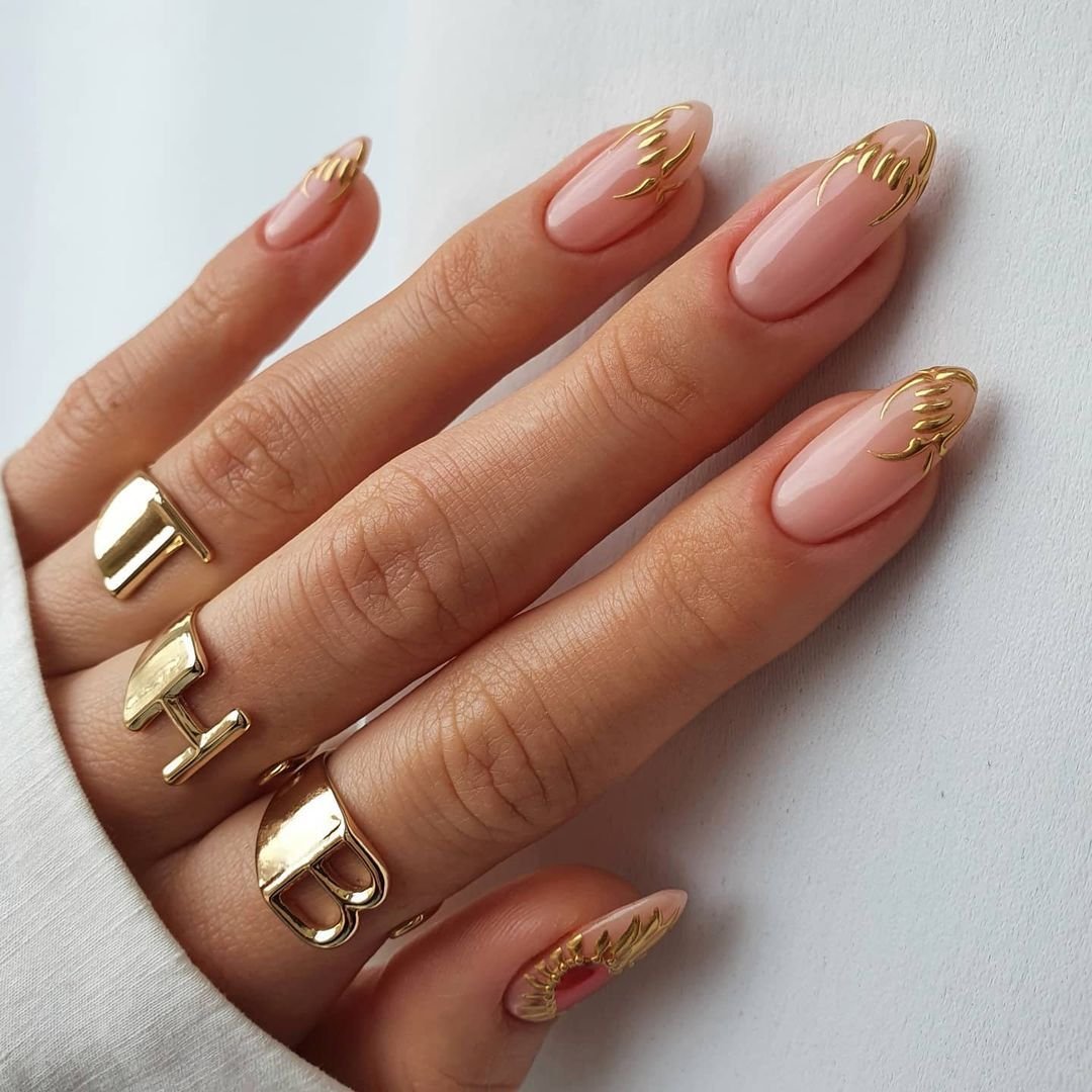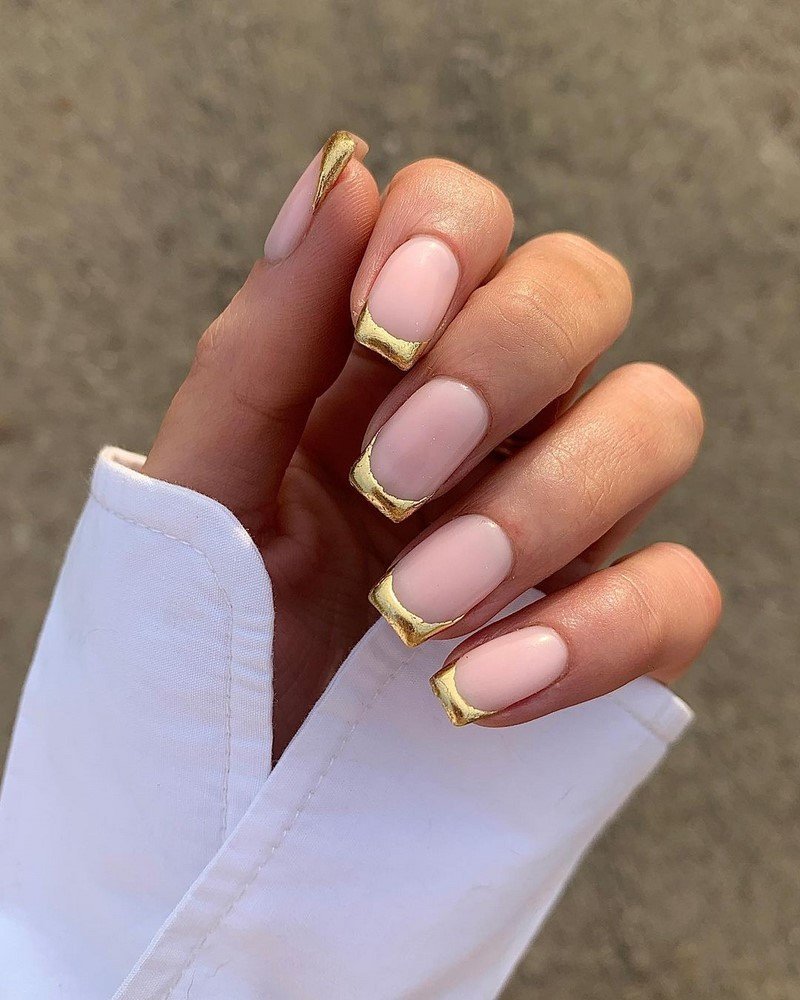 Используйте нюдовый оттенок лака для основы ногтей, а золотой цвет наложите на кончиках, что создаст эффект глубины и контраста.