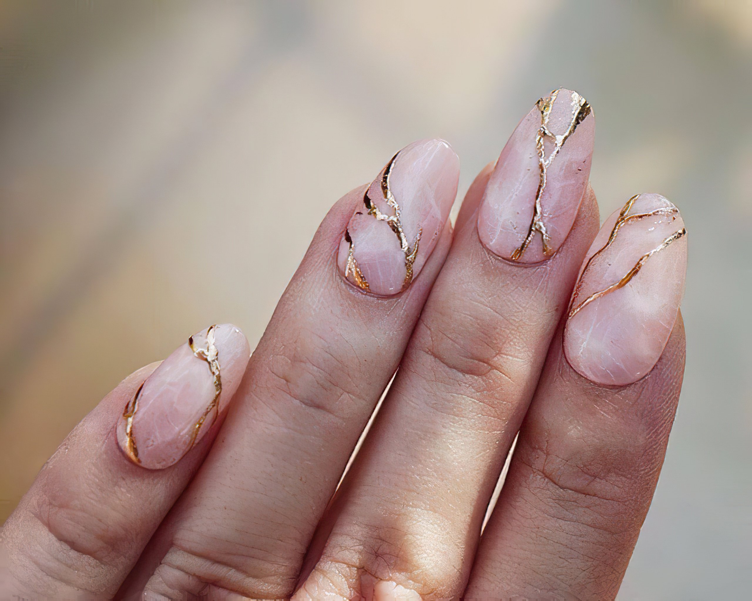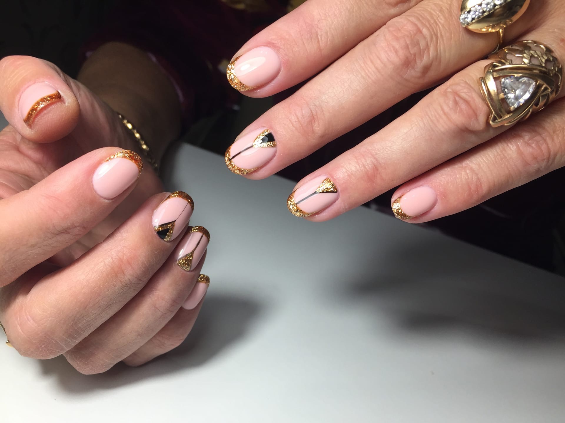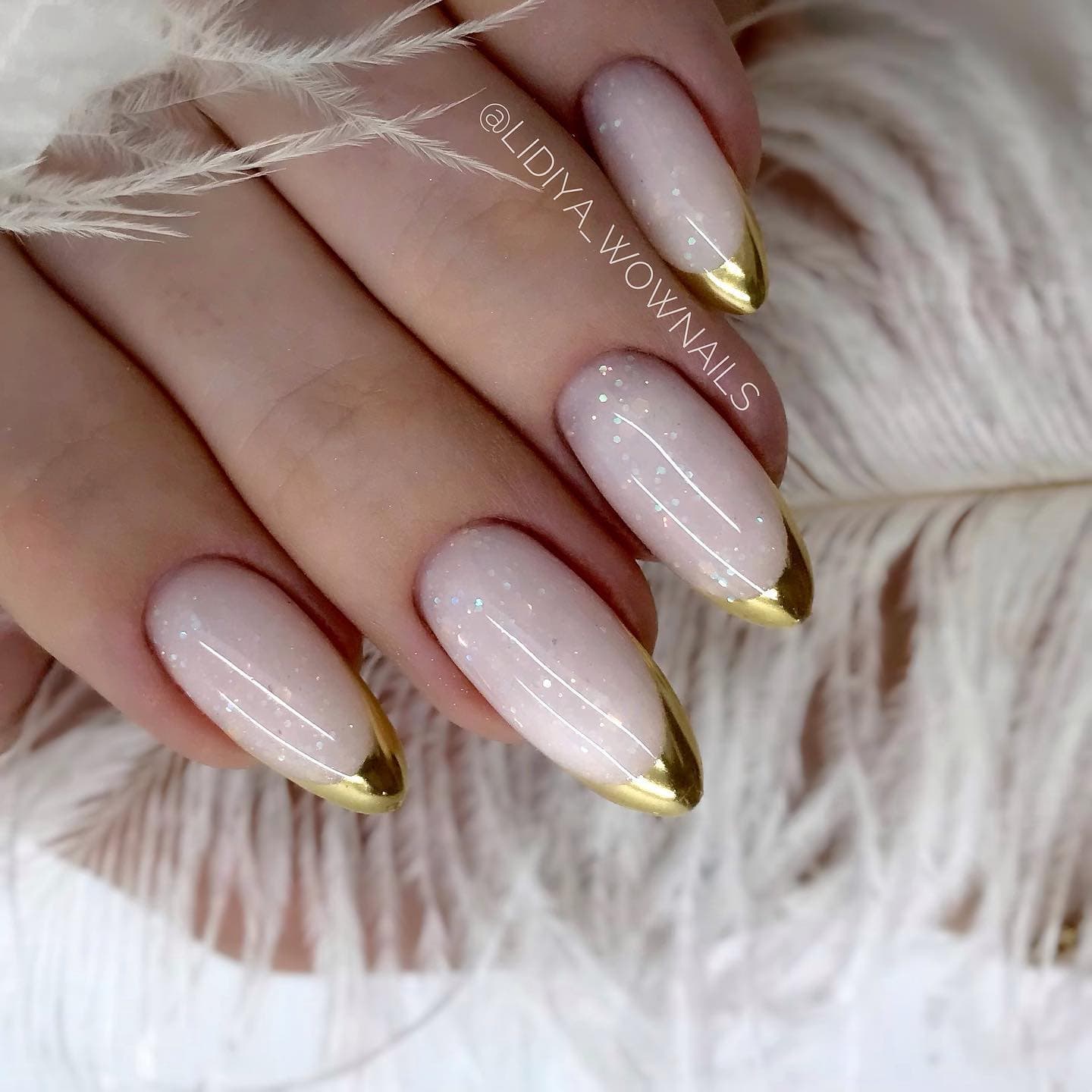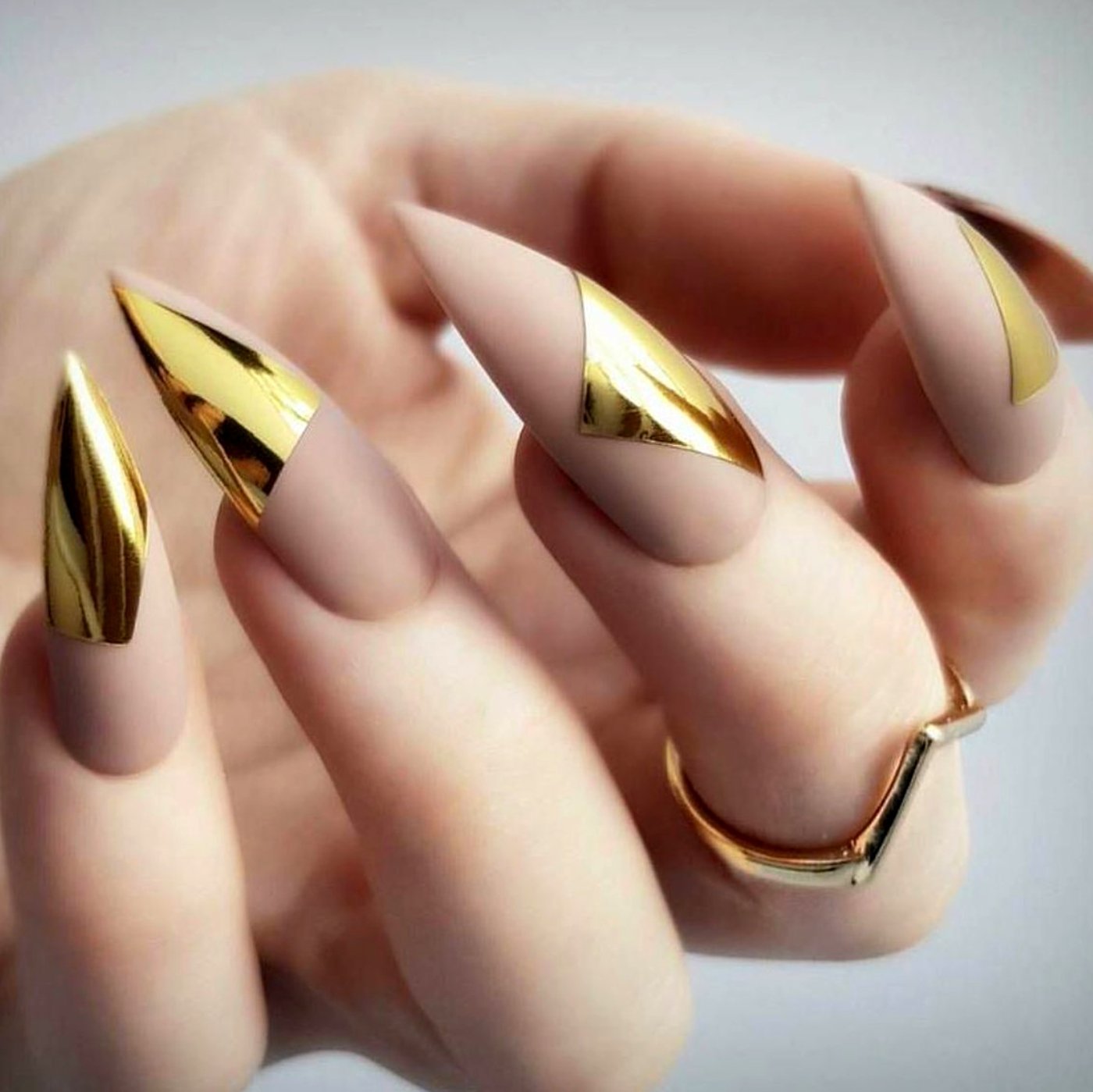 Используйте нюдовый оттенок лака для основы ногтей, а золотой цвет наложите на кончиках, что создаст эффект глубины и контраста.