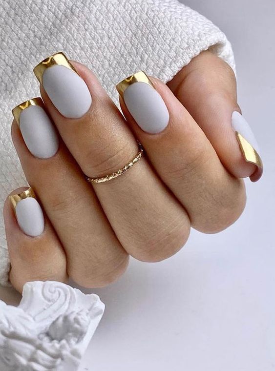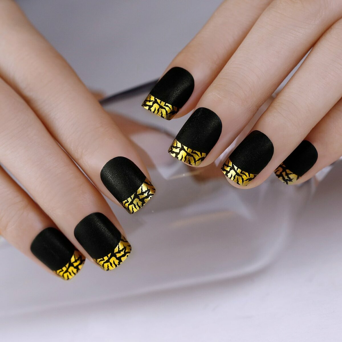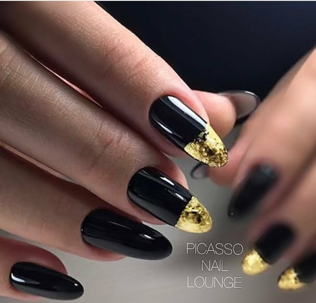 Золотые кончики могут быть сделаны с использованием золотой фольги или гель-лака с эффектом фольги, создавая более насыщенный золотой цвет и глянцевый эффект.