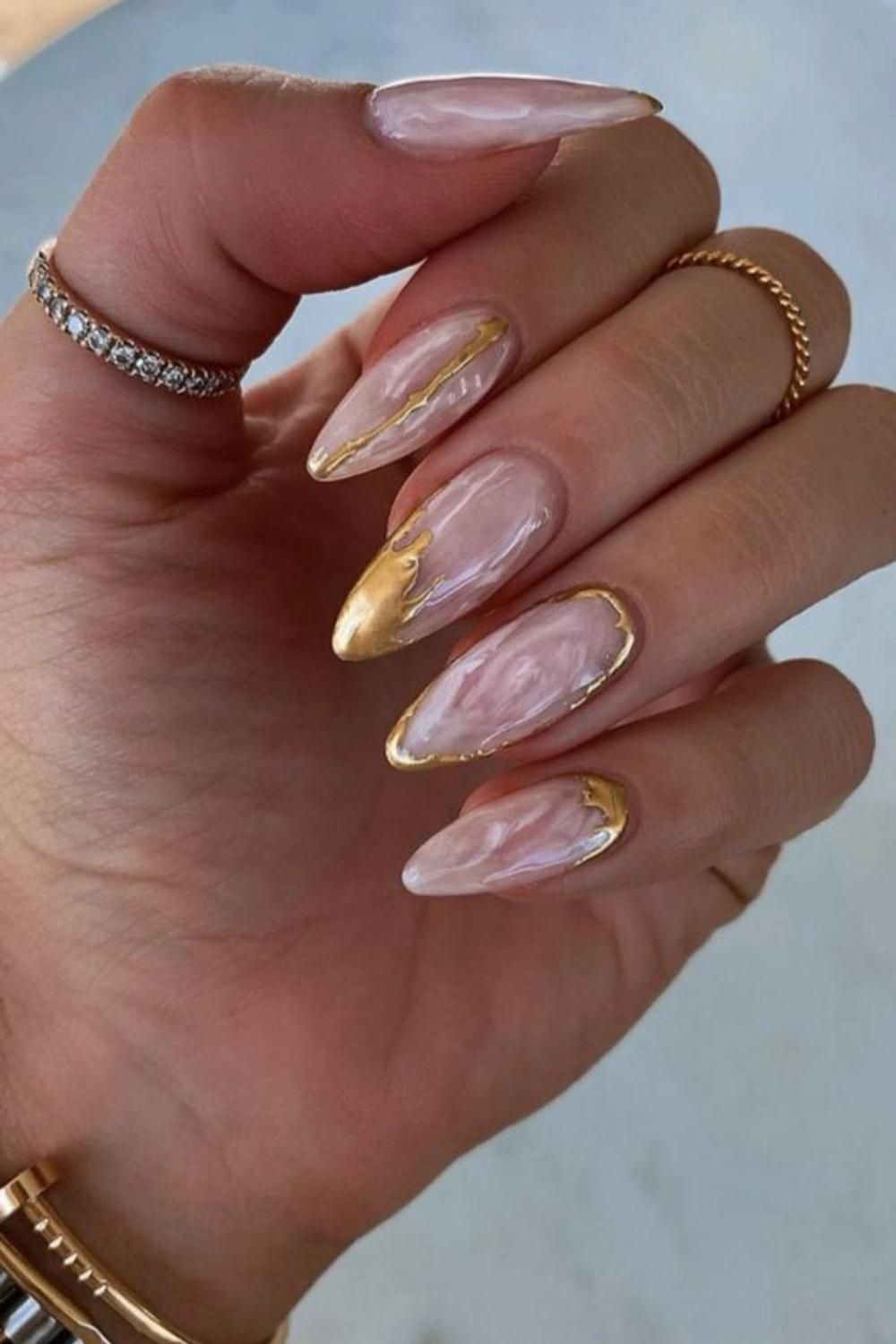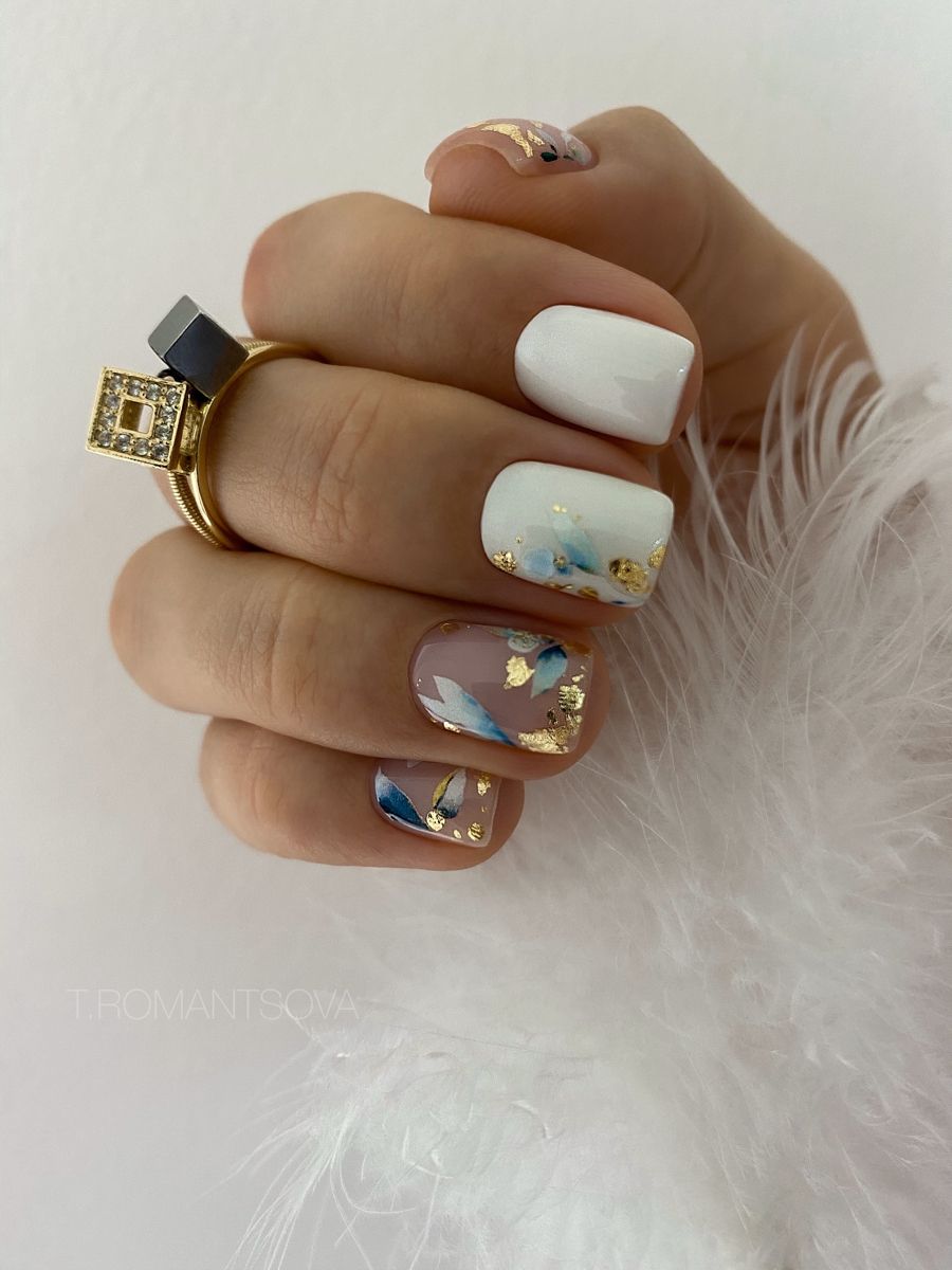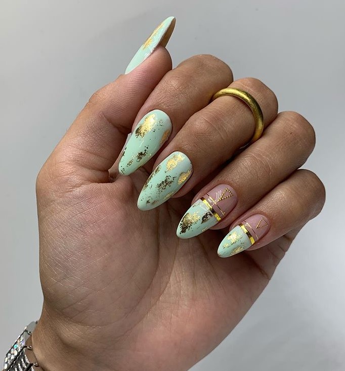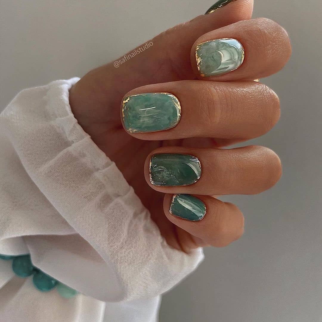 Смешайте золотой лак с другими цветами, чтобы создать мраморный дизайн на кончиках ногтей. Это очень стильно и актуально.